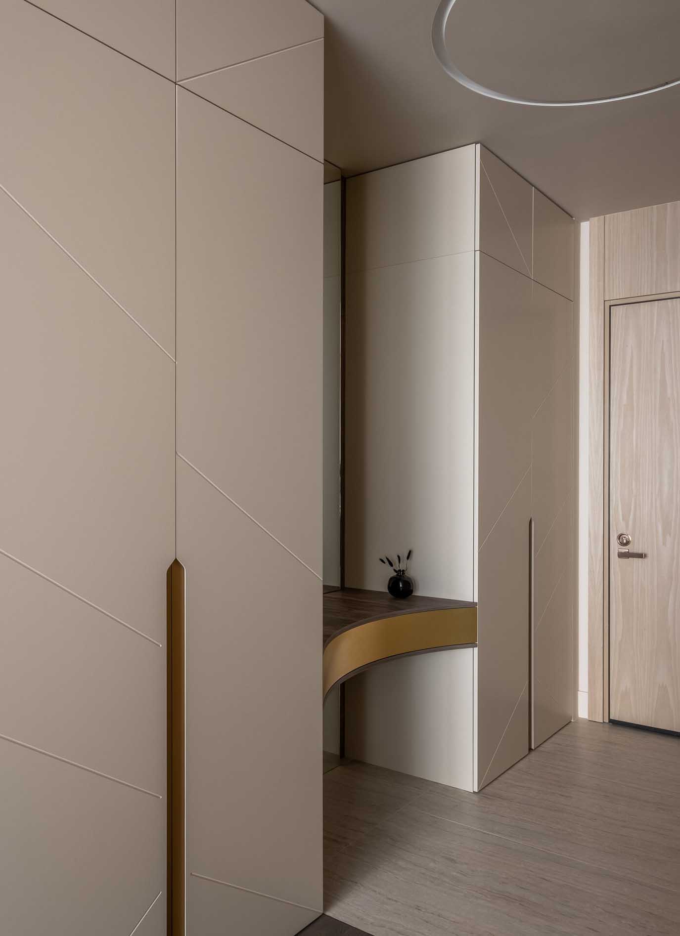 A fal színével megegyező beépített szekrény finoman köti össze az előszobát és a nappalit, a tér zökkenőmentes áramlásának hatását keltve, anélkül, hogy leválasztaná az előszobát. A nagyméretű bútorformákra jellemző monolitikus hatást sikerült részletekkel oldani: a nyitott polcok, valamint egy hatalmas tükör légiességet és ritmust kölcsönöz a kompozíciónak.