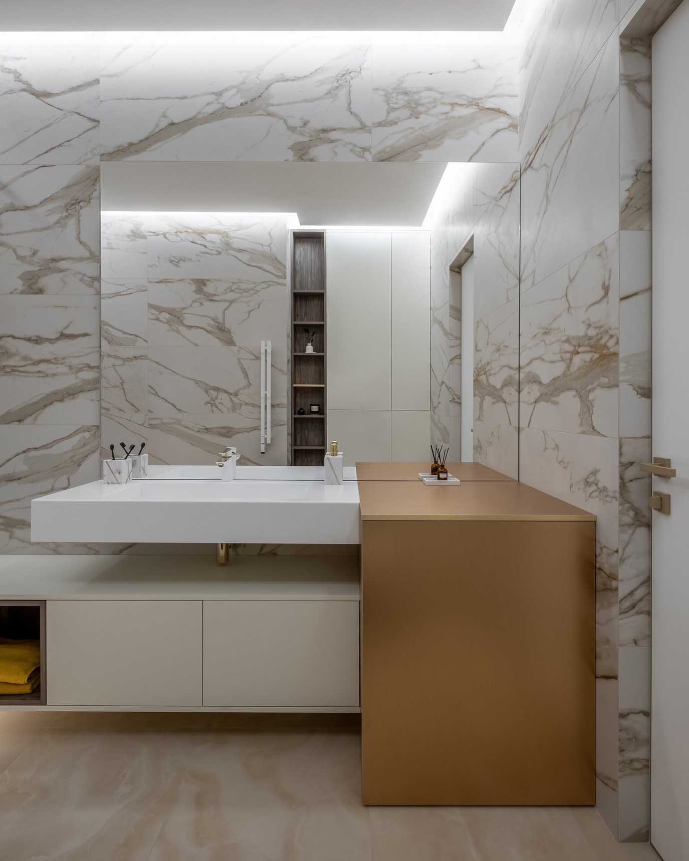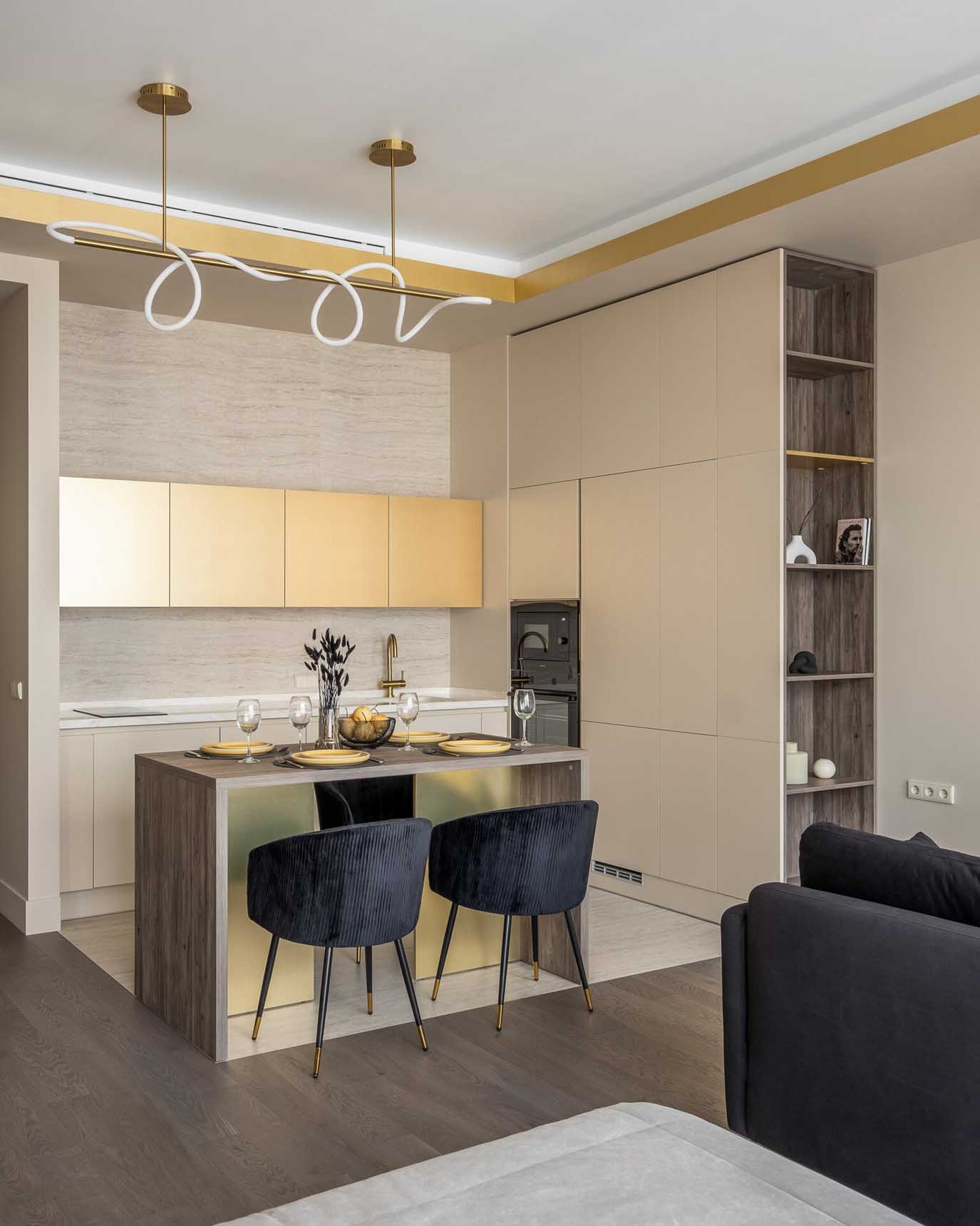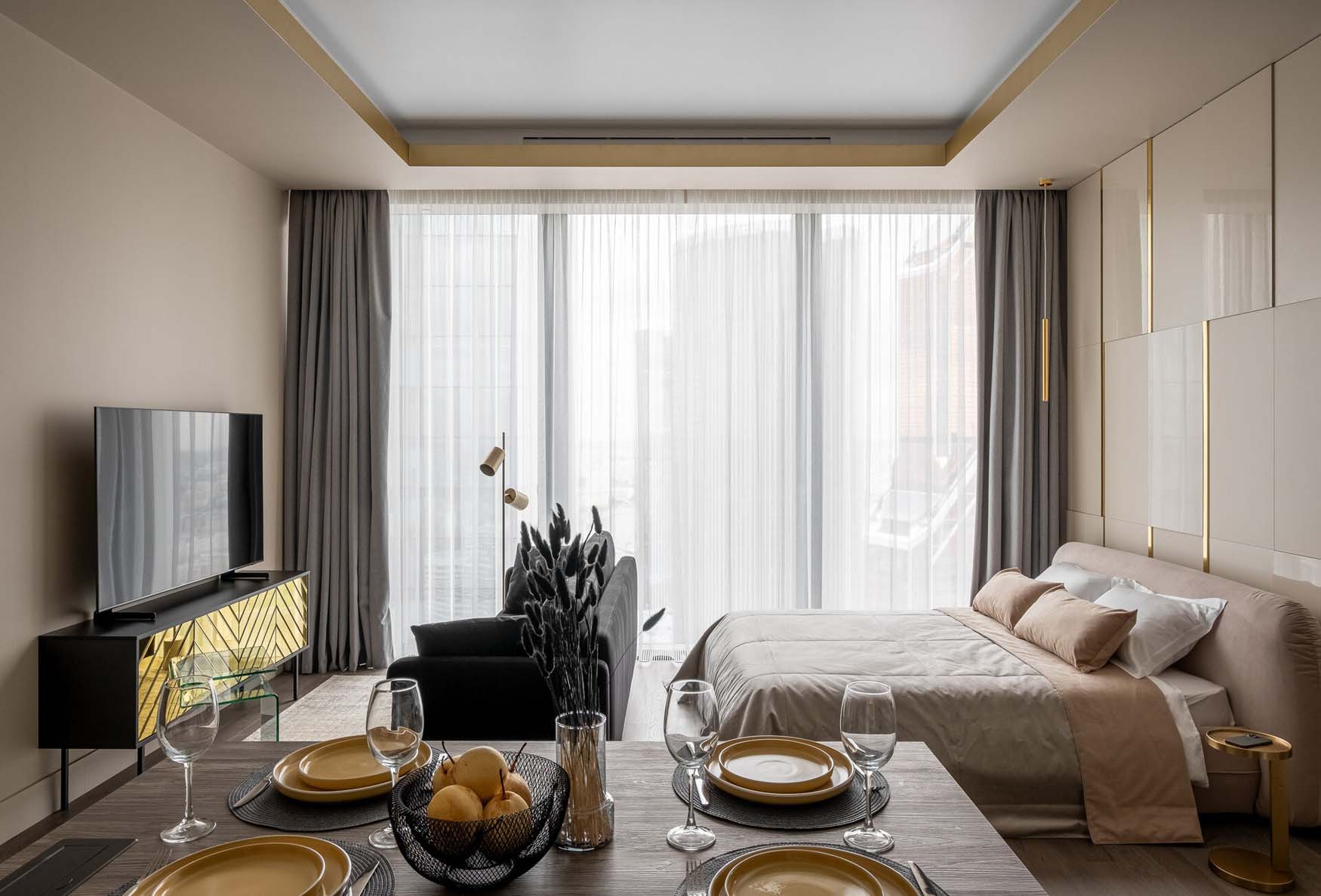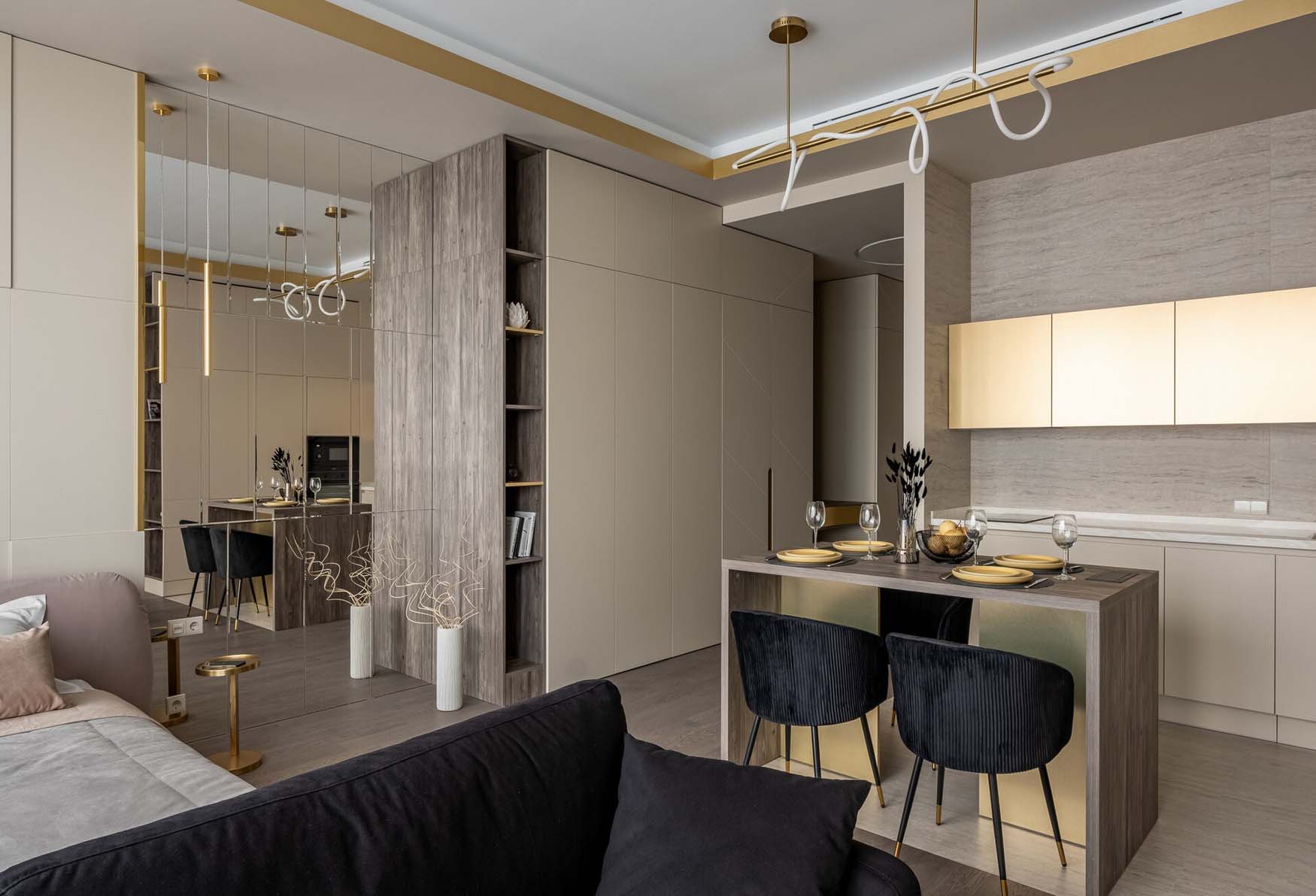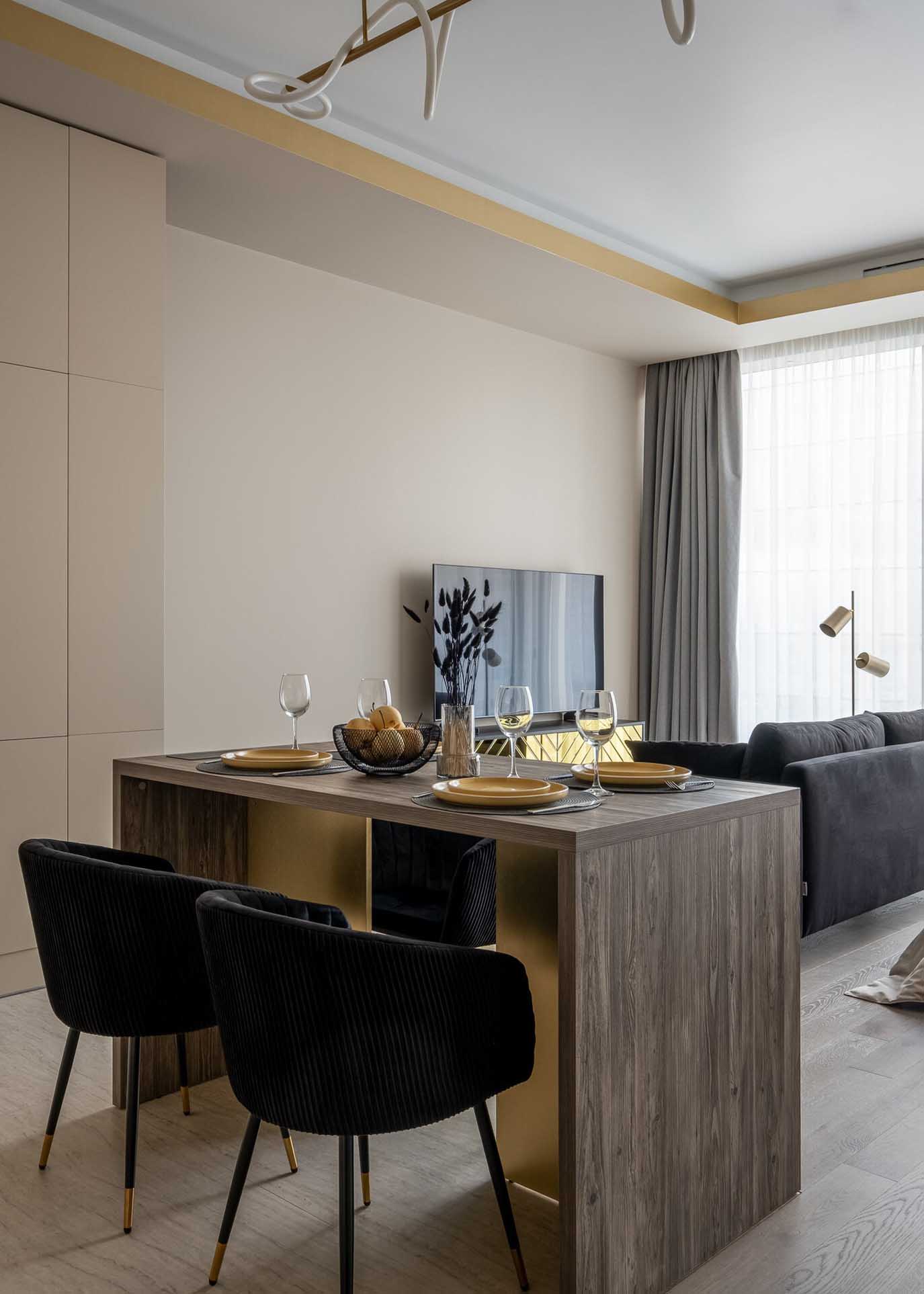 A kis lakás berendezésekor a fő feladat a „visszafogott luxus” koncepciójának megvalósítása volt – egy olyan enteriőré, amely a felsőkategóriás szállodák esztétikáját ötvözi az otthonossággal és kényelemmel. Bemutatunk néhány remek ötletet a projektből.