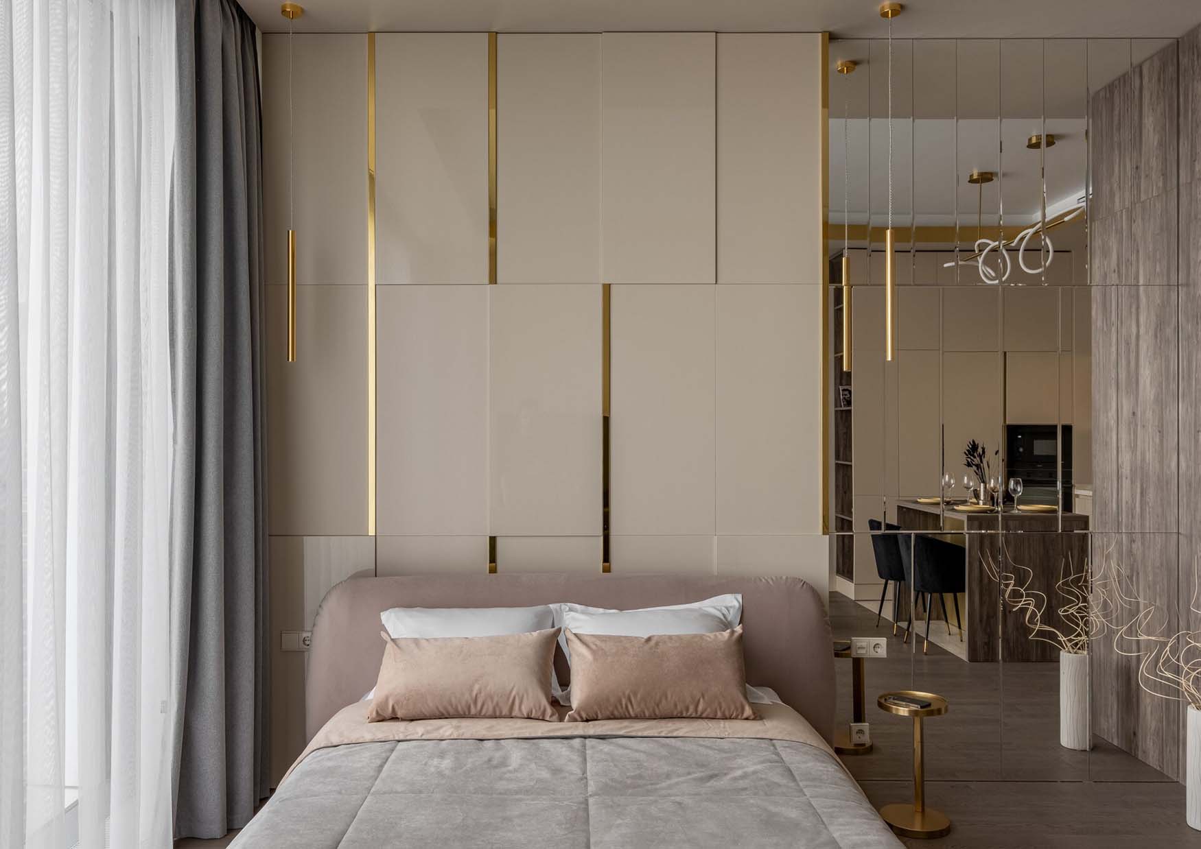 Ez a stúdióapartman nem nagy, de amikor belépünk a helyiségbe, mégsem a szűkösséget, hanem a tágasságot érezzük. Ezt az arányokkal való játékkal lehet elérni. A magas mennyezet, a panorámaablak, a tükörpanel, a mennyezetig érő beépített szekrények és a dinamikus falpanel – ezek az elemek tágasabbnak éreztetik a teret, mint amekkora valójában.