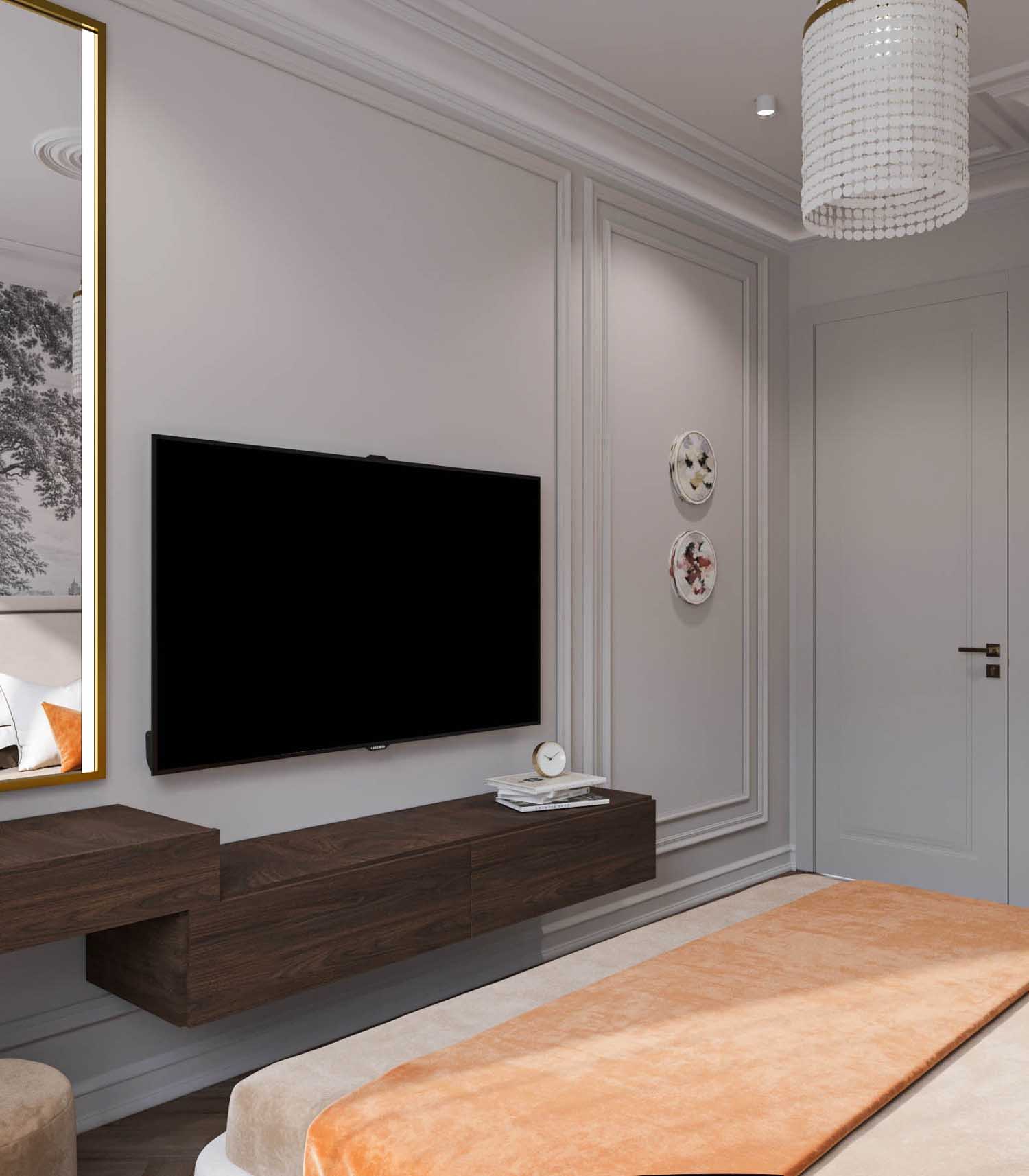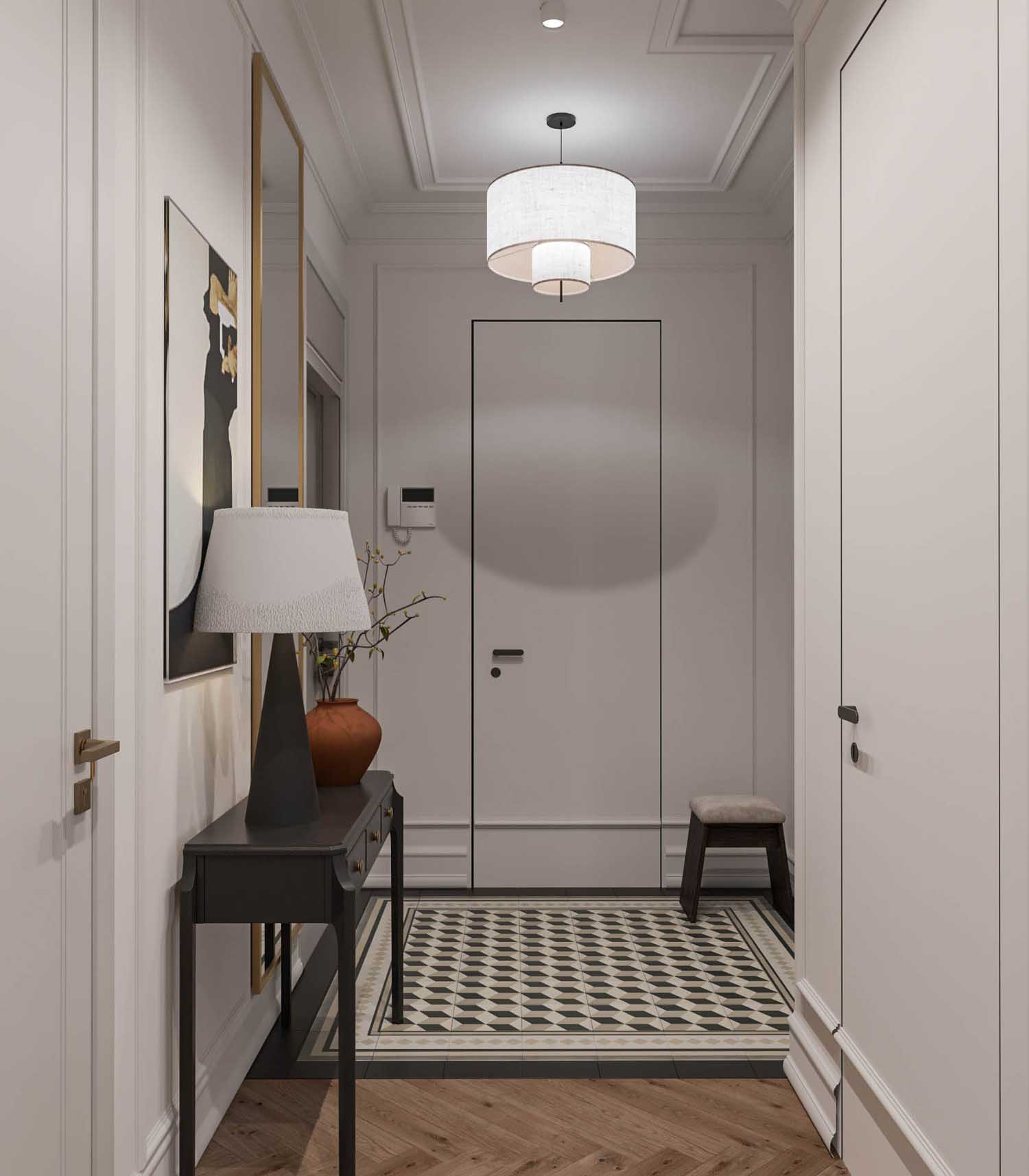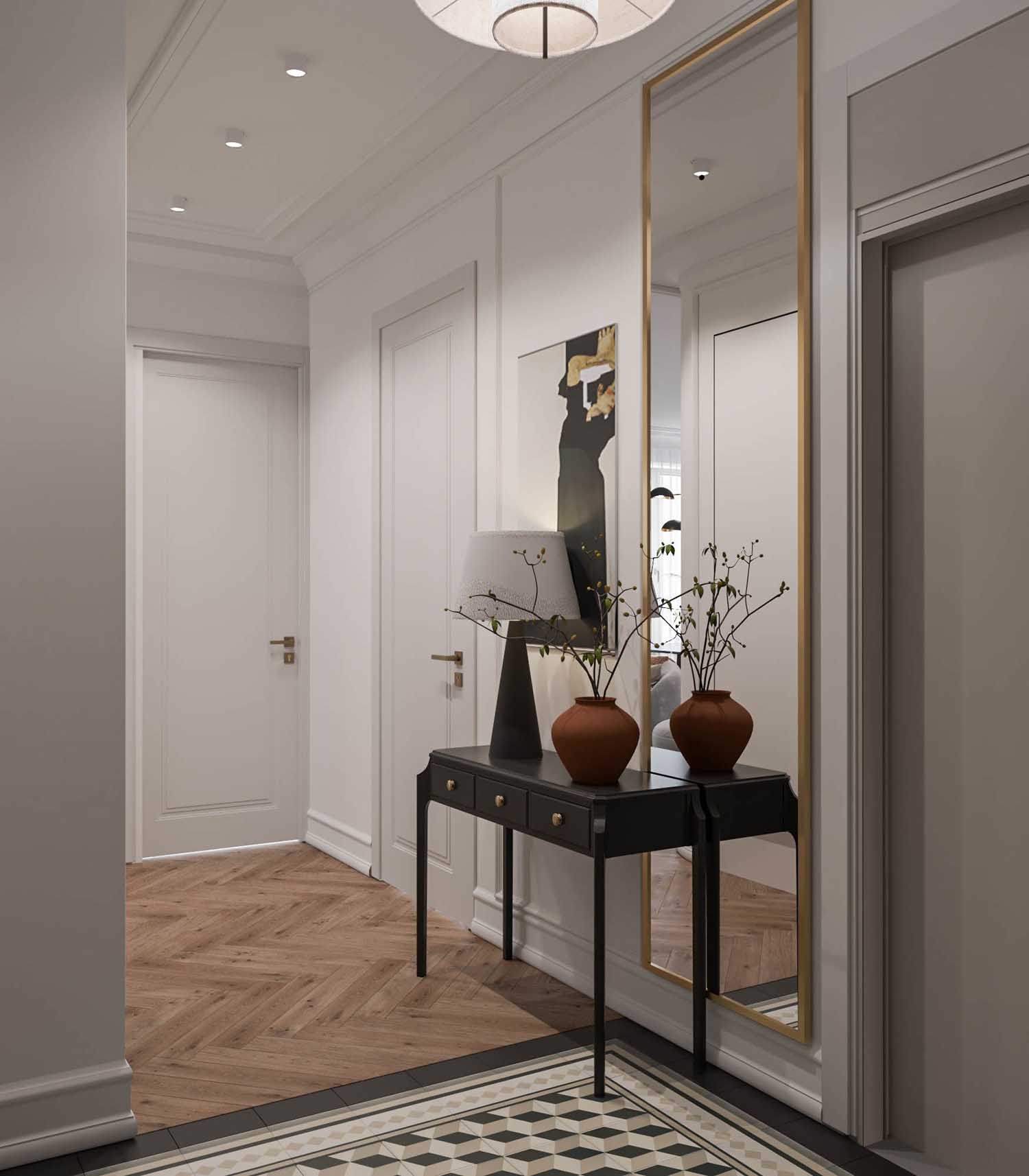 Függőleges hangsúlyok: Egy keskenyebb előtérben érdemes a magasságot kihasználni. Egy magas, keskeny tükör és egy karcsú konzolasztal nemcsak funkcionális (kulcsok, posta tárolása), de optikailag nyújtja is a helyiséget. A szokványosnál magasabb beltéri is ajtók is ezt hangsúlyozzák – ebben a lakásban ezzel összhangban a bejárati ajtót is magasabbnak mutatják.