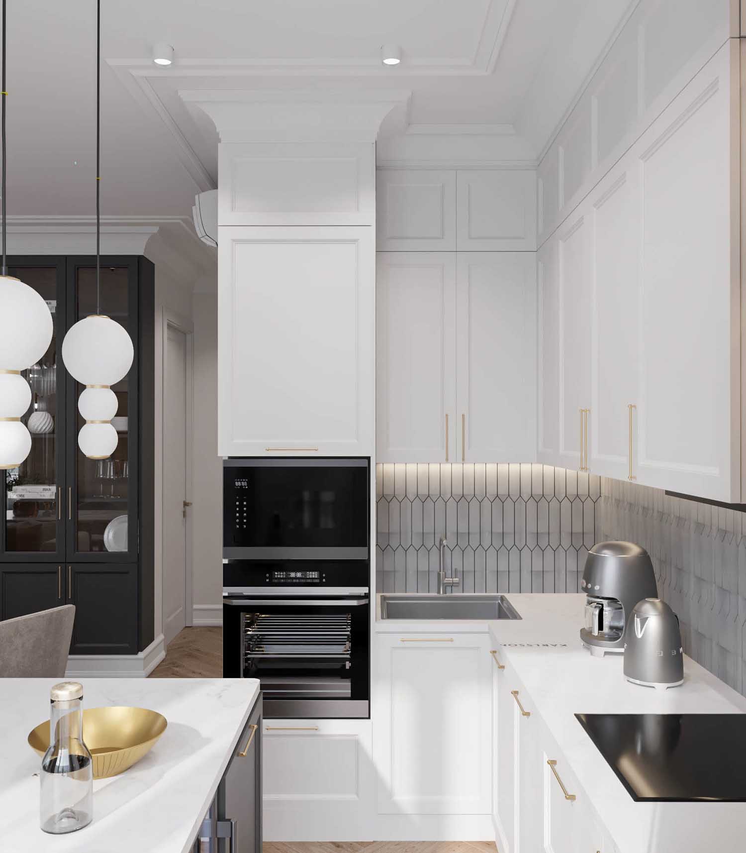 Hátfal mint dizájnelem: A semleges, fehér konyhabútor monotóniáját megtöri a különleges formájú, sötétebb tónusú csempe hátfal. Ez a megoldás karaktert ad a konyhának anélkül, hogy vibráló színeket kellene használni.