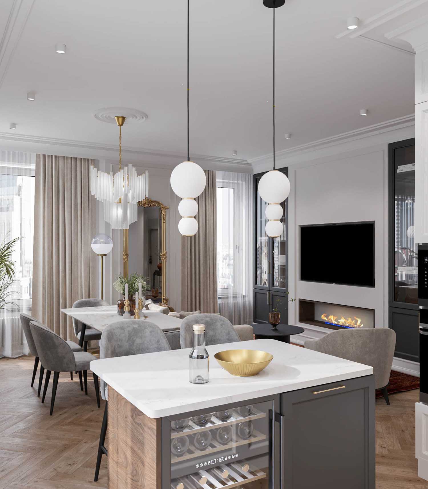Konyhasziget mint multifunkciós elem: A korlátozott alapterület ellenére beillesztett konyhasziget nemcsak a munkafelületet növeli meg drasztikusan, de reggelizőpultként és a konyha természetes határaként is szolgál a nyitott térben. A társasági életet is élénkítő elem – főzés közben ide is leülhetnek a családtagok és vendégek. A nagyobb étkezésekhez hatszemélyes étkezőasztalt is elhelyeztek.