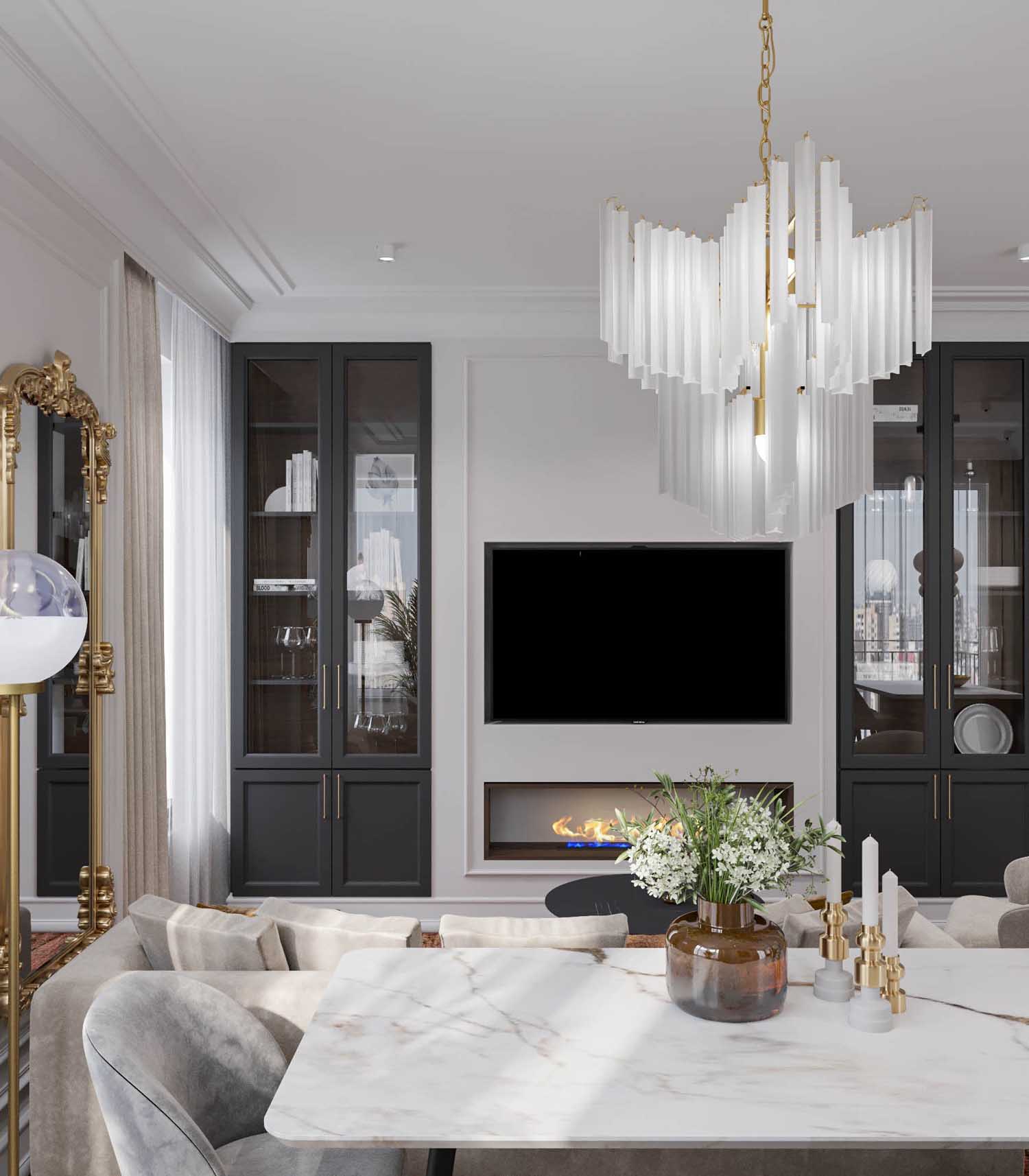Világítás rétegzése: A tér általános hangulatát a különböző típusú világítótestek adják meg. Az étkezőasztal feletti hangsúlyos dizájncsillár mellett a nappali részben állólámpa és a biokandallóval is felszerelt TV-zóna melletti polcok rejtett világítása gondoskodik a variálható atmoszféráról.