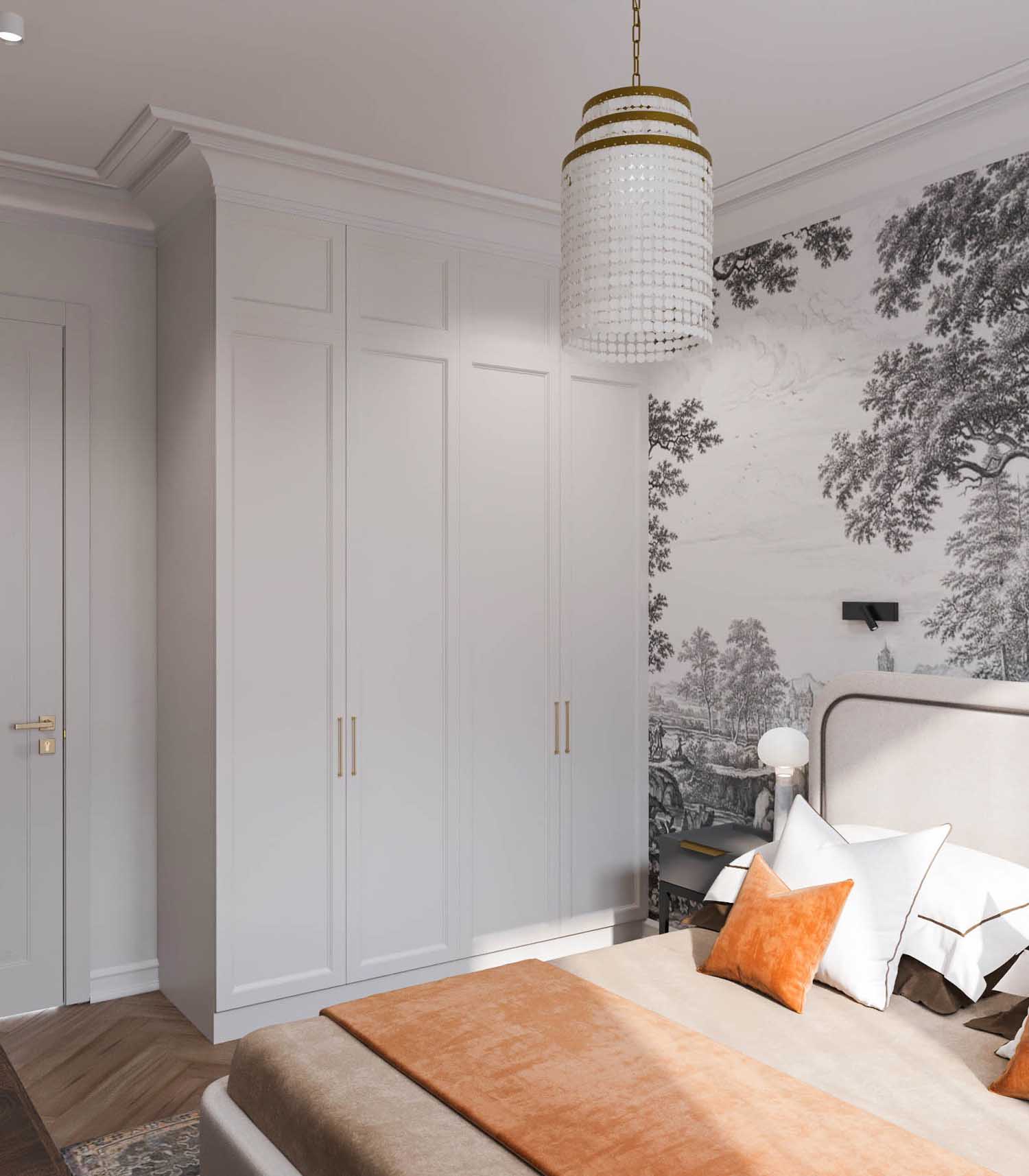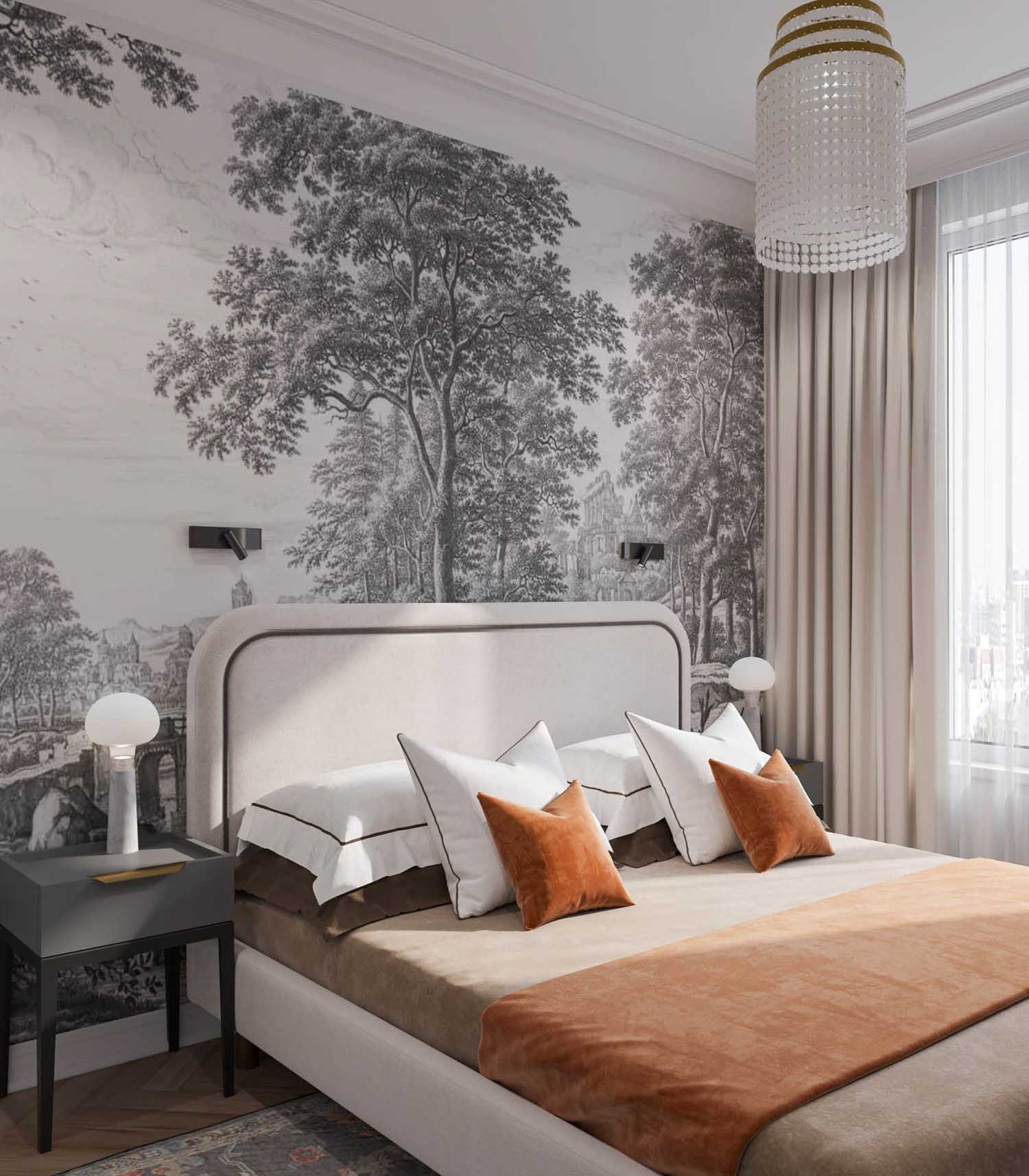Fókuszpont a falon: Egy teljes falat beborító, mégis visszafogott színvilágú, grafikus fotótapéta (a képen egy tájkép) drámai hatást kelt, és mélységet ad a szobának. A tapéta stílusa meghatározza az egész hálószoba hangulatát.