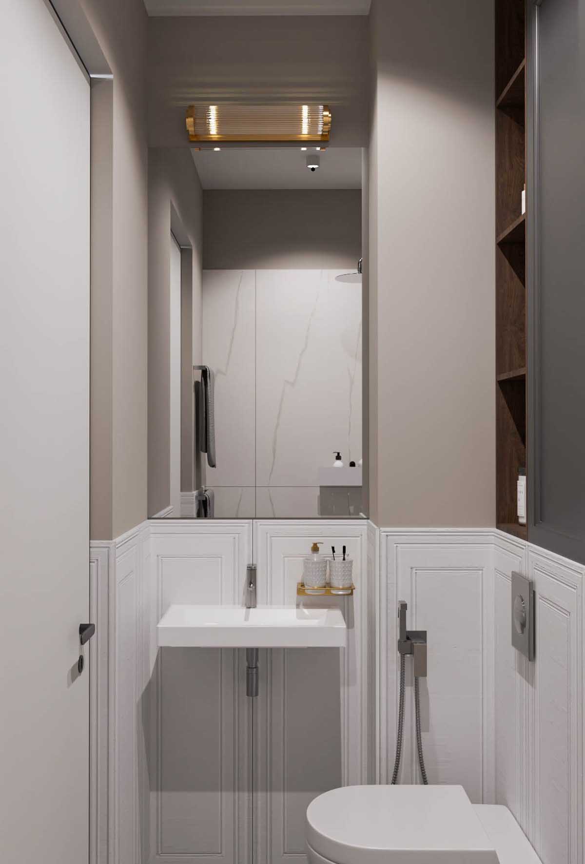 Falsíkok tagolása: Az alsó zónában alkalmazott klasszikus falburkolat és a felette lévő sima festett falfelület kombinációja optikailag szélesíti a keskeny helyiséget.