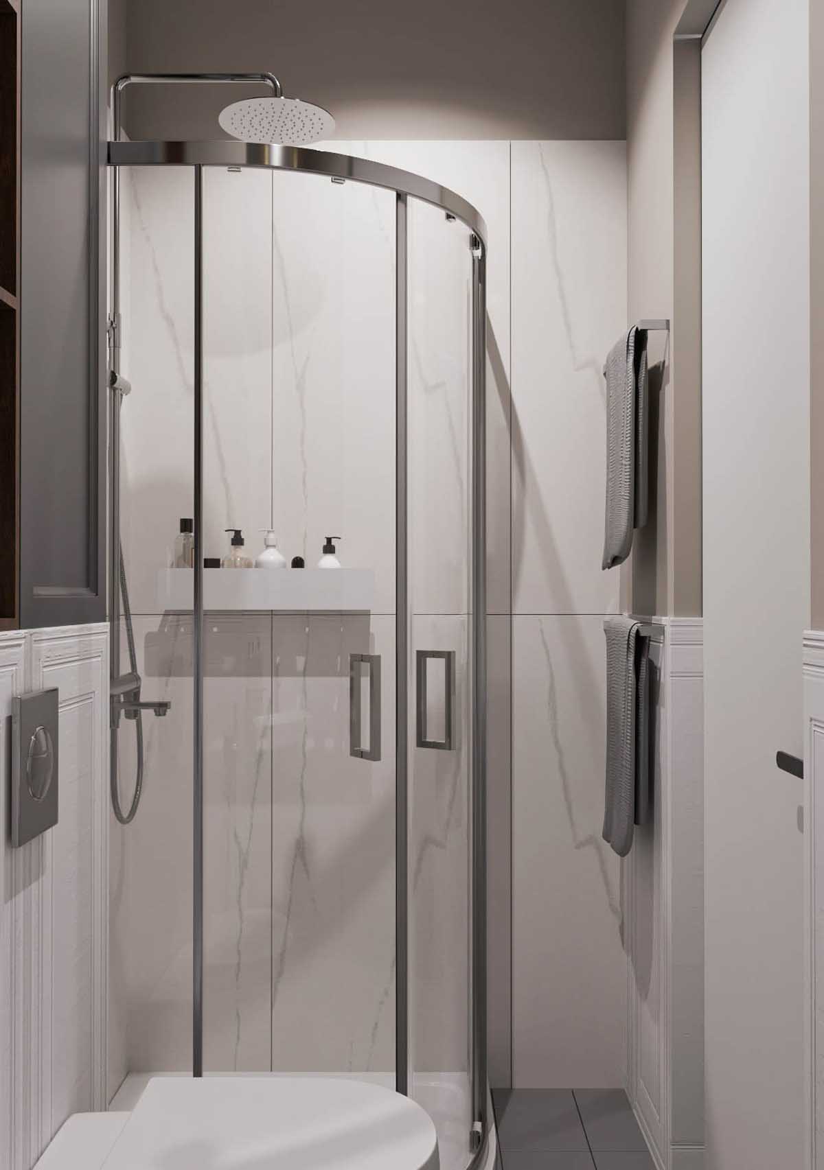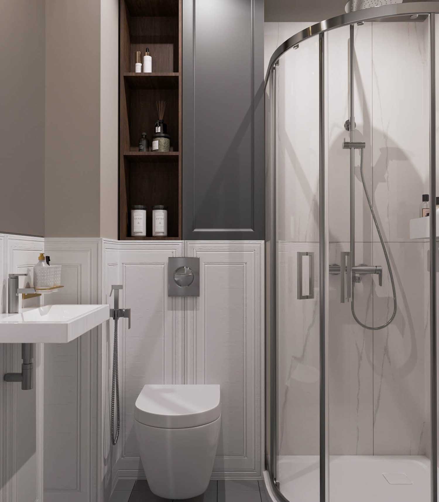 Kompakt megoldások: Kis alapterületen minden centiméter számít. Egy falra szerelt, keskeny mosdó, a helytakarékos, íves zuhanyfülke és a falba süllyesztett WC-tartály fölött kialakított tárolóhelyek maximális helykihasználást tesznek lehetővé.