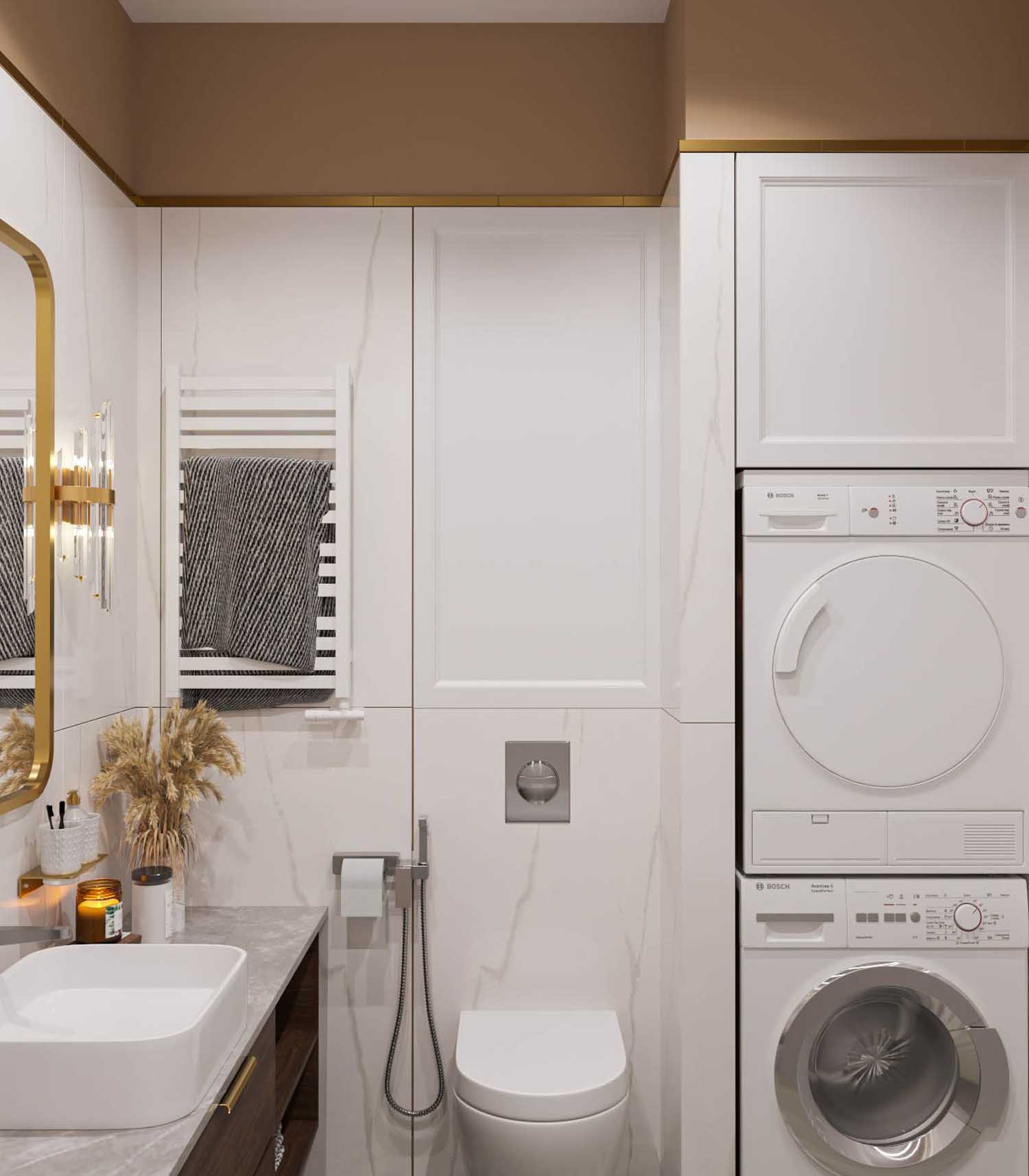 Mosógép elhelyezése: A fürdőszobai gépek (mosó- és szárítógép) beépített szekrénybe rendezése egységes, tiszta látványt eredményez.