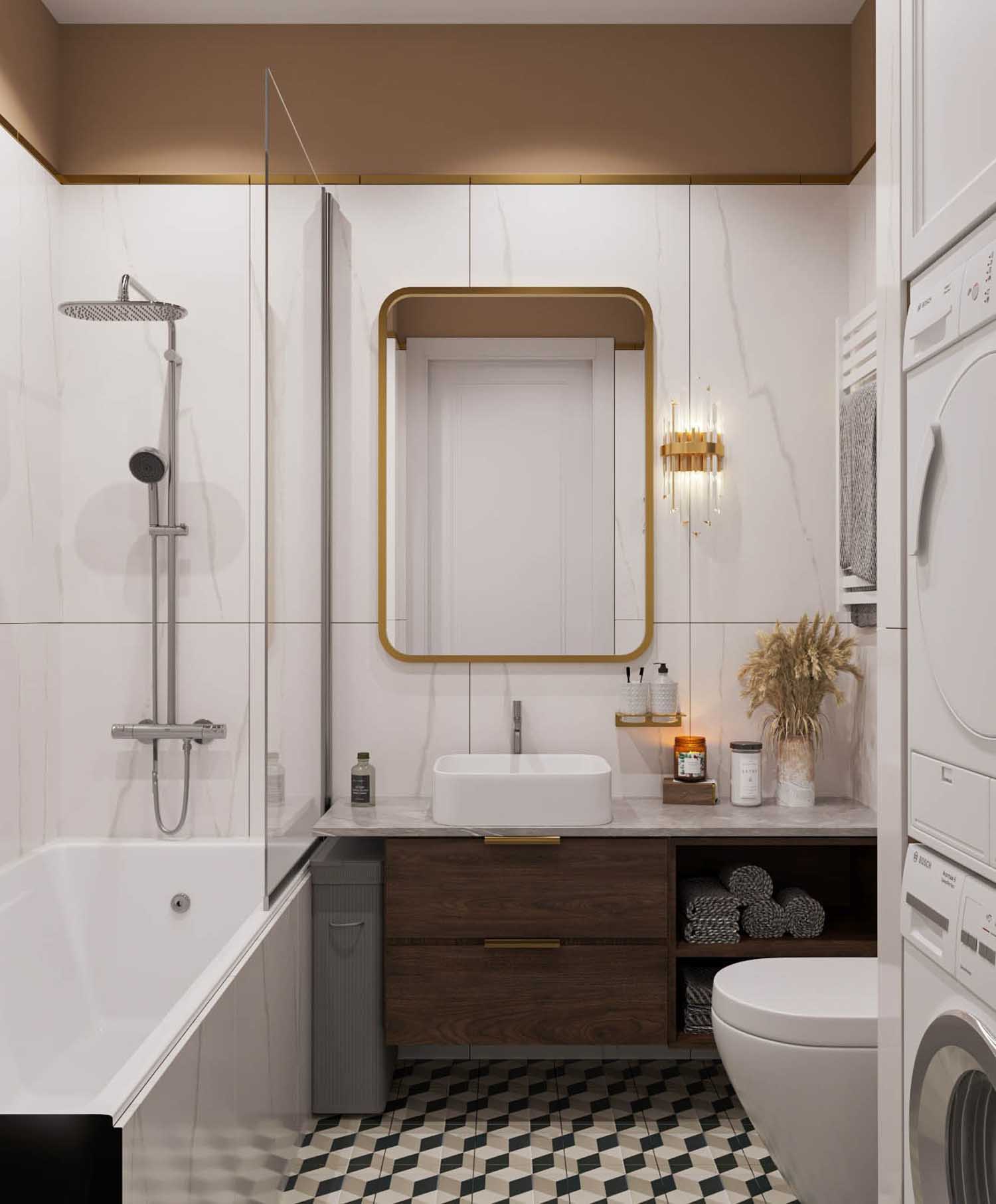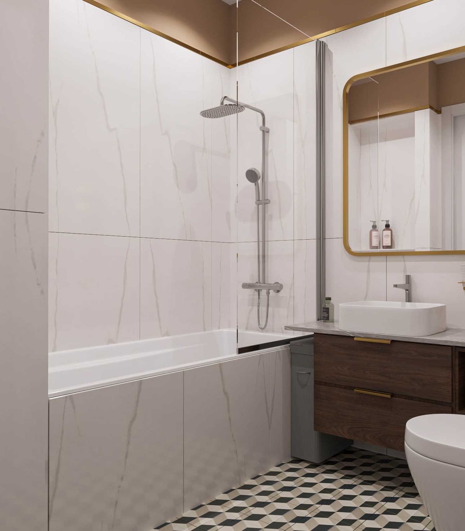 Kontrasztos padló: A nagyméretű, világos márványmintás falburkolat és a geometrikus, fekete-fehér-bézs padlólap kontrasztja dinamikát visz a térbe, míg az arany és fa részletek (tükörkeret, bútor) melegséget sugároznak.