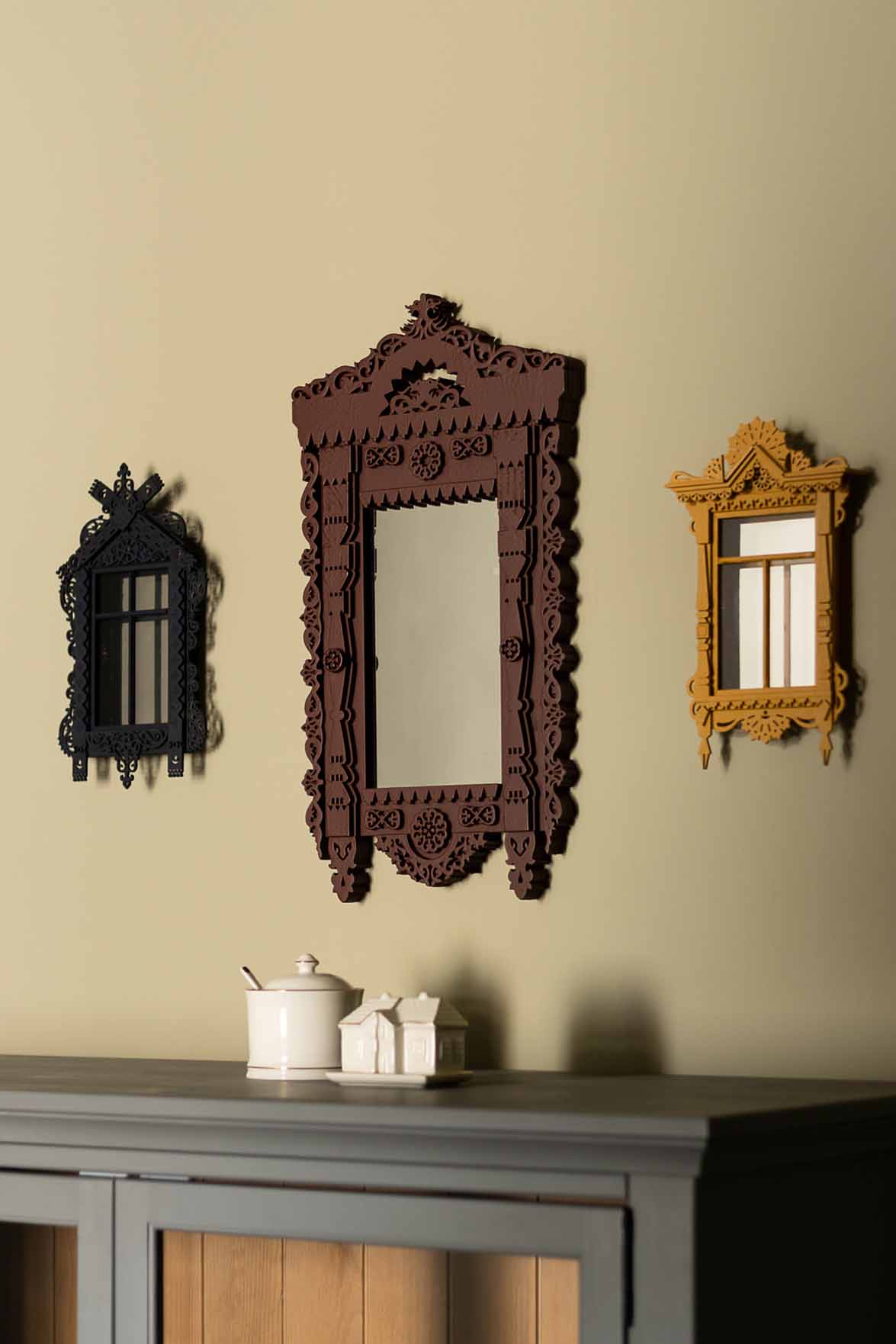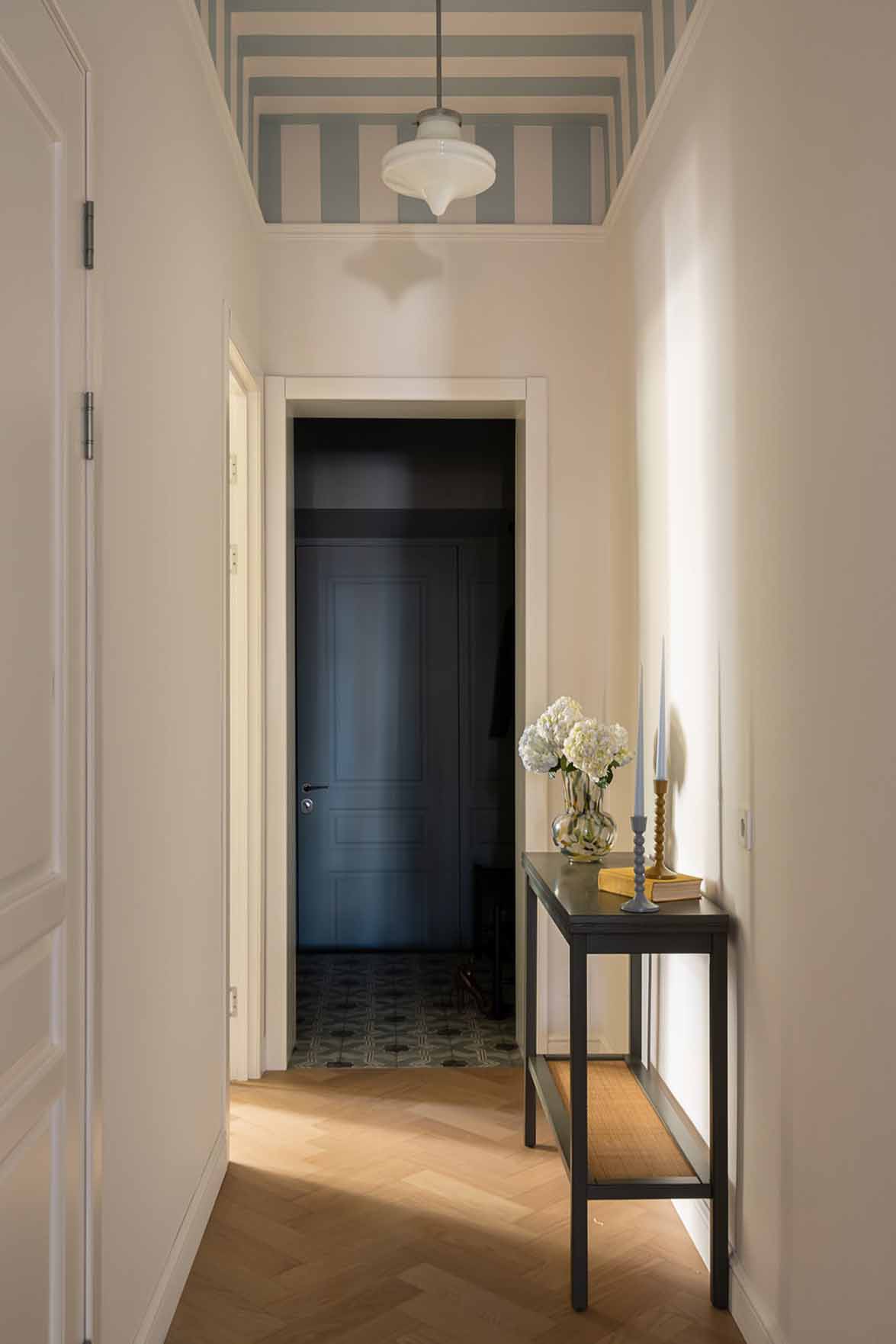 Az előszoba padlóján egy építészeti adottságból erényt kovácsoltak: a bejárati szintkülönbséget egy feltűnő, tarka kőburkolattal emelték ki, amely nemcsak esztétikus, de a biztonságos közlekedést is szolgálja. Ezzel a mintázattal harmonizál a mennyezetre és a falak felső szakaszára futtatott, széles csíkos tapéta, amely optikailag tovább növeli a teret. A helyiség központi dekorációs eleme egy különleges, alumínium keretbe foglalt vintage tükör, amely egy szerencsés véletlen folytán került a tulajdonoshoz, és formájával izgalmas kontrasztot alkot a klasszikus környezettel.
