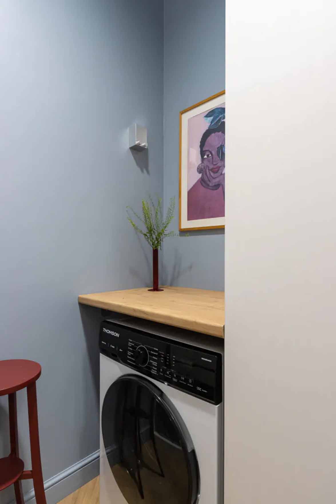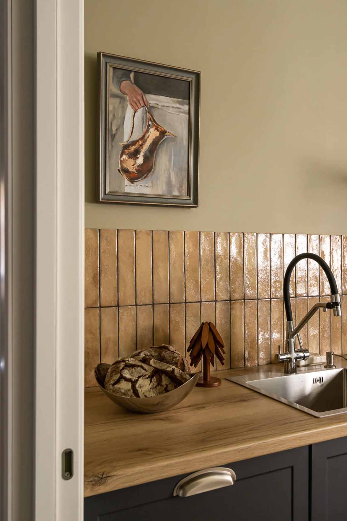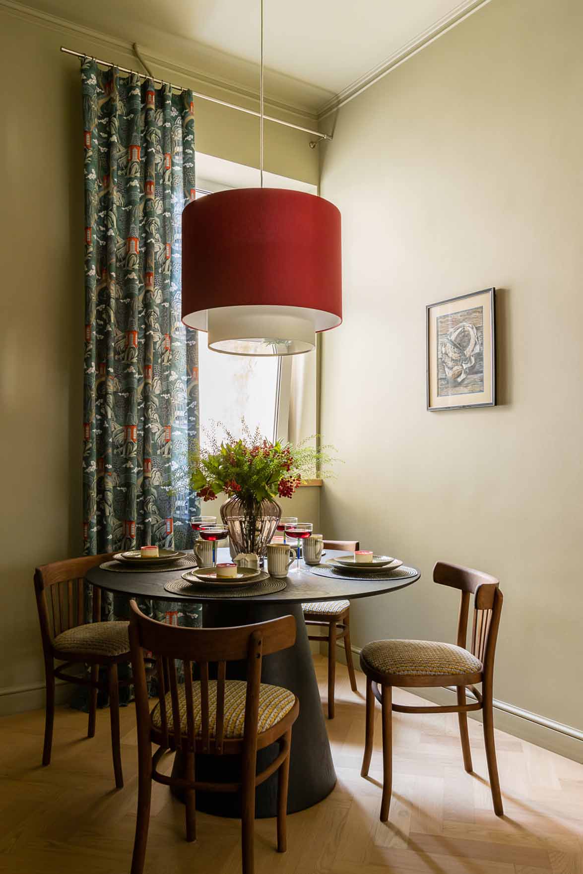 A konyha megőrizte eredeti, kissé sötétebb, de ezáltal rendkívül intim és “kuckós” hangulatát. A tervező nem változtatott az ideális, négyzetes alaprajzon: a tér közepére egy nagy, kerek étkezőasztal került, amely köré felújított, új kárpitozást kapott bécsi székeket helyeztek. Felső szekrények helyett extra tárolóhelyet egy karakteres fenyőfa tálalószekrény ad, amelyben az étkészletek mellett a könyvek is helyet kaptak, tovább erősítve a szoba-szerű hatást. A falakat egy barát által festett, kenyeret ábrázoló akvarellkép díszíti.
