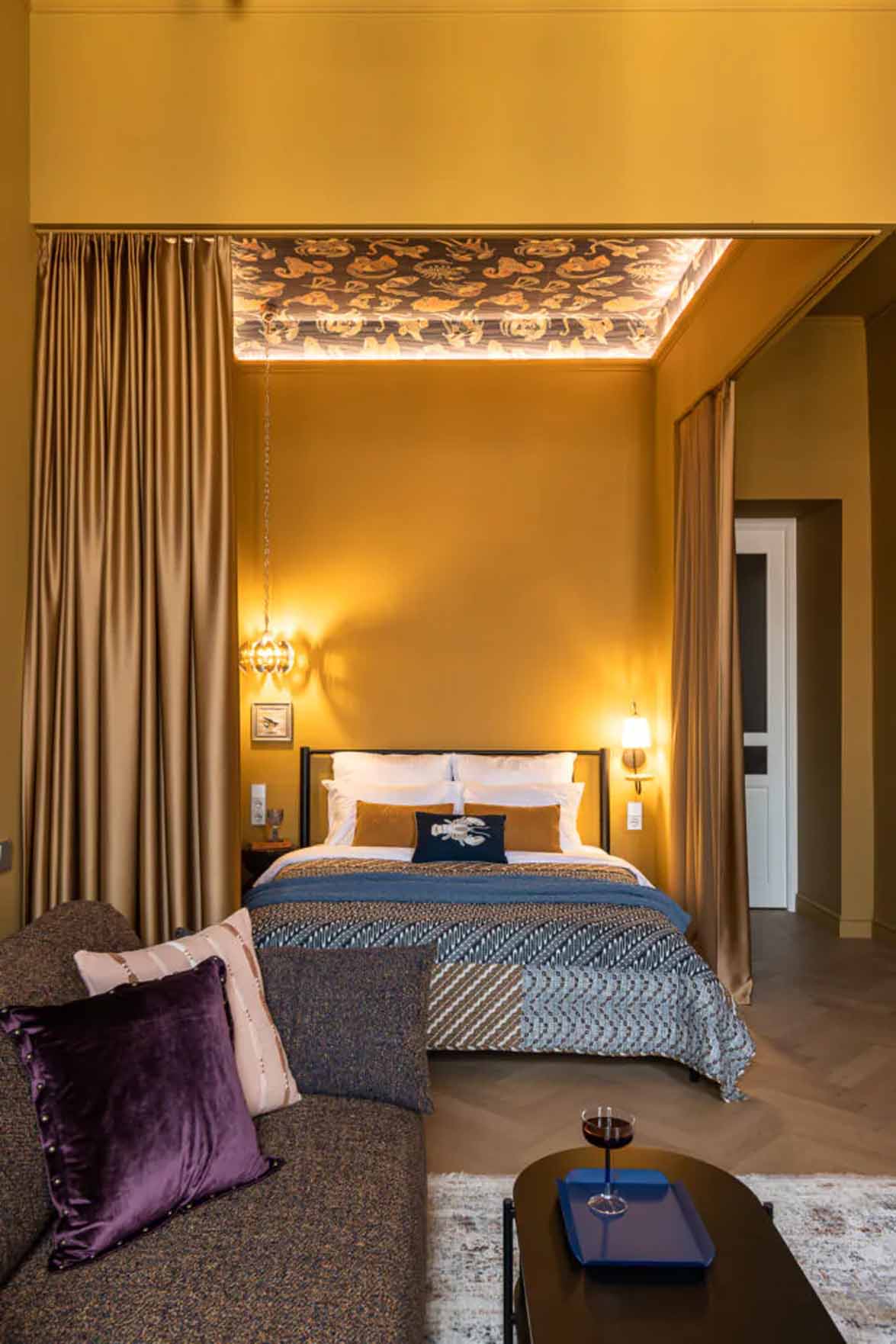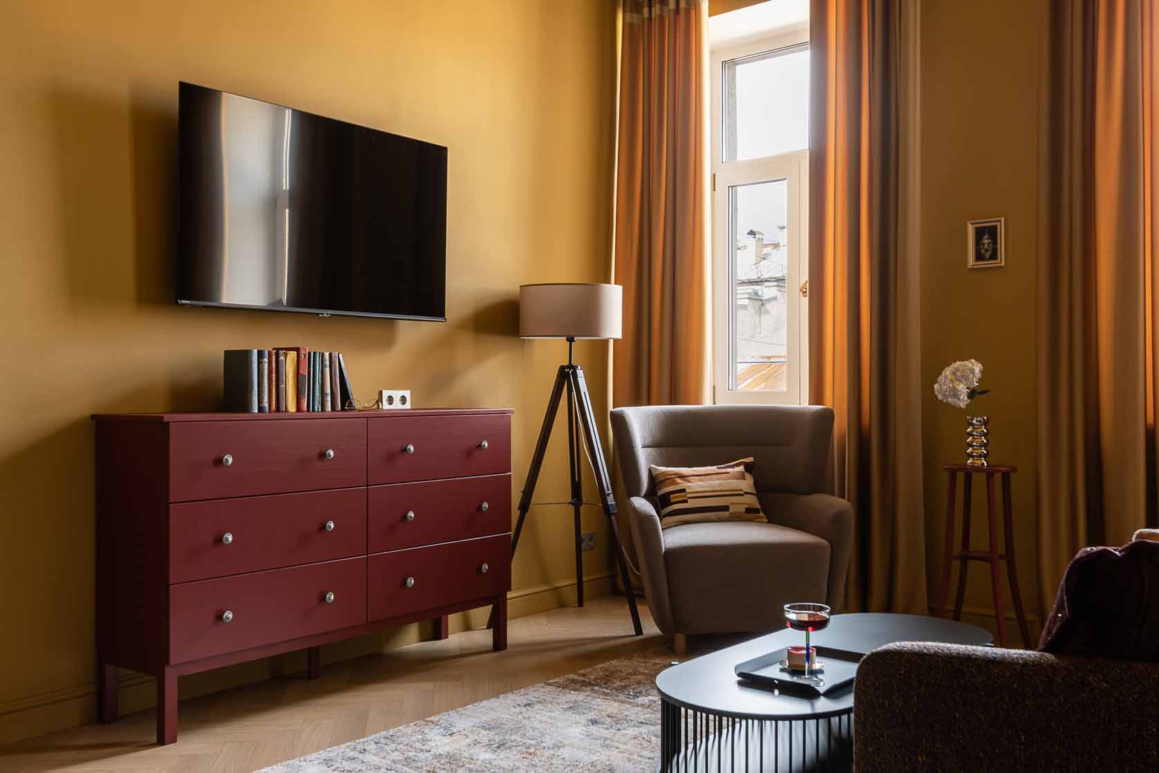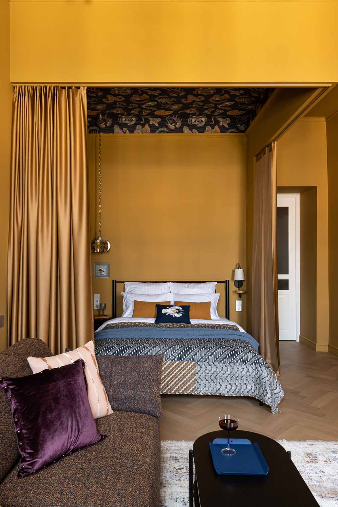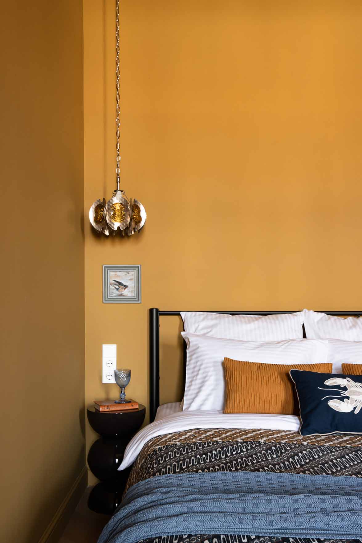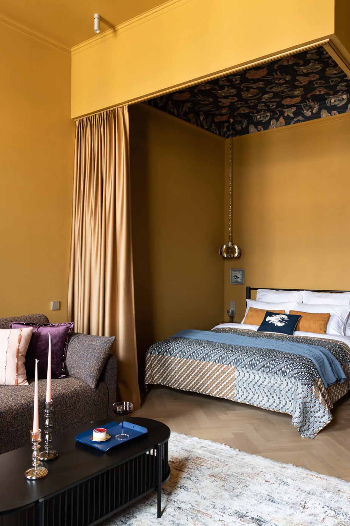Mivel a lakásban nincs külön nappali, a tágas szobában kellett kialakítani a nappali és az alvó funkciókat is. A szoba falai meleg, kurkuma árnyalatot kaptak, amely azonnal barátságossá teszi a nagy belmagasságú teret. Ehhez a domináns színhez igazították a bútorokat is: a korábban nyers fenyő komódot és a megmentett kisasztalokat bordó, bogyós gyümölcsre emlékeztető színre festették át, új fogantyúkkal ellátva őket.