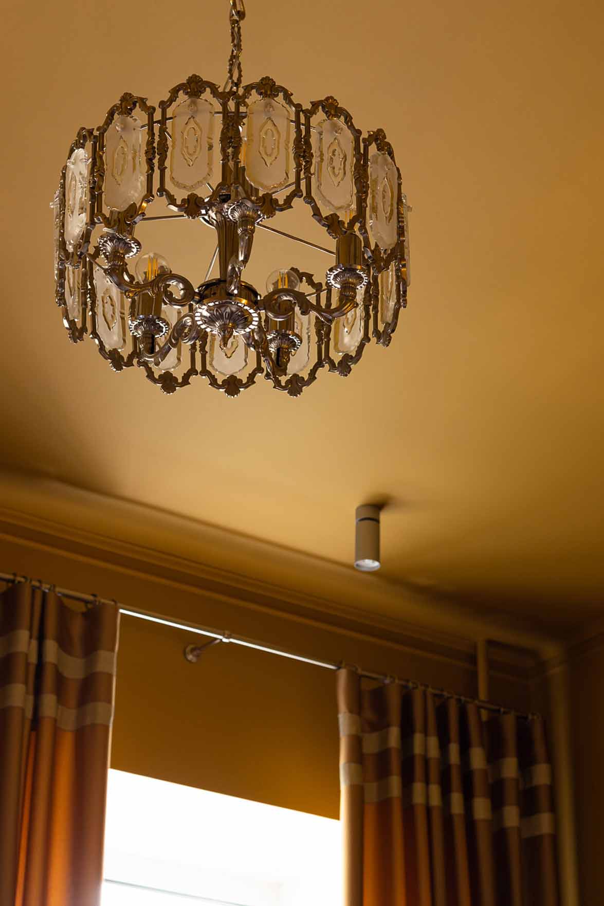 A háló zónát textíliákkal választották le a tér többi részétől. A függönyökön megjelenő ezüstös vízszintes csíkok finoman rímelnek a krómozott csillárok csillogására és a szemközti háztetők részleteire.