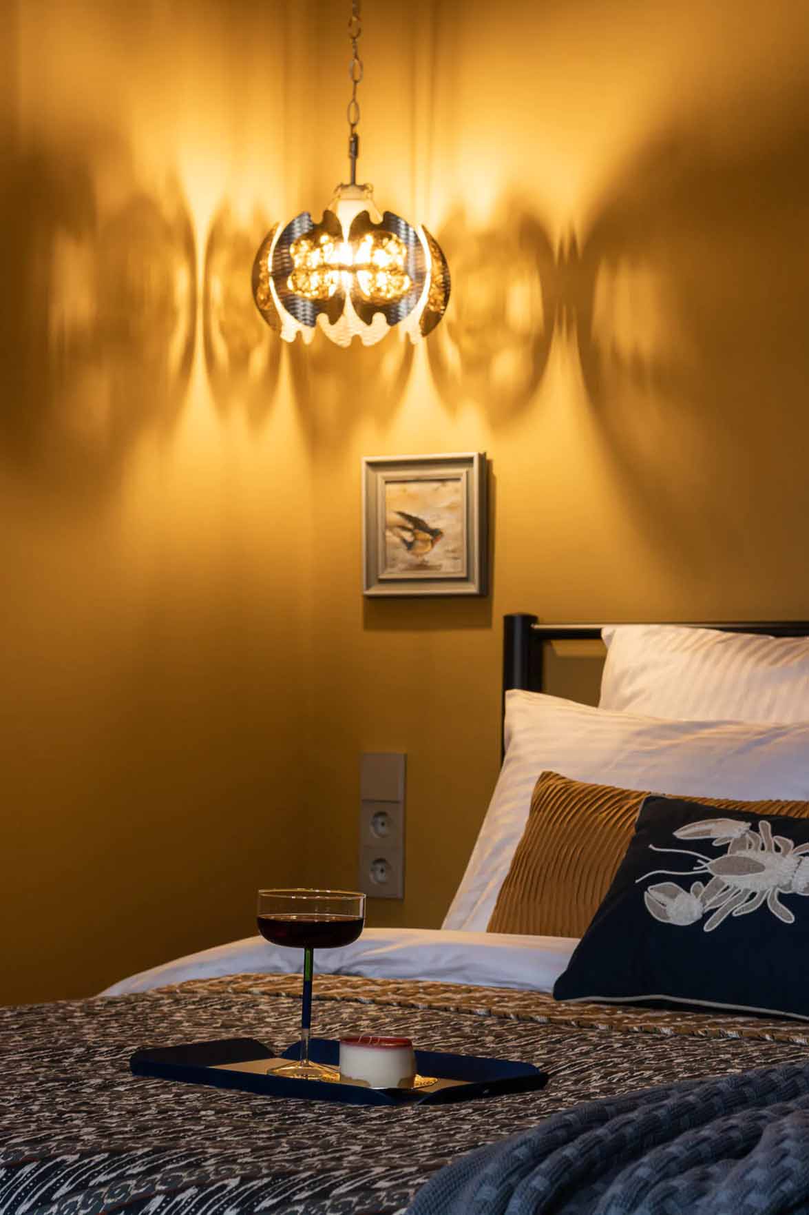 A hálófülke legizgalmasabb eleme azonban felfelé tekintve tárul fel: a mennyezetet dekoratív, csillagjegyeket ábrázoló tapétával burkolták, amelyet hangulatvilágítással emeltek ki. Az ágy mellett egy régi üveggyári függőlámpa biztosítja a fényt; bár a lámpatest patinás és hiányos kristályai az idő múlását jelzik, a felújított vezetékeknek köszönhetően tökéletesen illeszkedik a vintage enteriőrbe.
