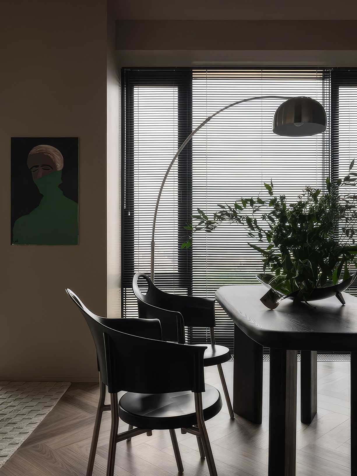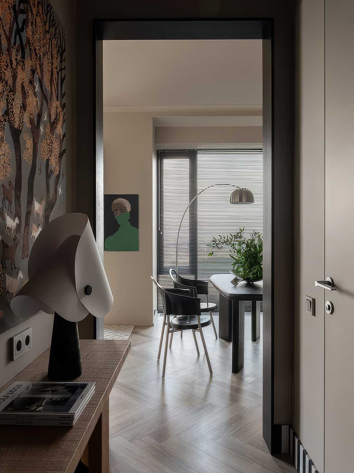 A nappali zónában a mély-matt vizes diszperziós festékkel kezelt falak lágyan szórják szét a fényt, ellensúlyozva az acél hidegségét. A világítási rendszert és a légkondicionálót rejtett módon integrálták, hogy ne törjék meg a vizuális egységet. Az aszimmetrikus étkezőasztal és a különböző textúrájú szövetek organikus formákkal lágyítják a szigorú építészeti geometriát.
