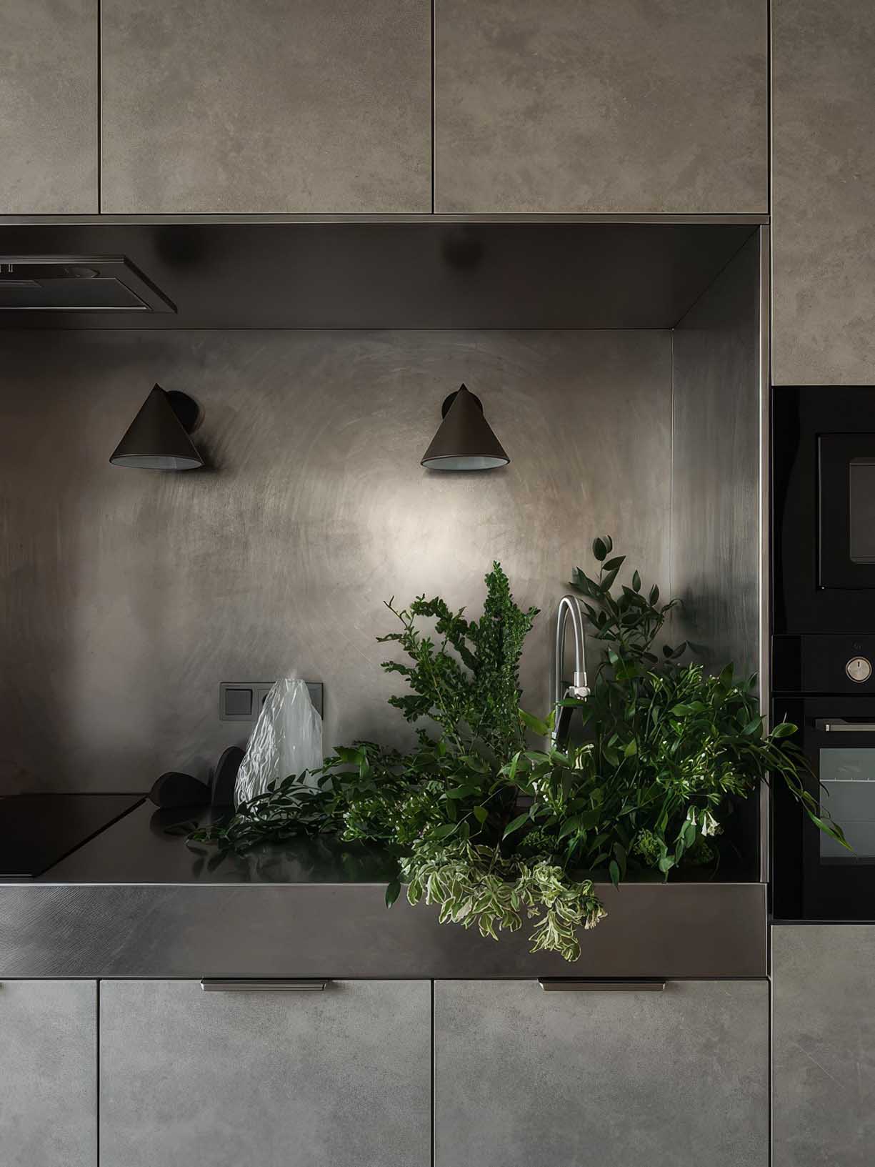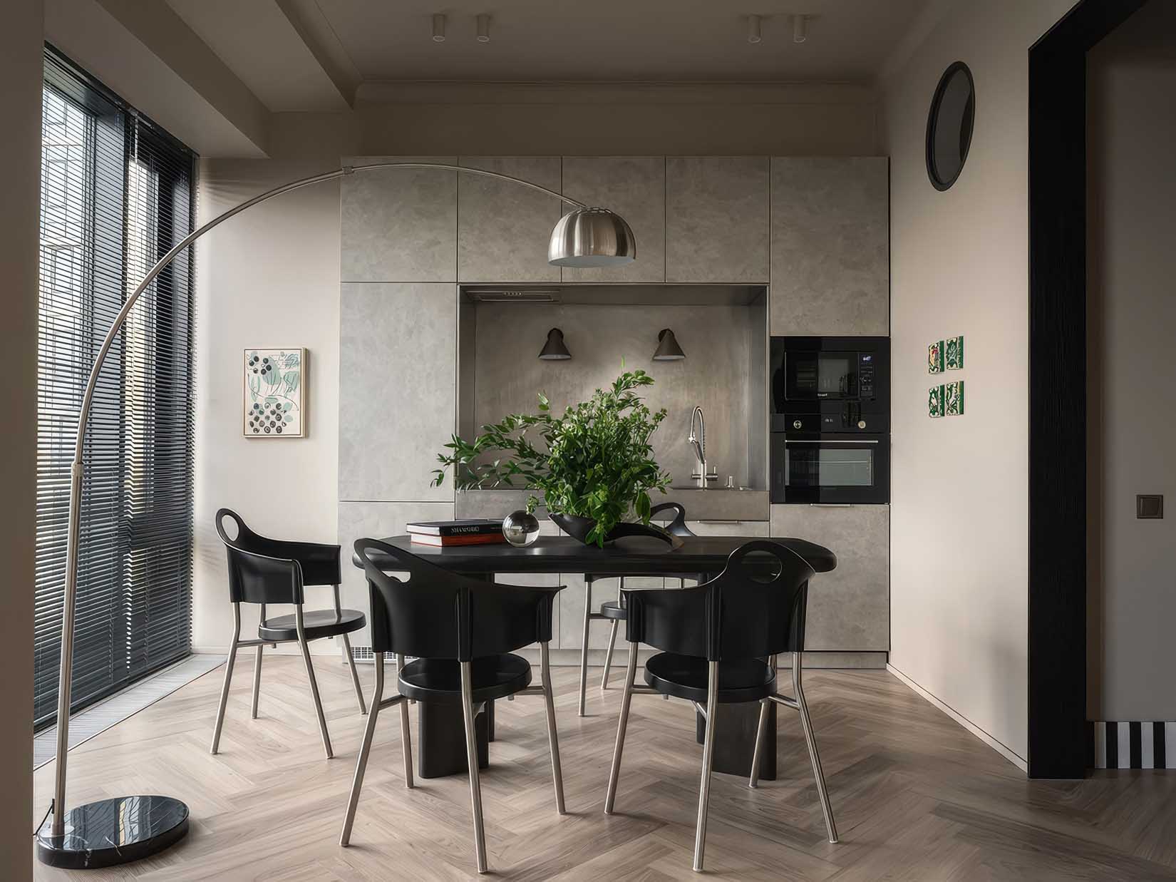 A lakás belsőépítészeti koncepciója a szabadság és a kényelem kettősségére épül. A tervező célja egy olyan multifunkcionális élettér kialakítása volt, amely egyszerre alkalmas baráti összejövetelekre, pihenésre és zavartalan munkavégzésre. A stílusirányzatot a modern eklektika határozza meg: a nyers betonfelületek és a hideg rozsdamentes acél kontrasztot alkot a meleg textíliákkal és a természetes textúrákkal. A megrendelők kérésére a tervező kerülte a túlzott szürkeséget, helyette egy mélyebb, természetközeli tónusokból álló palettát választott, ahol a bézs és a szürke árnyalatait fekete kiegészítők teszik karakteressé.