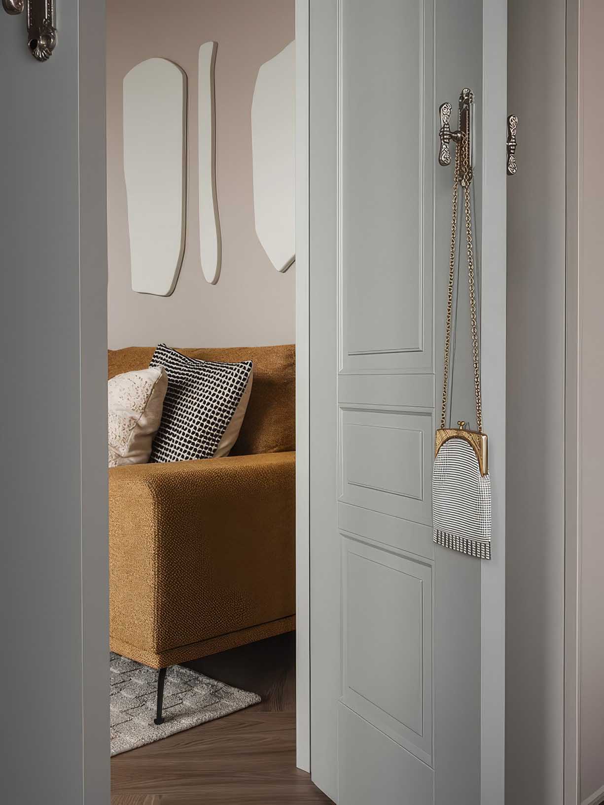 Az előszobában már érezhető a racionalitás és az esztétika egysége. A tárolási rendszereket úgy tervezték meg, hogy észrevétlenül simuljanak a térbe, helyet biztosítva a könyveknek, kiegészítőknek, cipőknek és még a sporteszközöknek is. A padlóburkolatként választott tartós, vízálló kvarc laminát egységesen fut végig a lakáson, optikailag tágítva a teret és kellemes tapintást biztosítva.