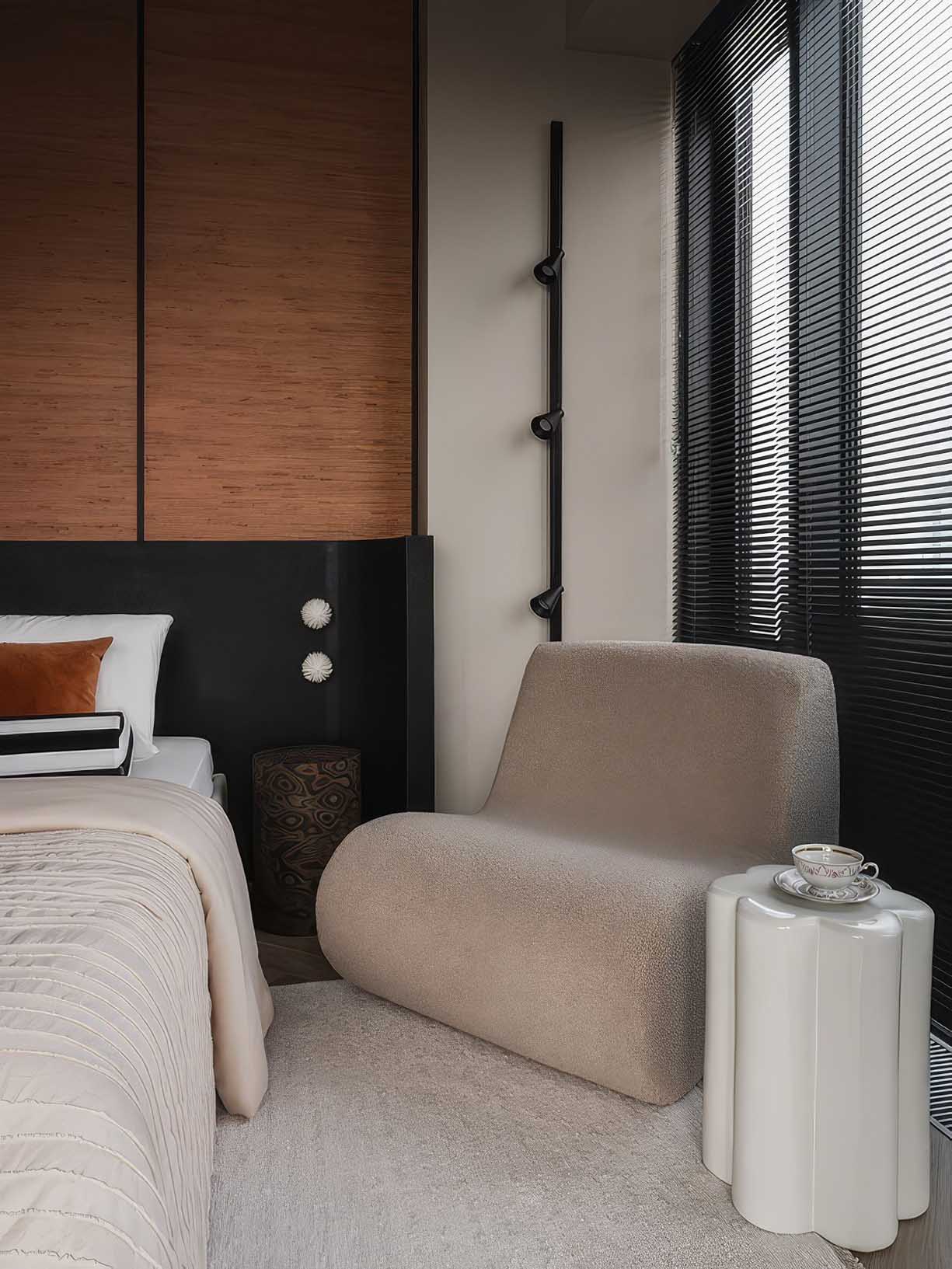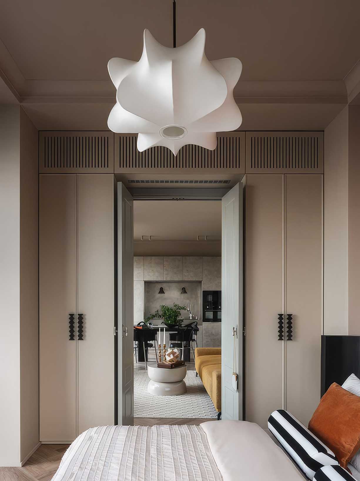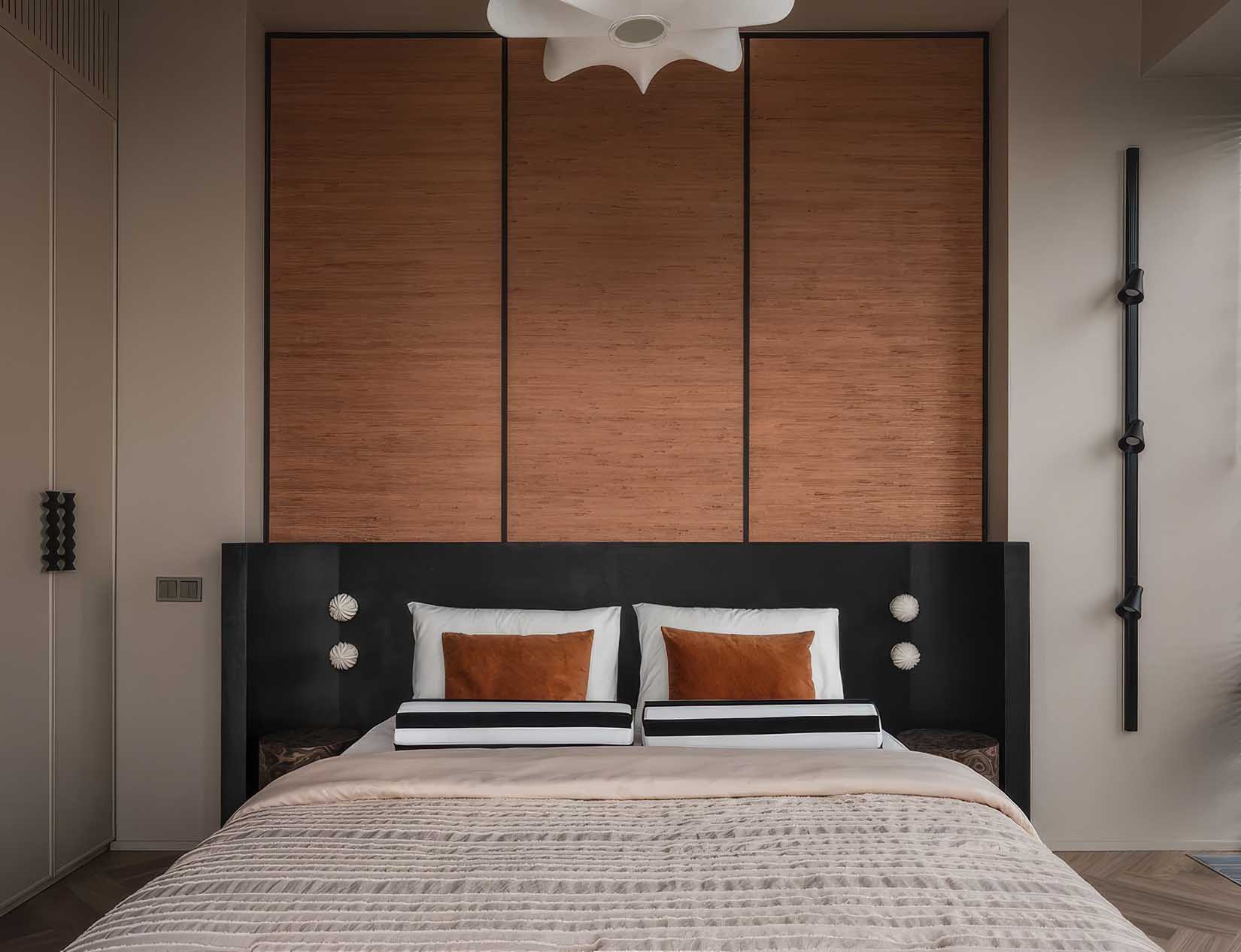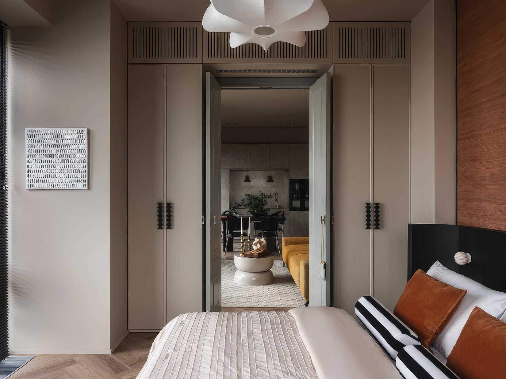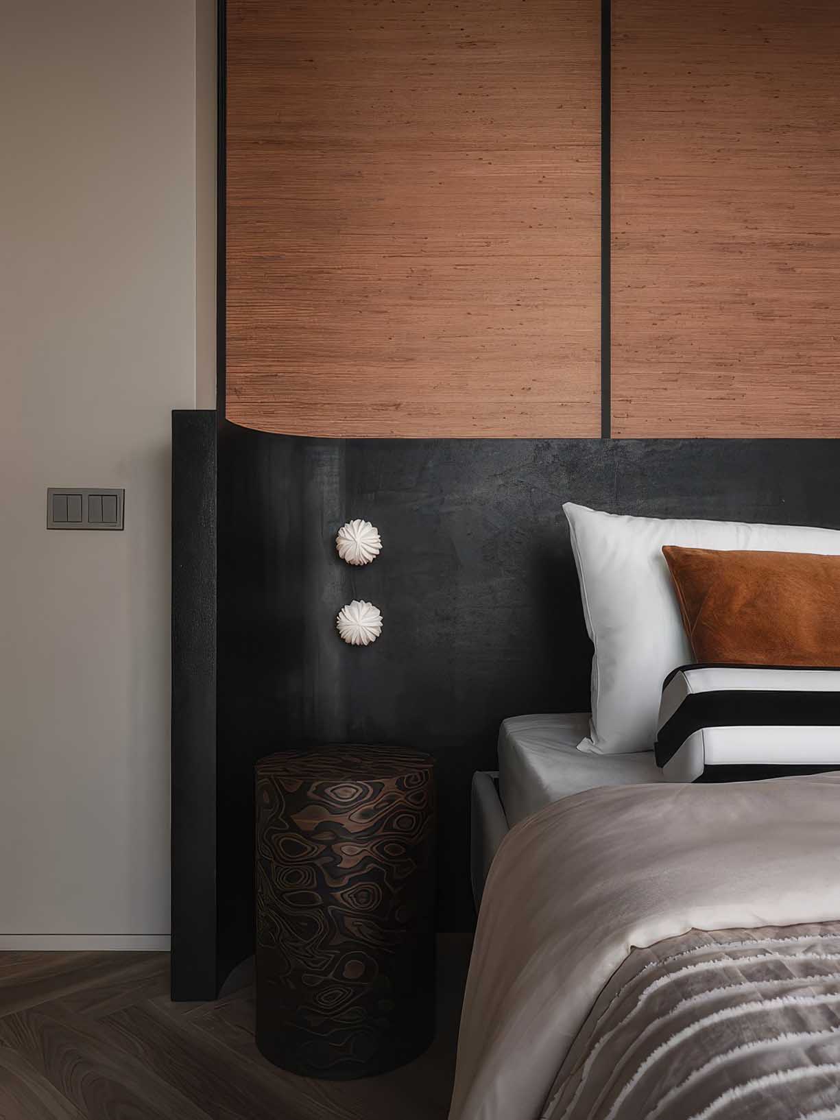 A hálószobában a nyugalom és a természetesség dominál. A falfülkéket természetes jutából készült tapétával burkolták, amely mélységet és organikus textúrát ad a helyiségnek. A tervező különös figyelmet fordított a részletekre: a gardróbszekrények egyedi gyártású fogantyúi szándékosan szabálytalan, organikus formát kaptak, hogy megtörjék a minimalizmus sterilitását. Az ágy fejtámlájának íves vonalai és a szimmetrikusan elhelyezett építészeti elemek tökéletes keretet adnak a pihenésnek, miközben elegánsan rejtik el a tartóoszlopokat.