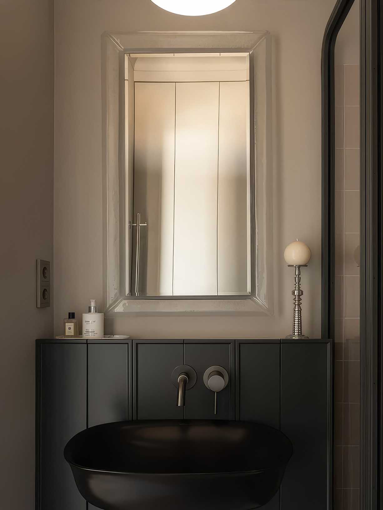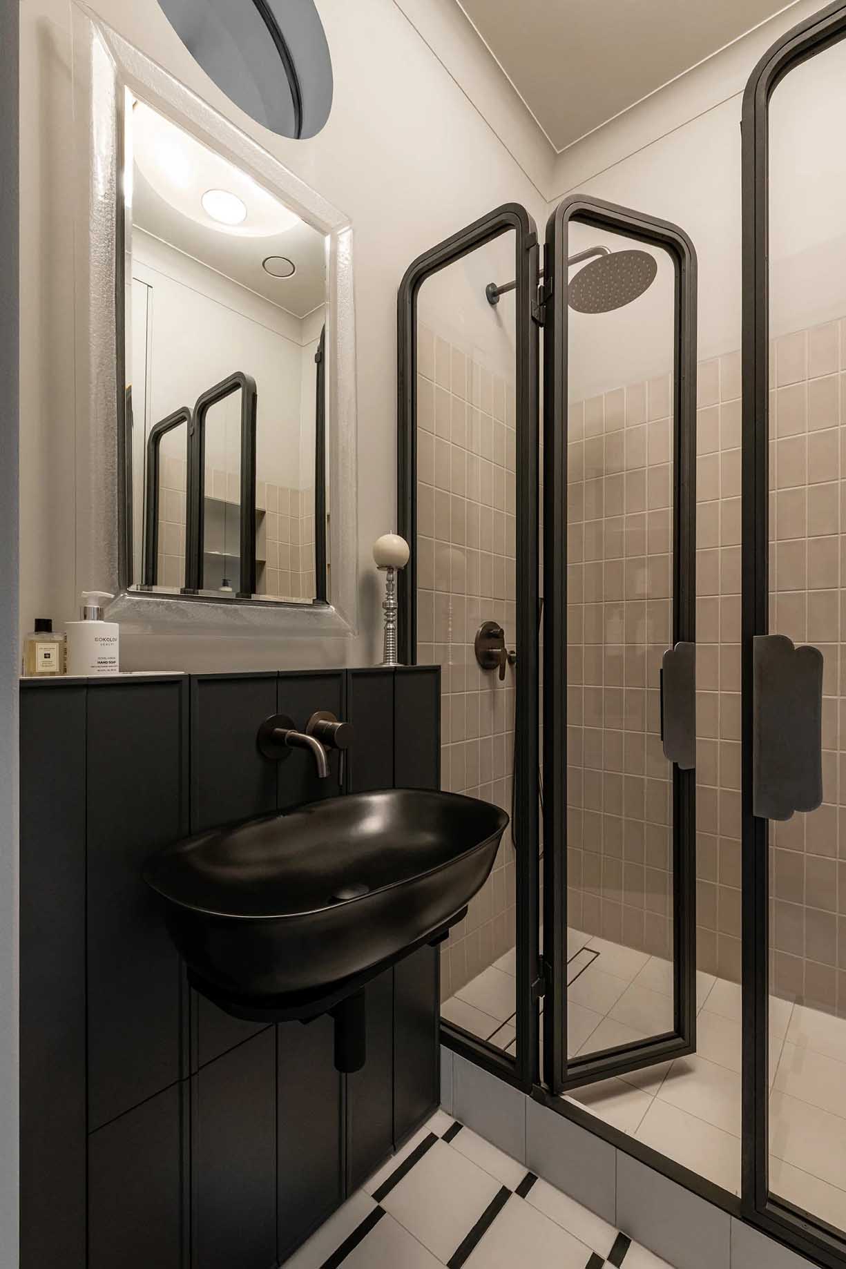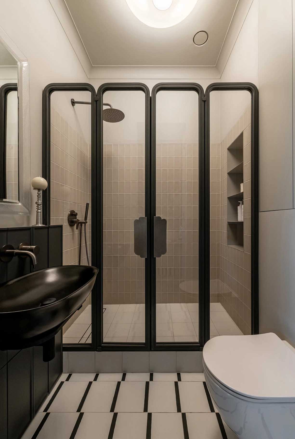A fürdőszoba a korlátozott alapterület ellenére is szellős és funkcionális maradt. A nyugodt tónusú kerámiaburkolatok tiszta környezetet teremtenek. A helyiség legkülönlegesebb eleme a négytagú, paravánszerű zuhanyfal, amely két szélső fix és két középső nyíló szárnyból áll. A zuhanykabin egyedi tervezésű, lágy ívű fogantyúi nemcsak ergonómiai szempontból kifogástalanok, hanem vizuális ékkövei is a helyiségnek.