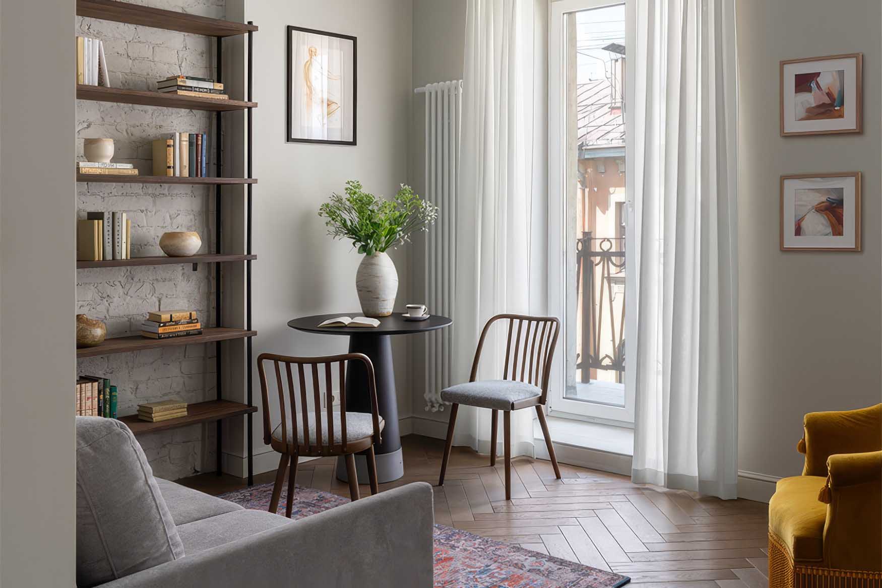 Ezt a hangulatos enteriőrt egy a történelmi negyed szívében található, 46 m²-es lakásban tervezték egy újságíró megbízásából. A tulajdonos hölgy kifinomult ízlését követve, a koncepcióban a helyszínhez illő motívumok a modern komforttal fuzionálnak. A hűvös színpaletta szinte melankolikus hangulatot teremt, míg a retró részletek adják meg az enteriőr karakterét.
