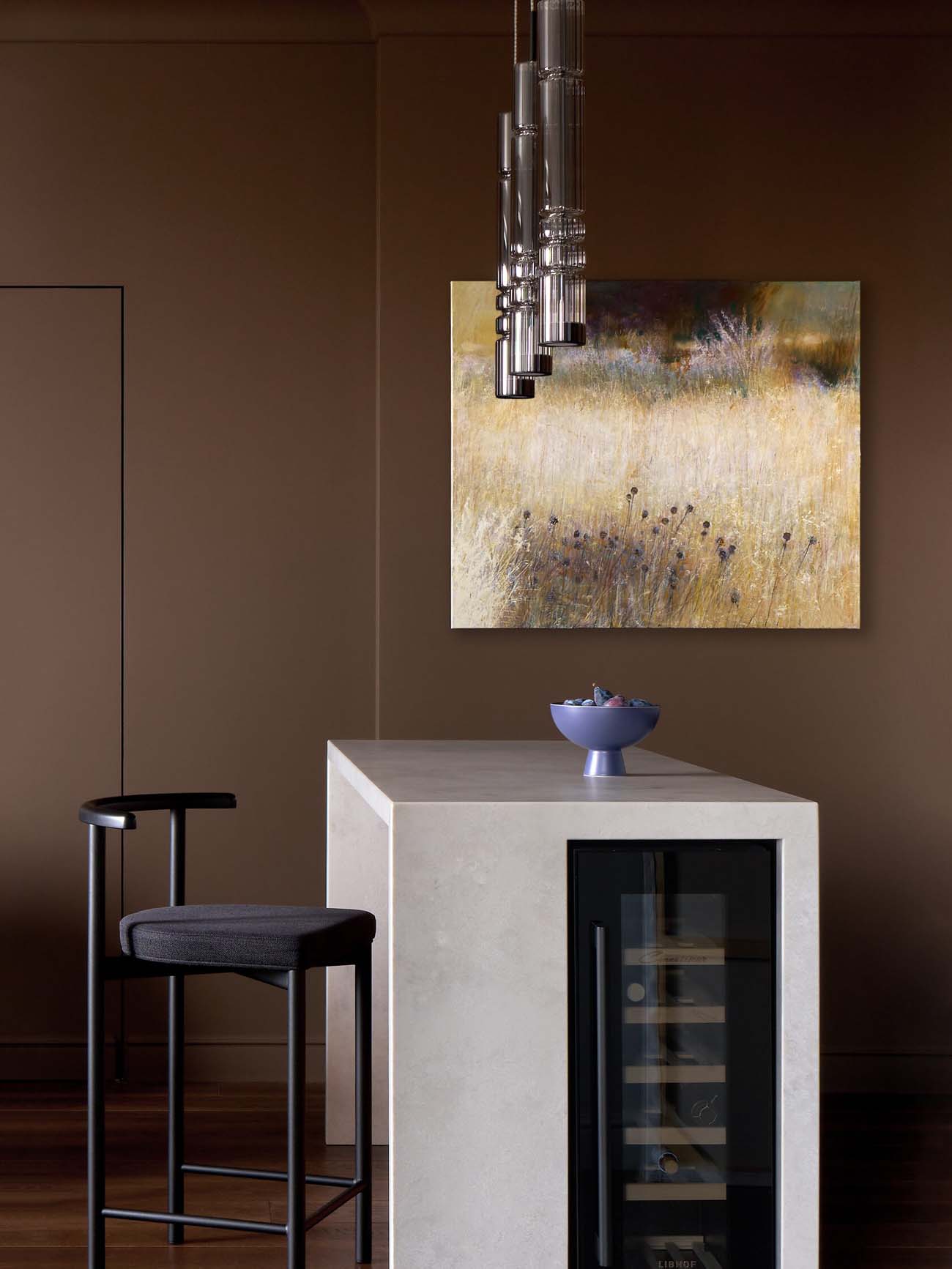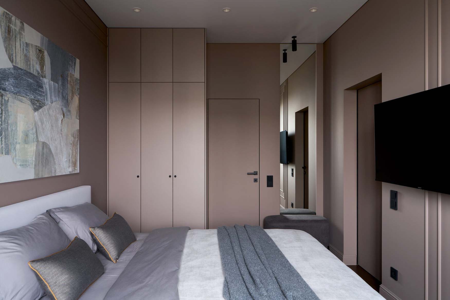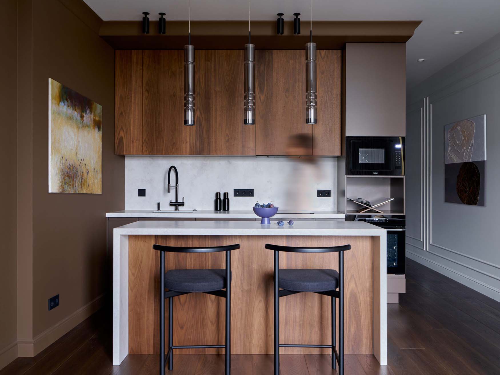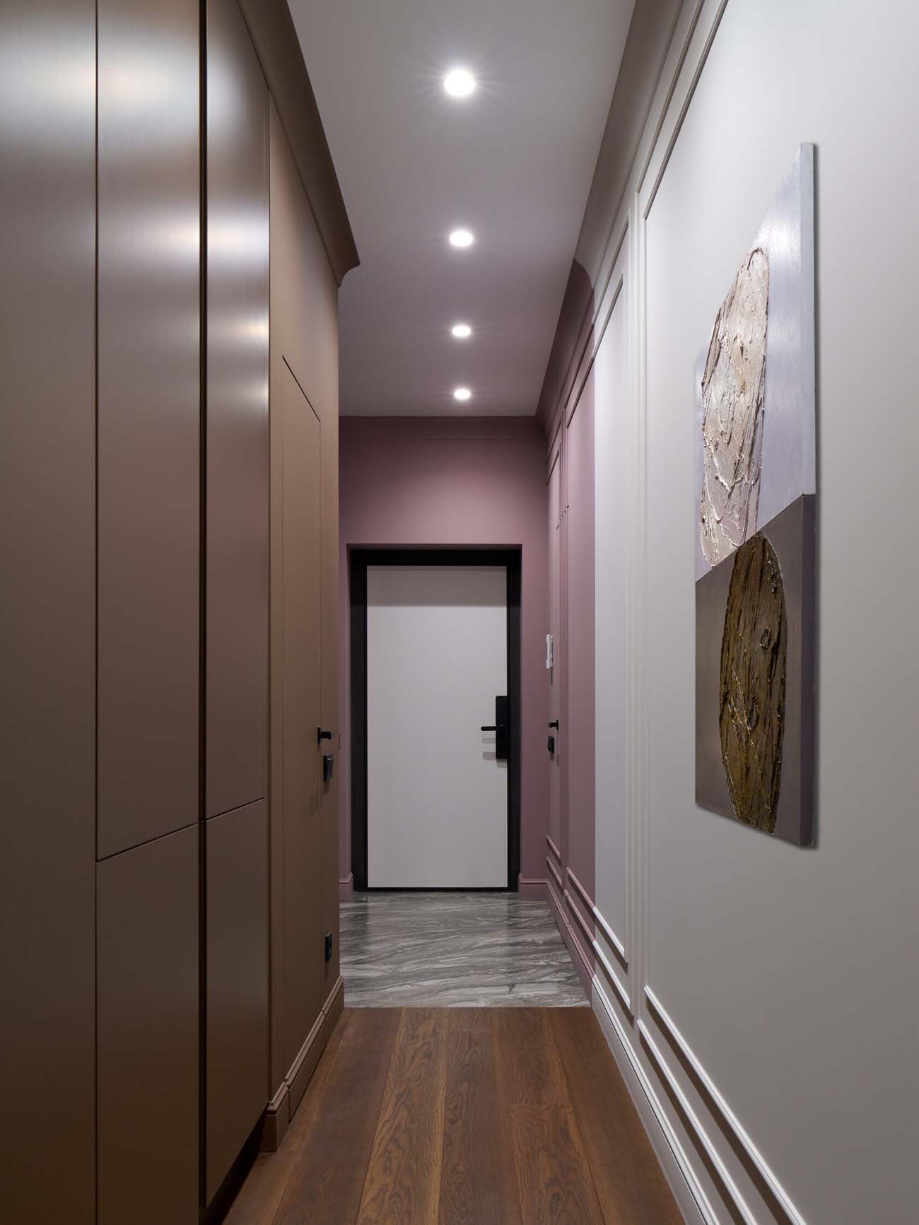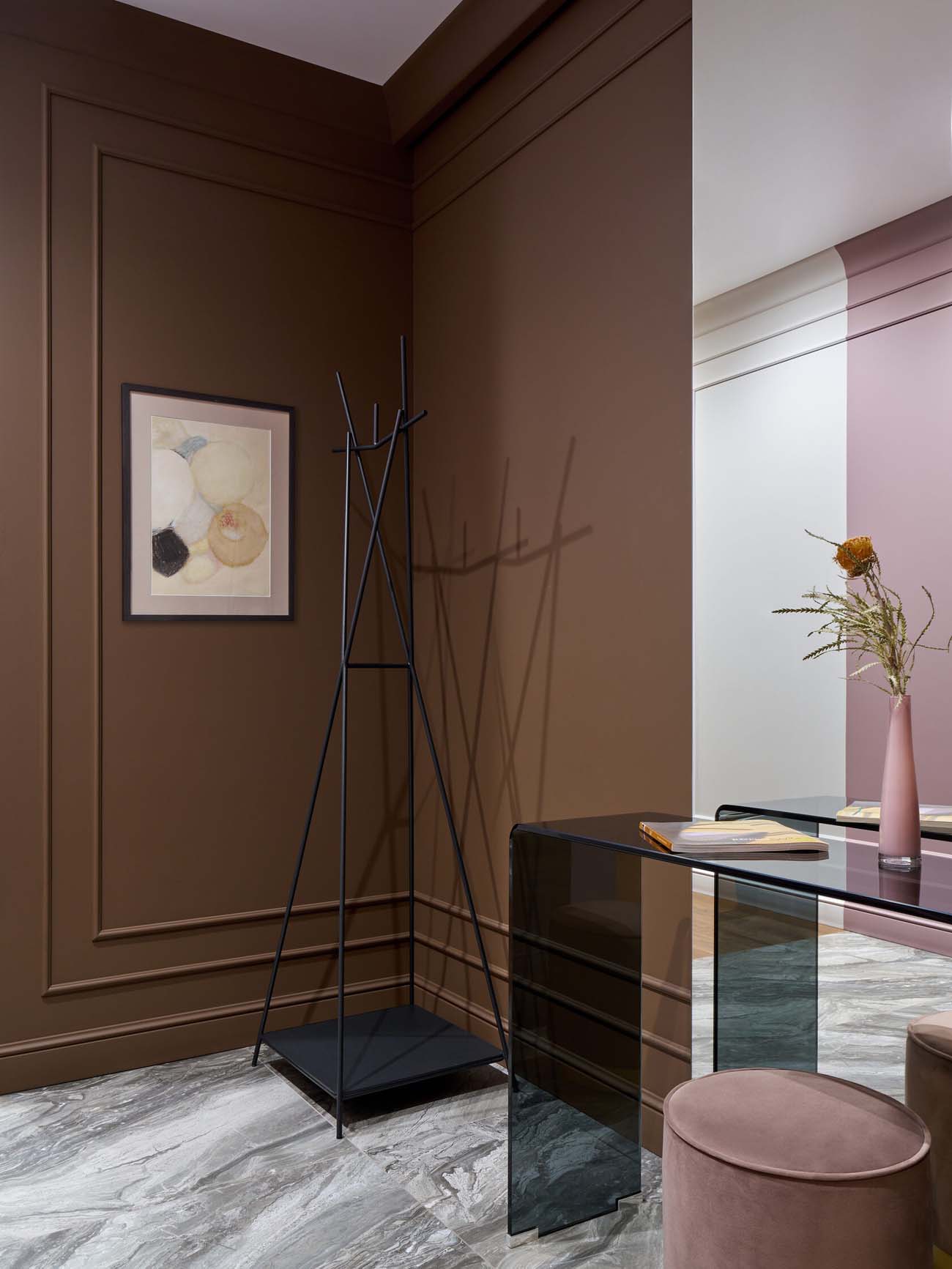 A háromszobás lakás enteriőrjében a modern klasszikus stílus időtlen eleganciája találkozik a telt, karakteres színekkel. A tervezés során a füstös rózsaszín, a mély csokoládébarna és szürke árnyalatok harmóniája, a gondosan válogatott anyagok – mint a monokróm greslapok és a meleg tónusú fafurnér – és a kifinomult részletek olyan egyedi hangulatot teremtenek, amely egyszerre otthonos és lenyűgöző.