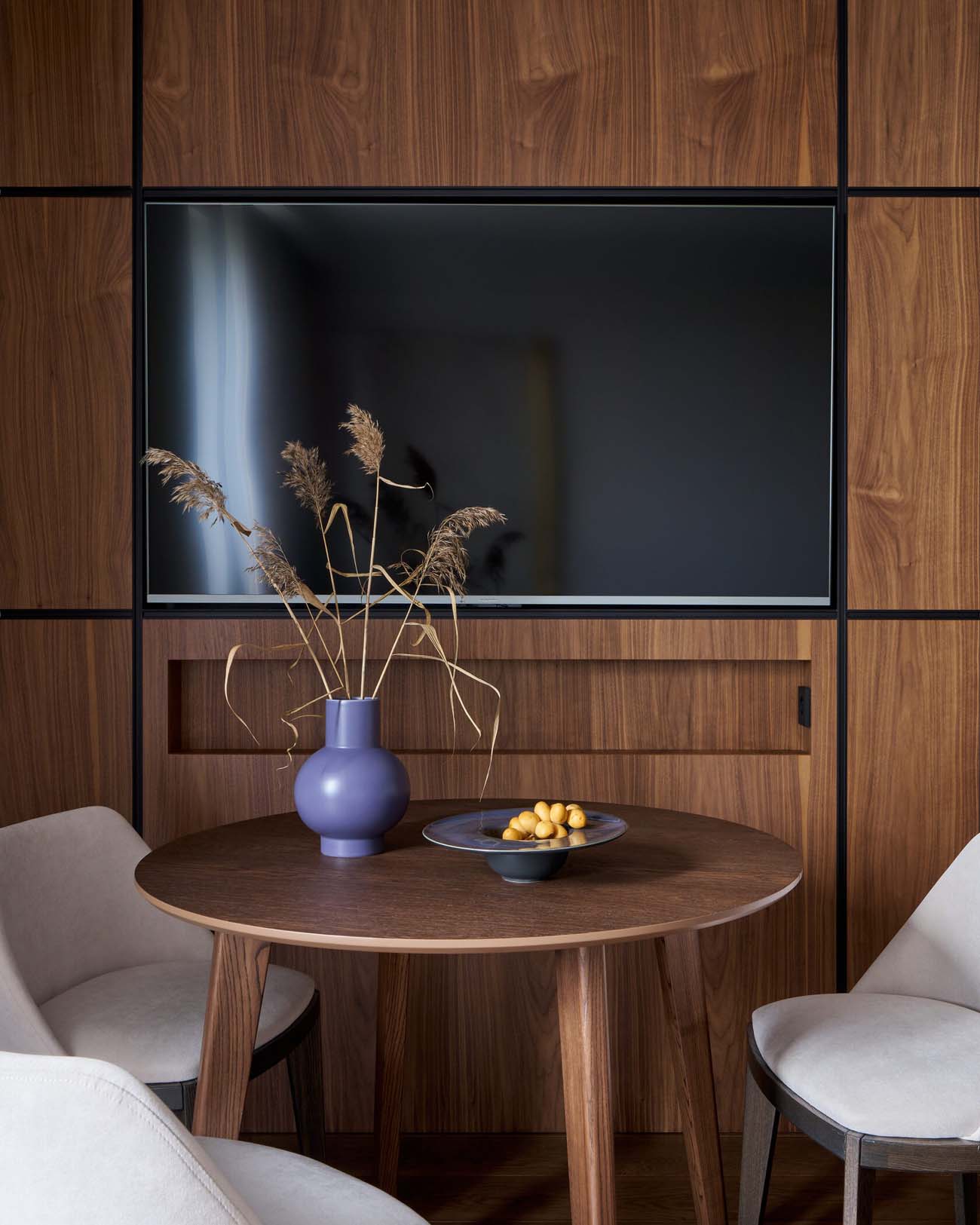 Bár a belsőépítészeti elemek finoman összekapcsolódnak, a lakás minden helyisége önálló, egyedi karakterrel rendelkezik. A meleg faárnyalatok, a puha textíliák és a gondosan megtervezett, változatos világítási megoldások minden szobában az otthonosság és a meghittség légkörét árasztják.