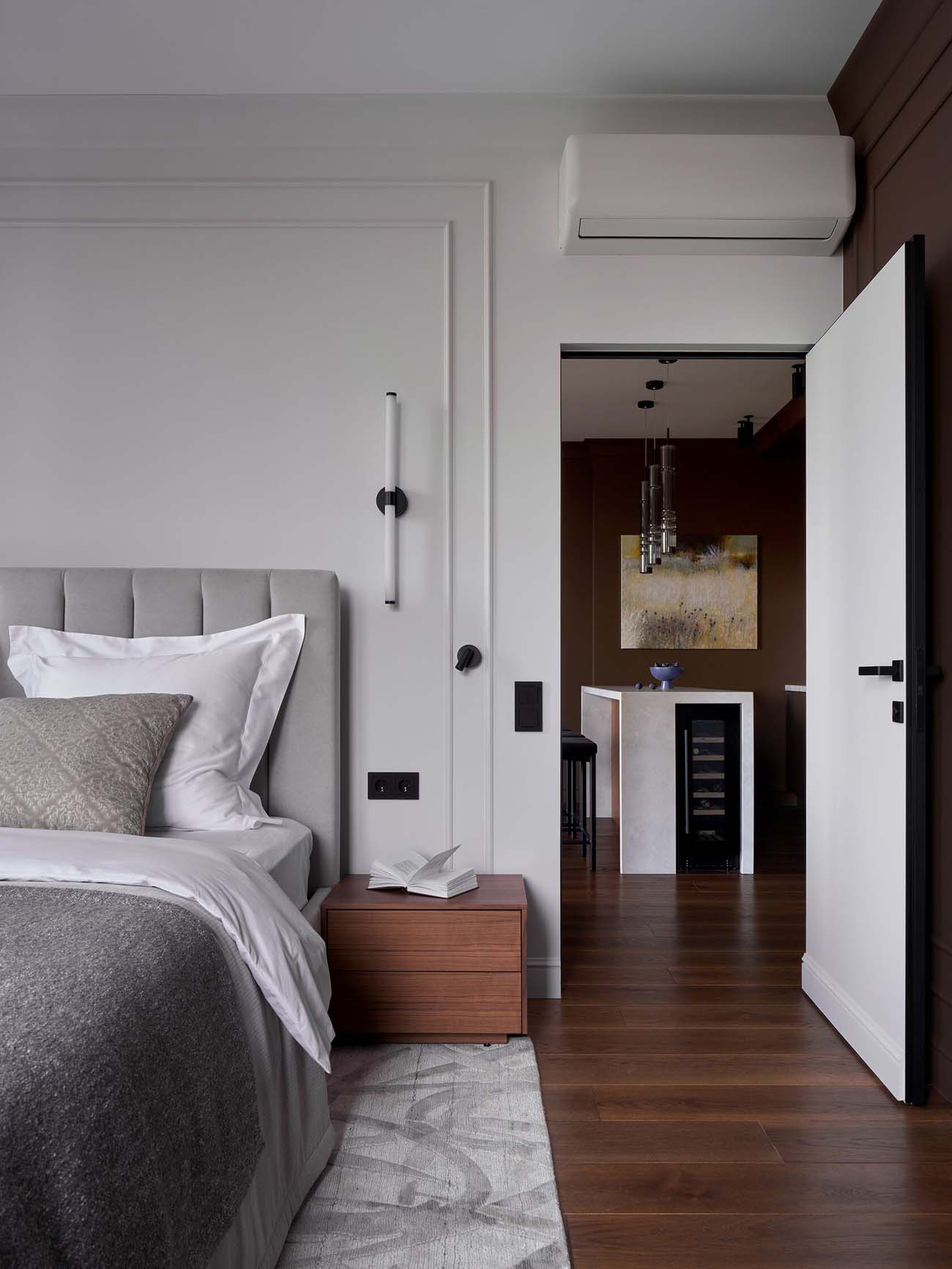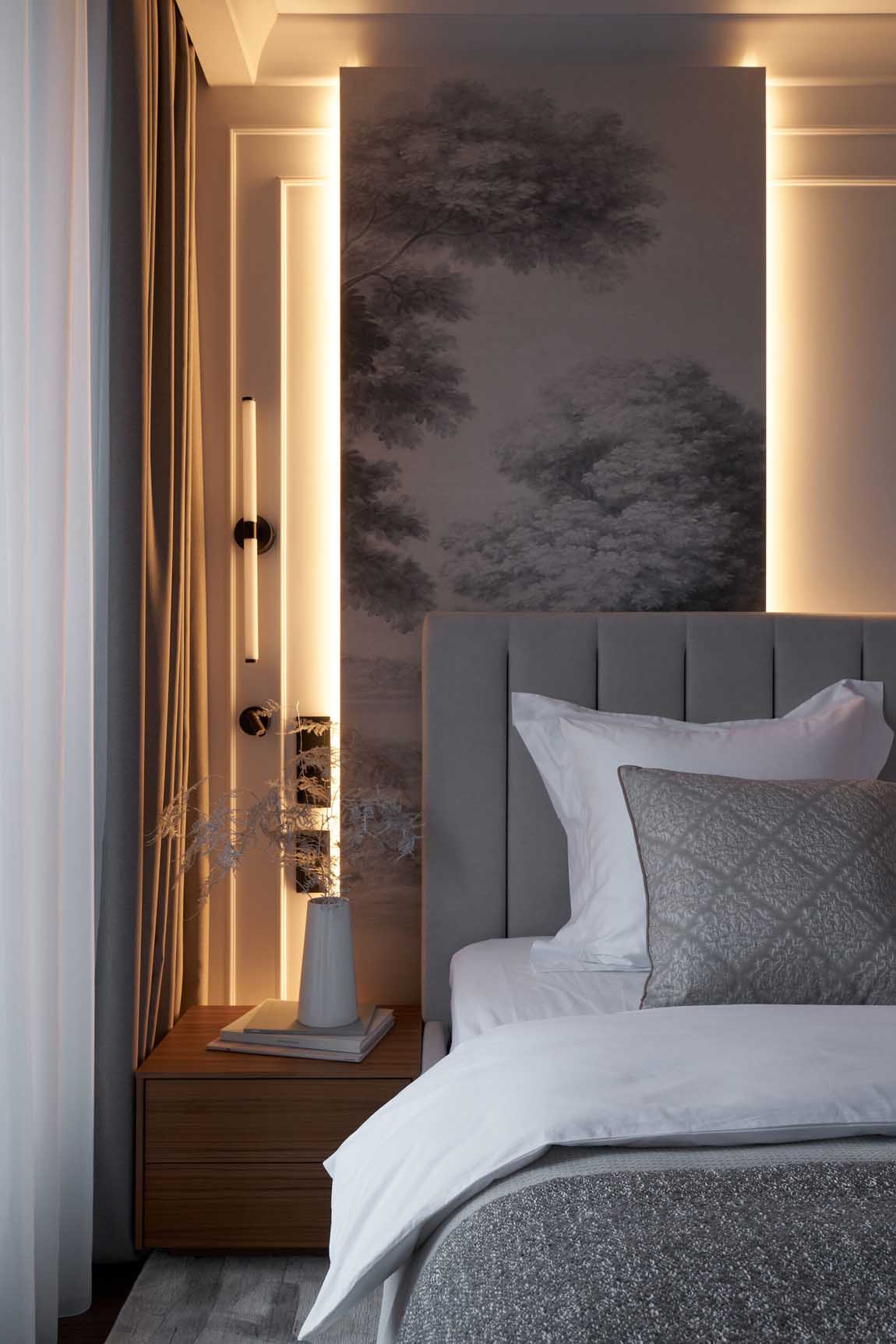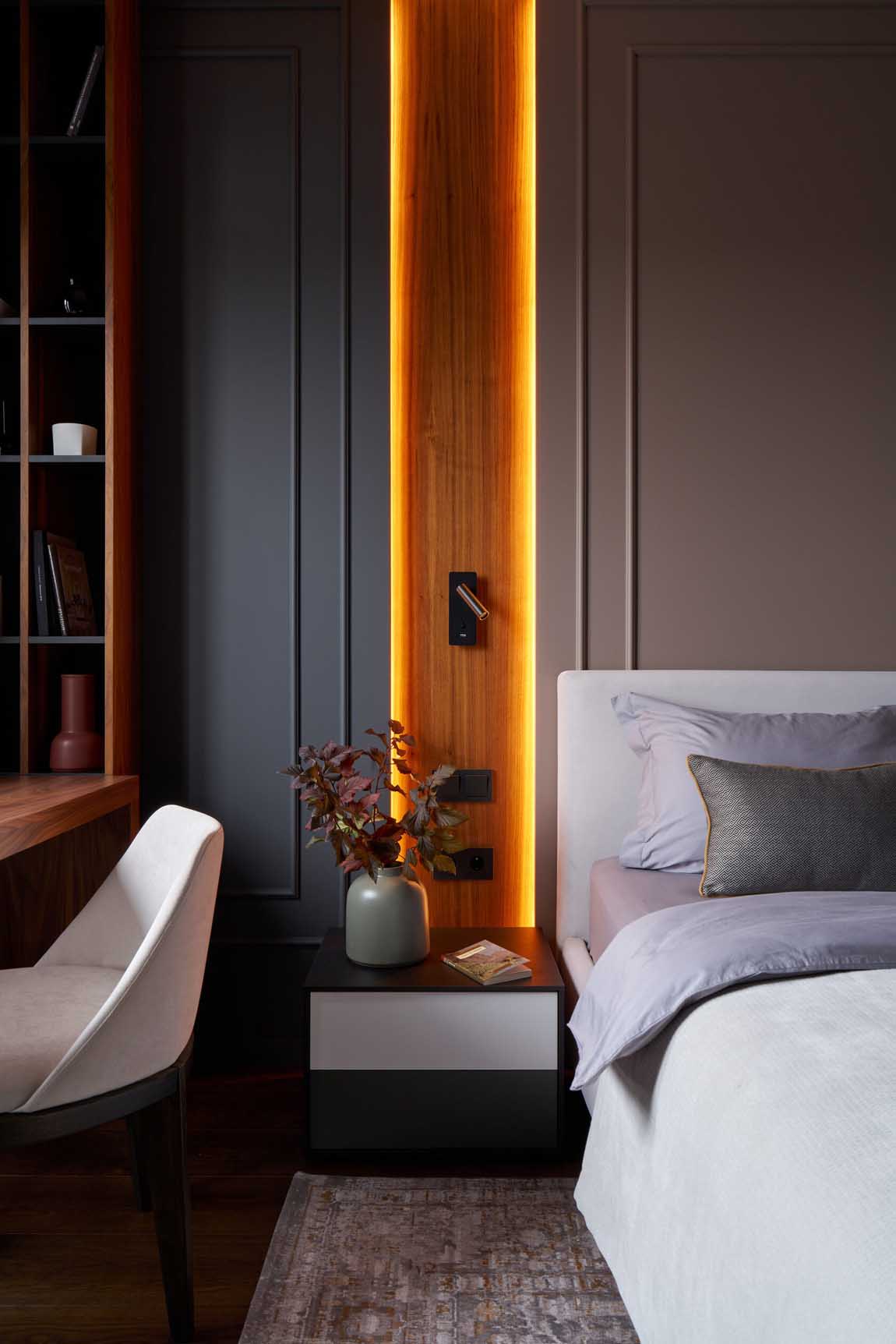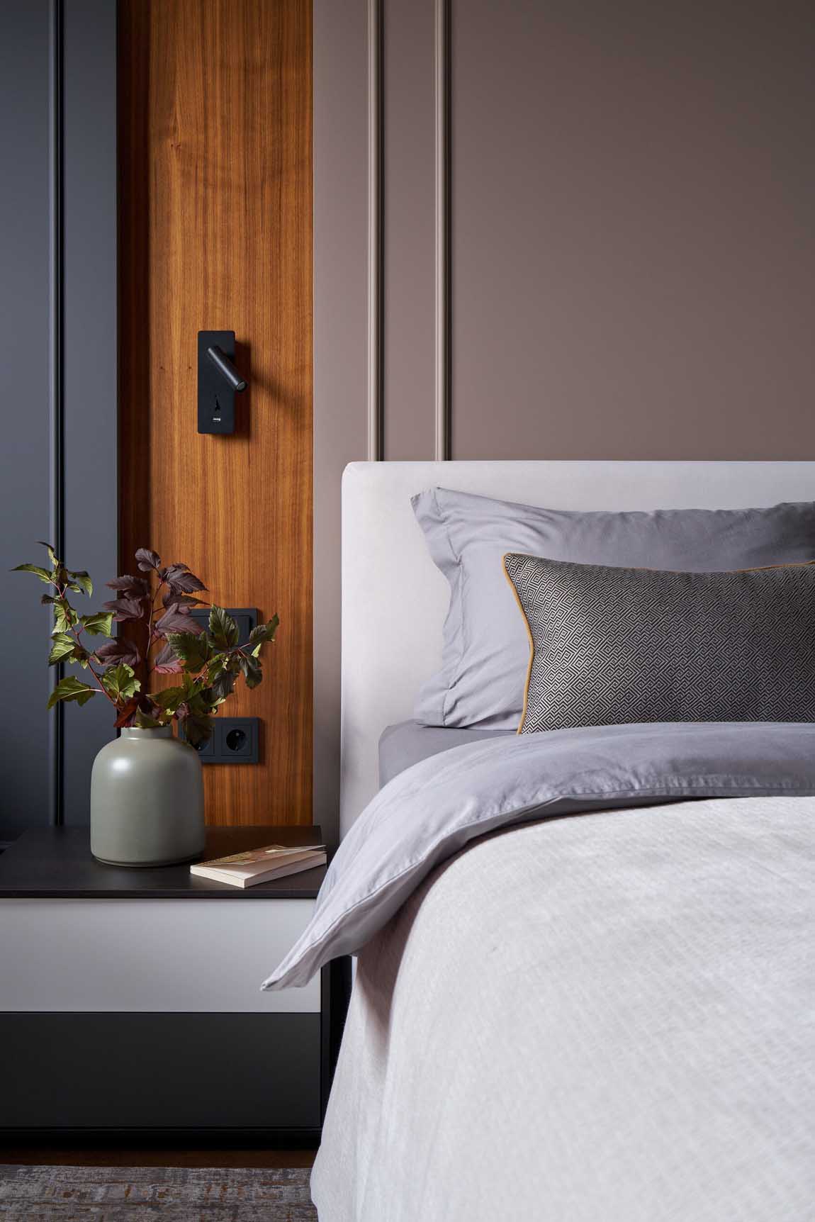 A csokoládébarna, világosszürke és a füstös rózsaszín árnyalatok harmóniája a szülői hálószoba falain és bútorain is folytatódik. A helyiség fókuszpontja egy hátulról megvilágított, dekoratív falpanel, amelynek felületét egyedi, metszet-hatású tapéta borítja. A hálószoba világítási rendszere többféle hangulat megteremtésére ad lehetőséget: kétféle falikar, a panel derengő fénye és a rejtett mennyezeti világítás is a rendelkezésre áll. Az okosotthon-rendszernek köszönhetően a központi világítás fényereje és színhőmérséklete is személyre szabható.