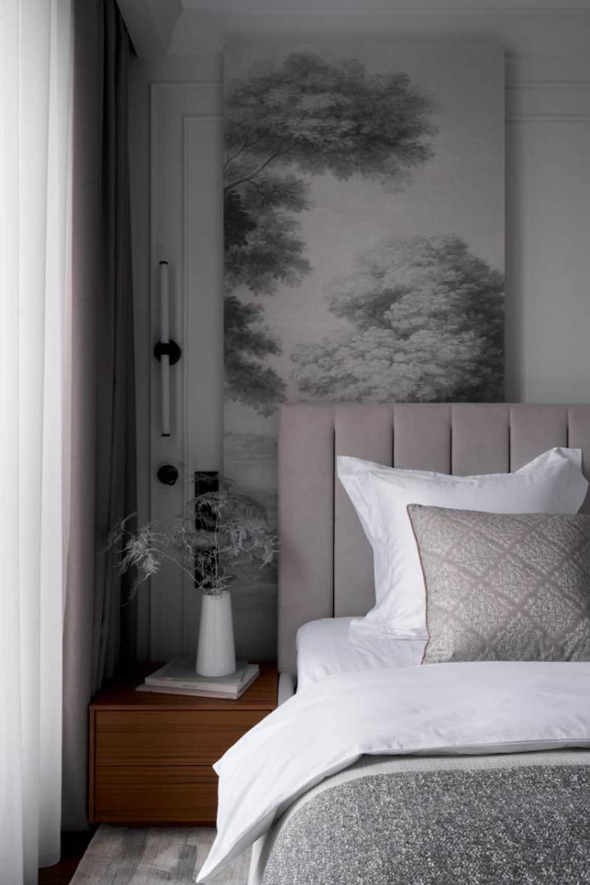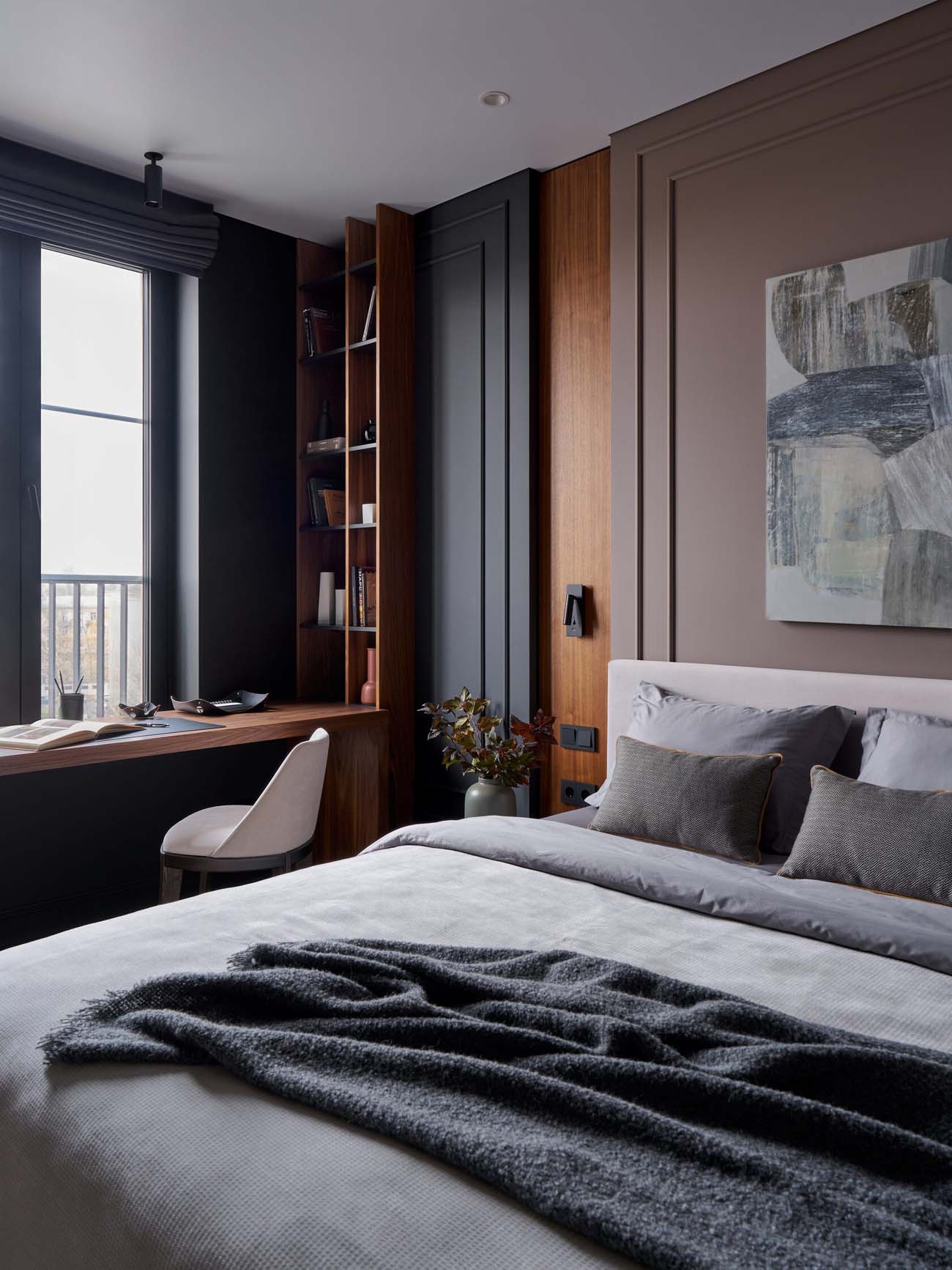 A lakás második hálószobája elsősorban a tulajdonosok fiának birodalma, de vendégszobaként is funkcionál, mert a felnőtt fiú már külön él, és csak időnként tér haza a szülői házba. Ennek a szobának és a hozzá tartozó fürdőnek a hangulata sötétebb, férfiasabb tónusokra épül. Itt a sötét és szürke árnyalatok dominálnak, természetesen megőrizve a lakás egységes, kifinomult stílusát.