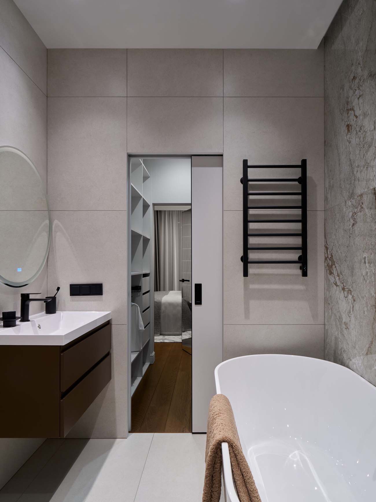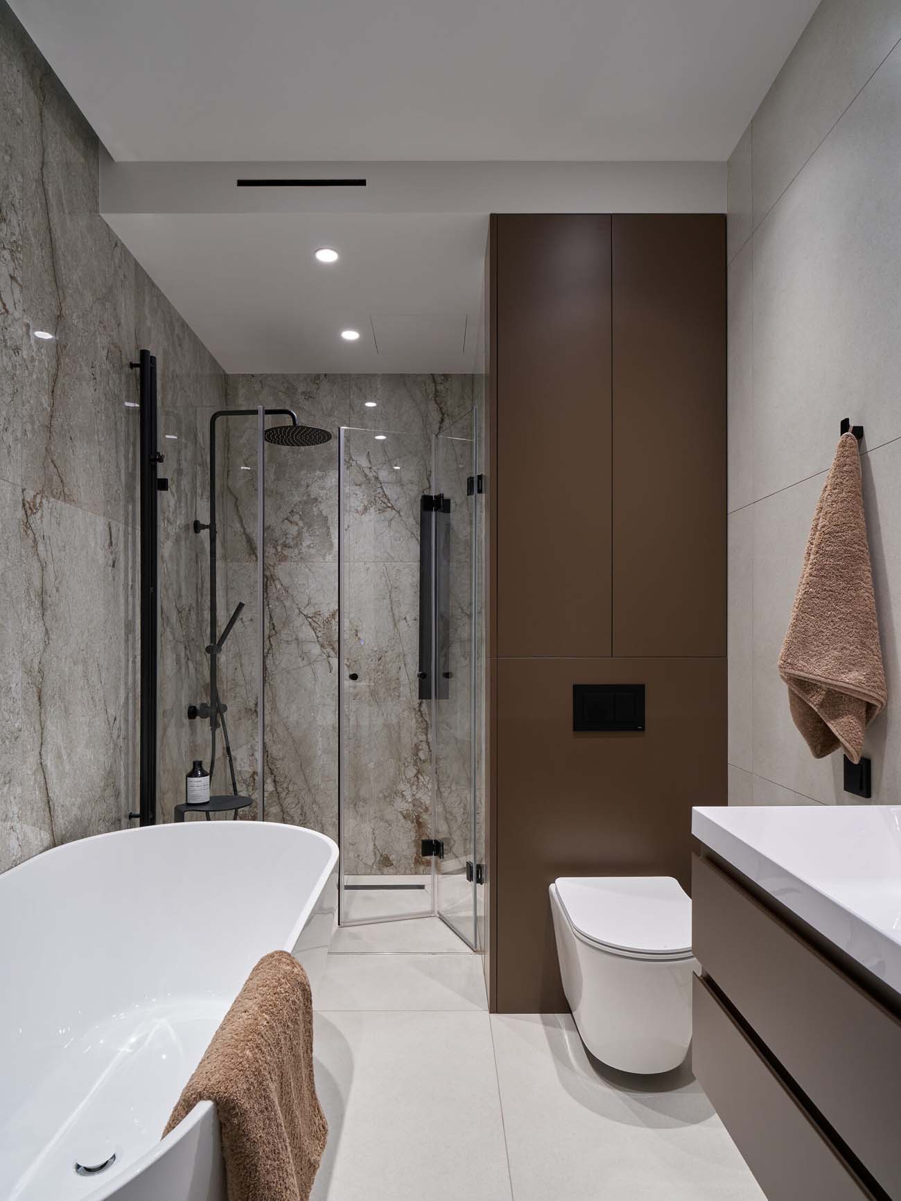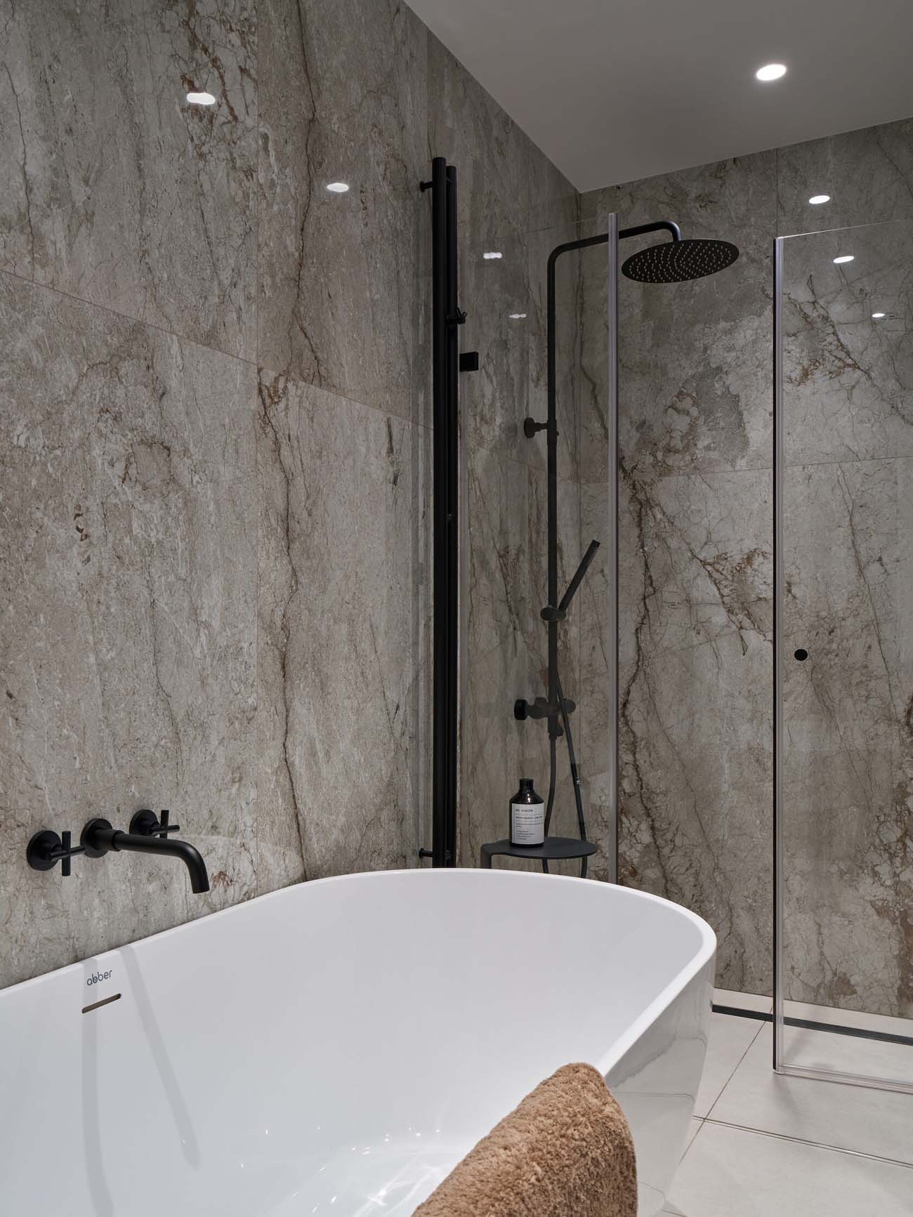 Egy kompakt, mégis tágas gardróbszobán keresztül közelíthető meg a szülők fürdőszobája, ahol zuhanyfülke, szabadon álló kád, mosdó szekrénnyel, valamint egy WC is helyet kapott – a falba épített tartály fölött zárt tárolóhelyet alakítottak ki. A fürdőszoba éke a lekerekített formájú, hófehér kád, amely a padlótól a mennyezetig érő, természetes kőhatású greslapokkal burkolt falakhoz simul. A hangsúlyos barna szín a bútorokon és a burkolat erezetében is visszaköszön.