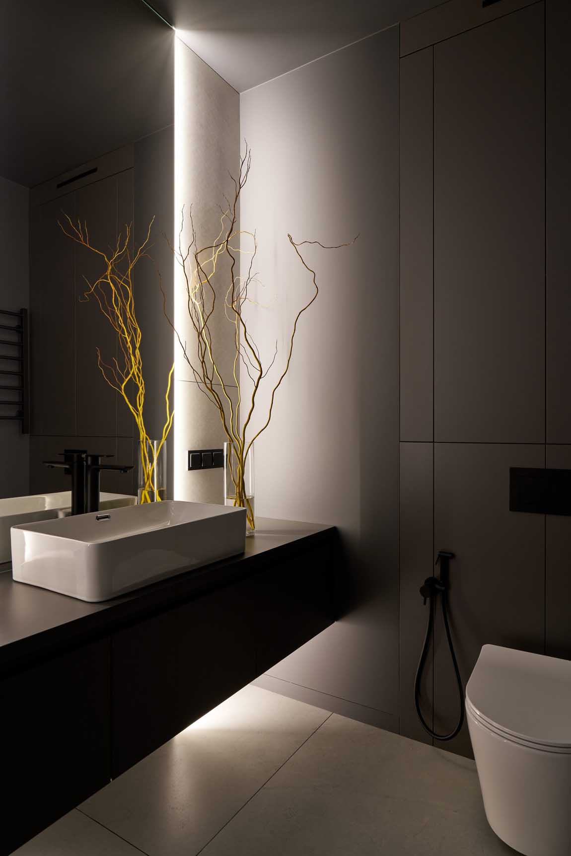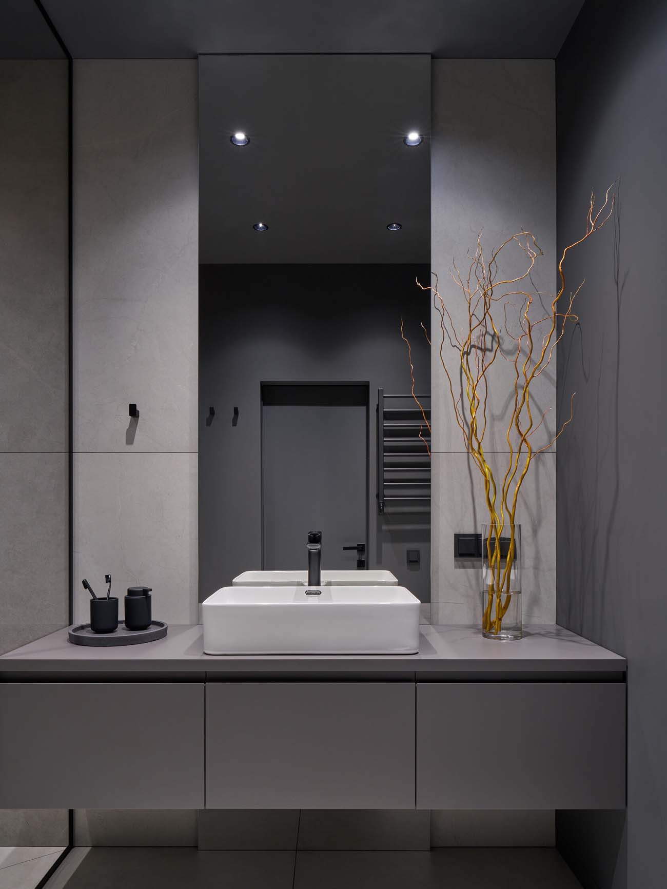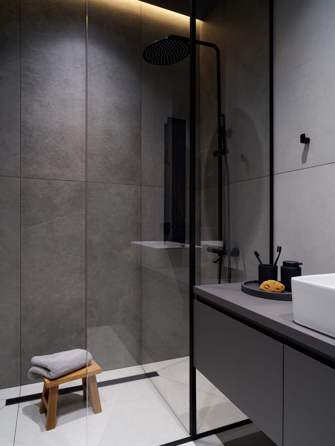 Ebben a fürdőszobában kád helyett csak zuhanyzó kapott helyet, de a tervezés során egy tágas mosdószekrény és egy, a WC-tartály felett elhelyezett, nagyméretű tároló beépítésére is lehetőség nyílt.