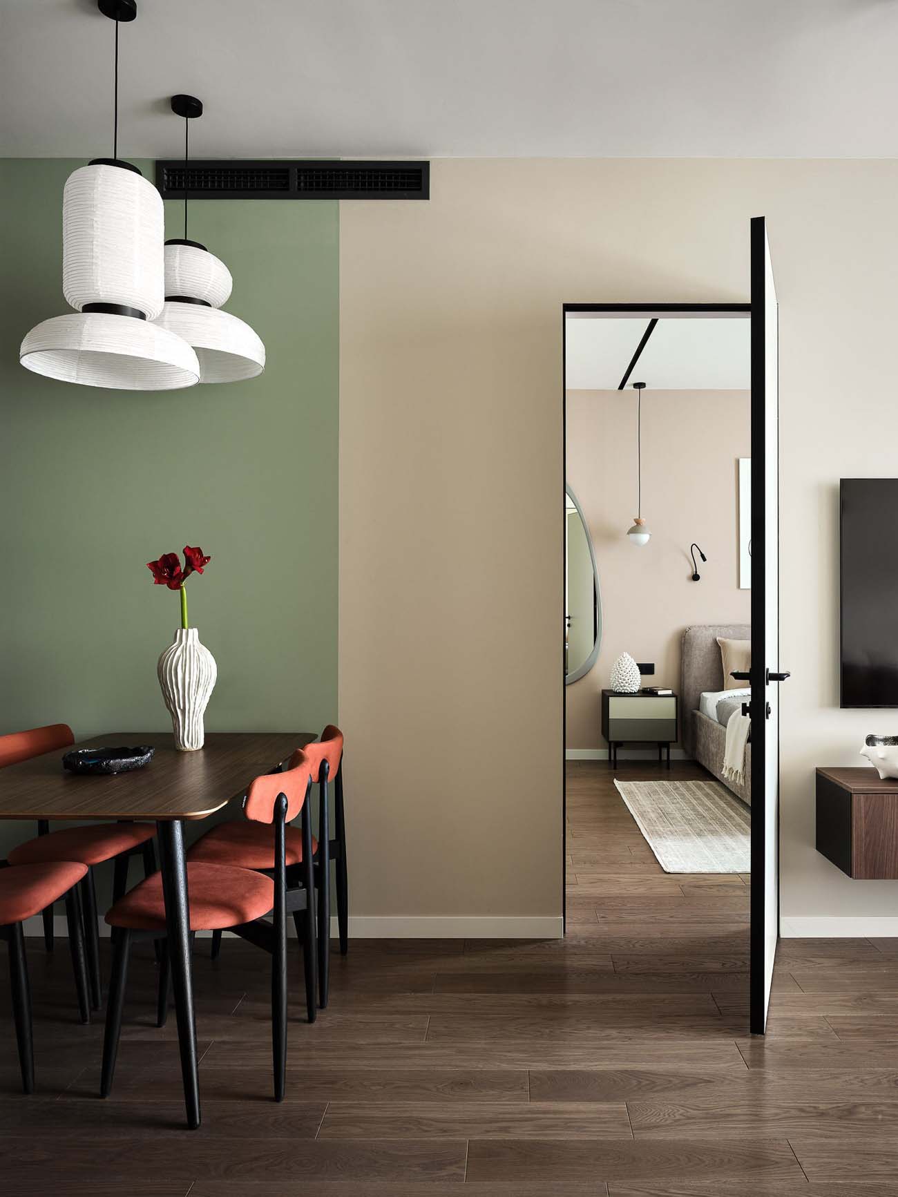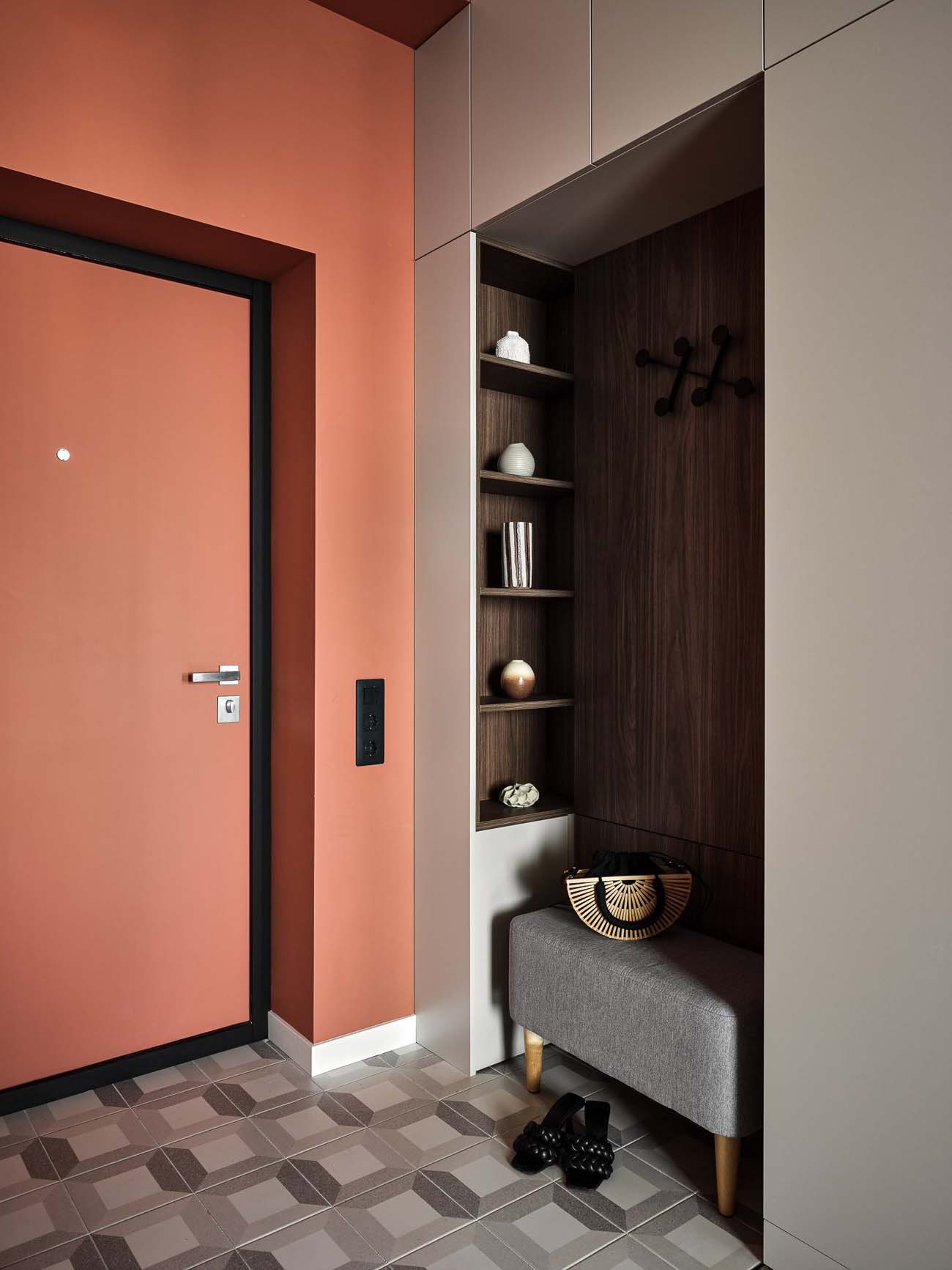 A dekoráció során a color-block technikát alkalmazták, hogy a teret érdekesebbé tegyék. Az előszobát terrakotta színnel emelték ki, amely visszaköszön az étkezőszékek kárpitozásán is. Az étkezőasztal melletti falat egy tompa, szürkészöld árnyalatra festették.