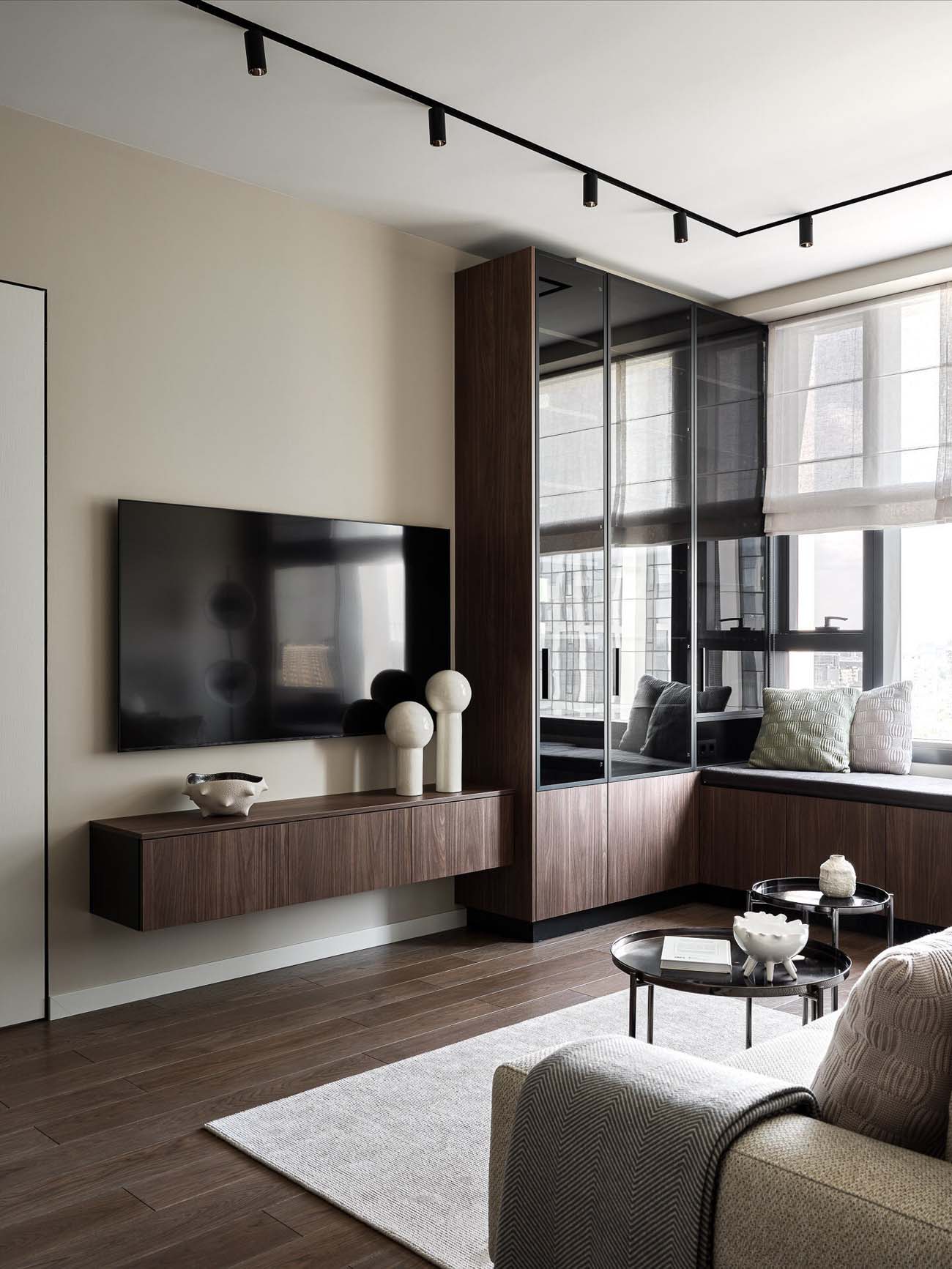 Nagy figyelmet fordítottak a letisztult és nagy tárolókapacitású bútorokra – a tárolórendszerek egyedi megrendelésre készültek. A nappaliban az ablak alatti padot és a szekrényeket egy azonos kivitelű TV-szekrénnyel kötötték össze, ami harmonikus és rendkívül stílusos összhatást eredményezett.