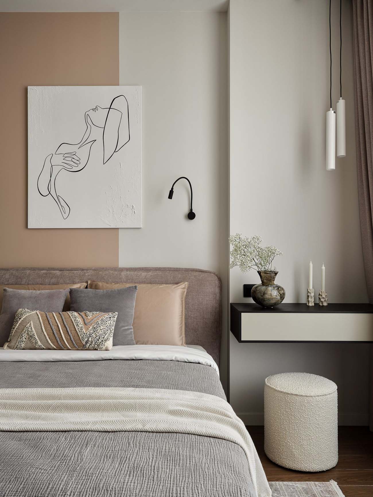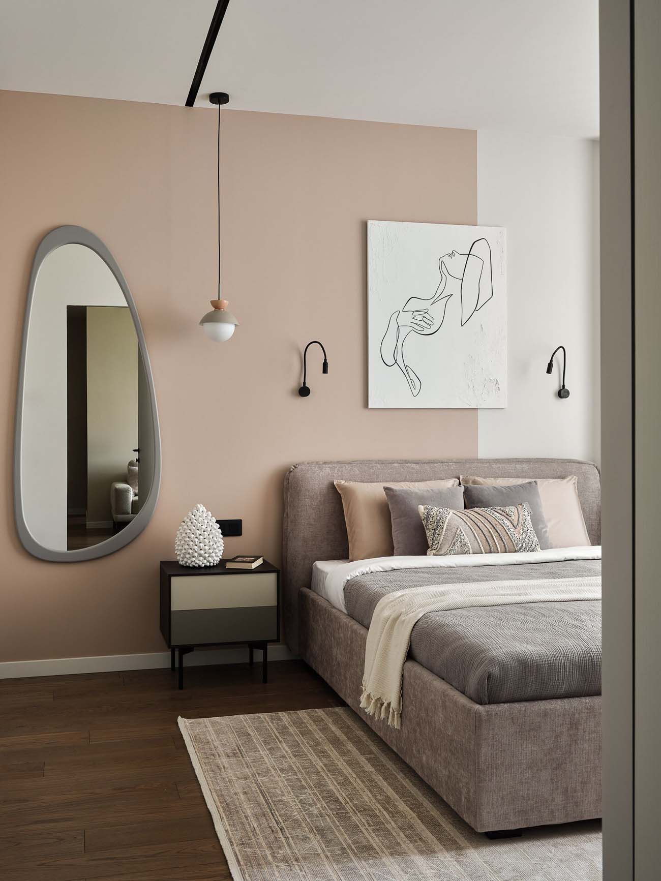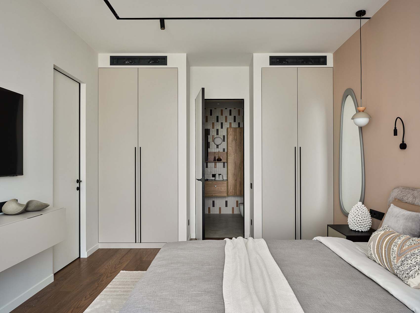 A hálószobában szintén több árnyalatot alkalmaztak, de itt már világosabb, pasztell színeket választottak. Nagy kontrasztok nincsenek, hogy a légkör pihentető és nyugodt legyen. A szobából nyíló fürdő bejáratát két oldalról beépített szekrények keretezik, az ajtó pedig rejtett tokozású modell.