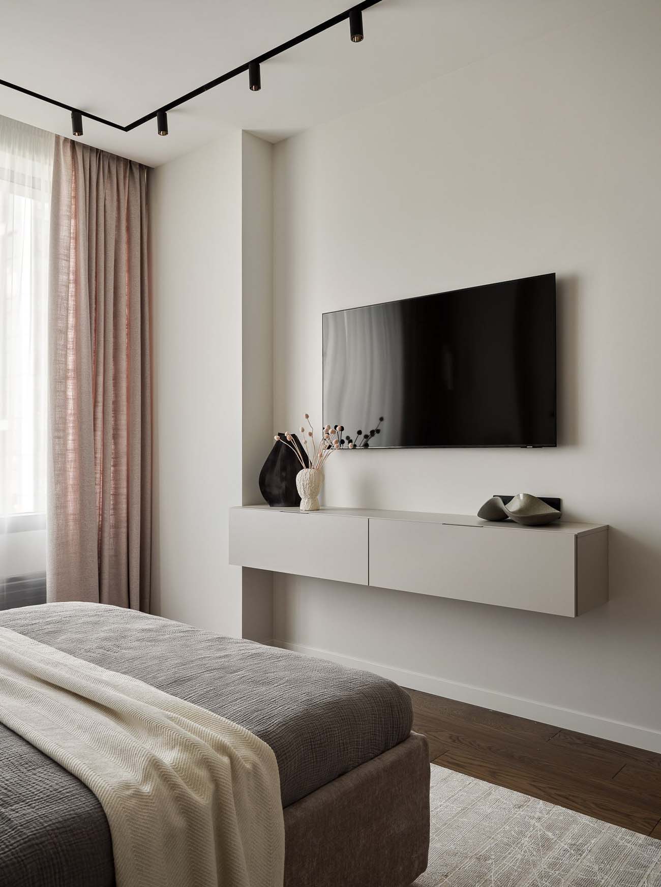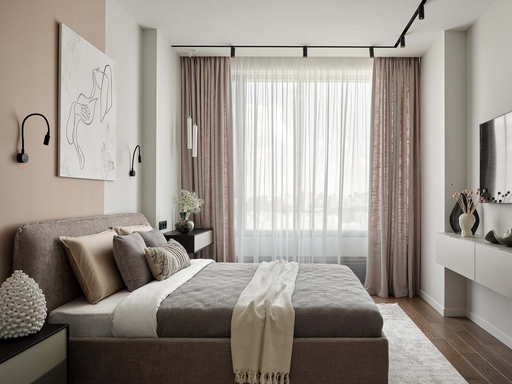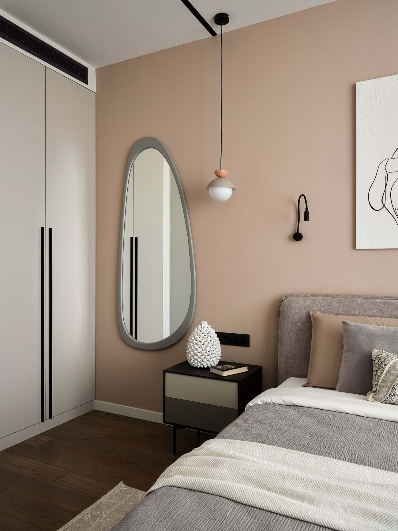 A hálószobában szintén több árnyalatot alkalmaztak, de itt már világosabb, pasztell színeket választottak. Nagy kontrasztok nincsenek, hogy a légkör pihentető és nyugodt legyen. A szobából nyíló fürdő bejáratát két oldalról beépített szekrények keretezik, az ajtó pedig rejtett tokozású modell.