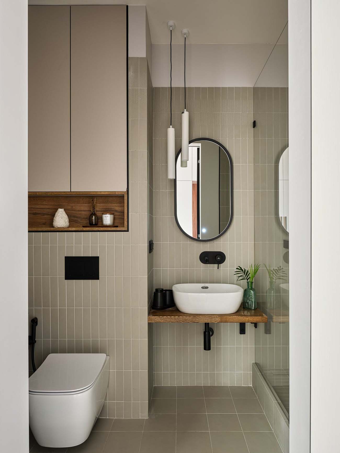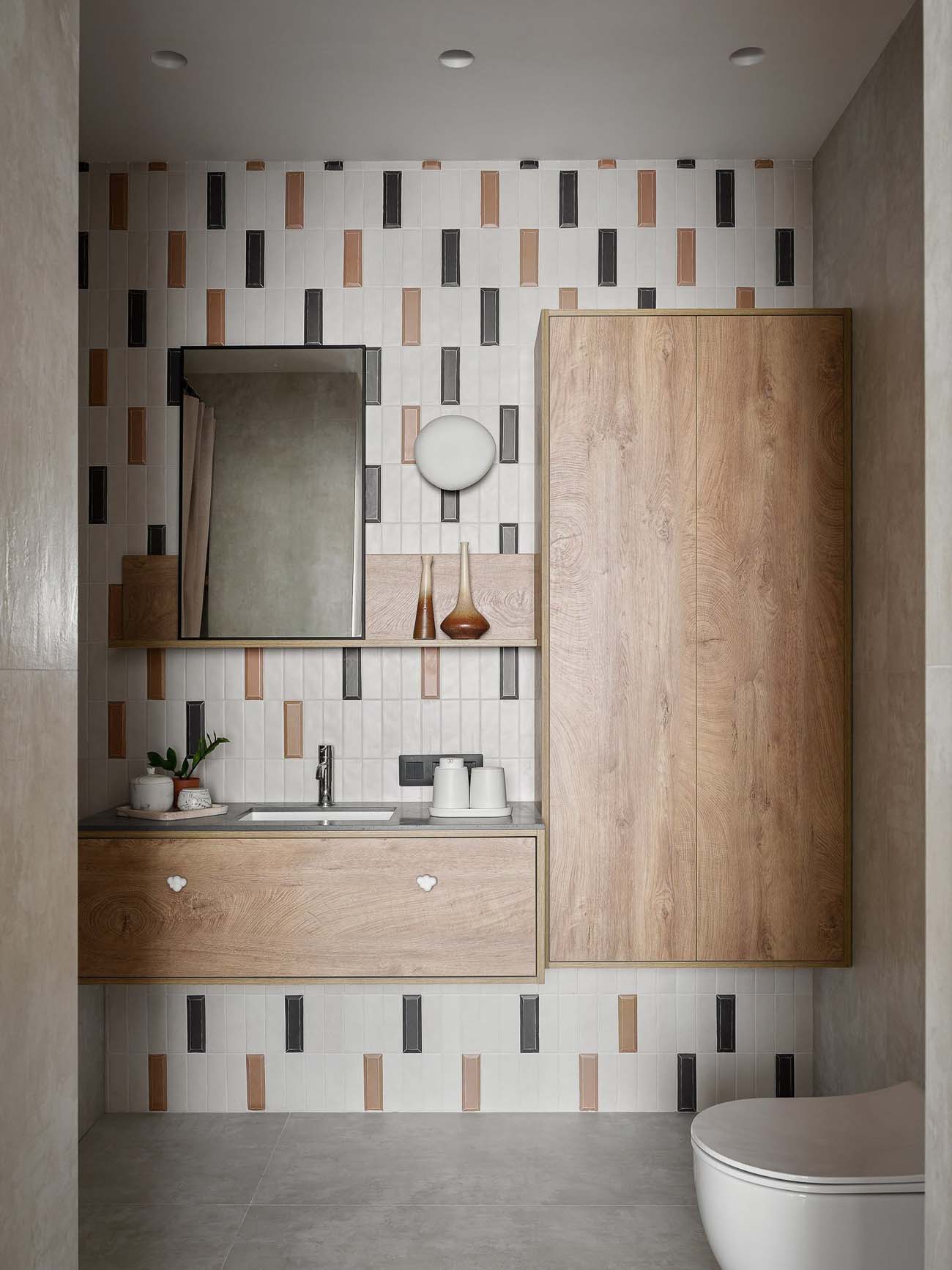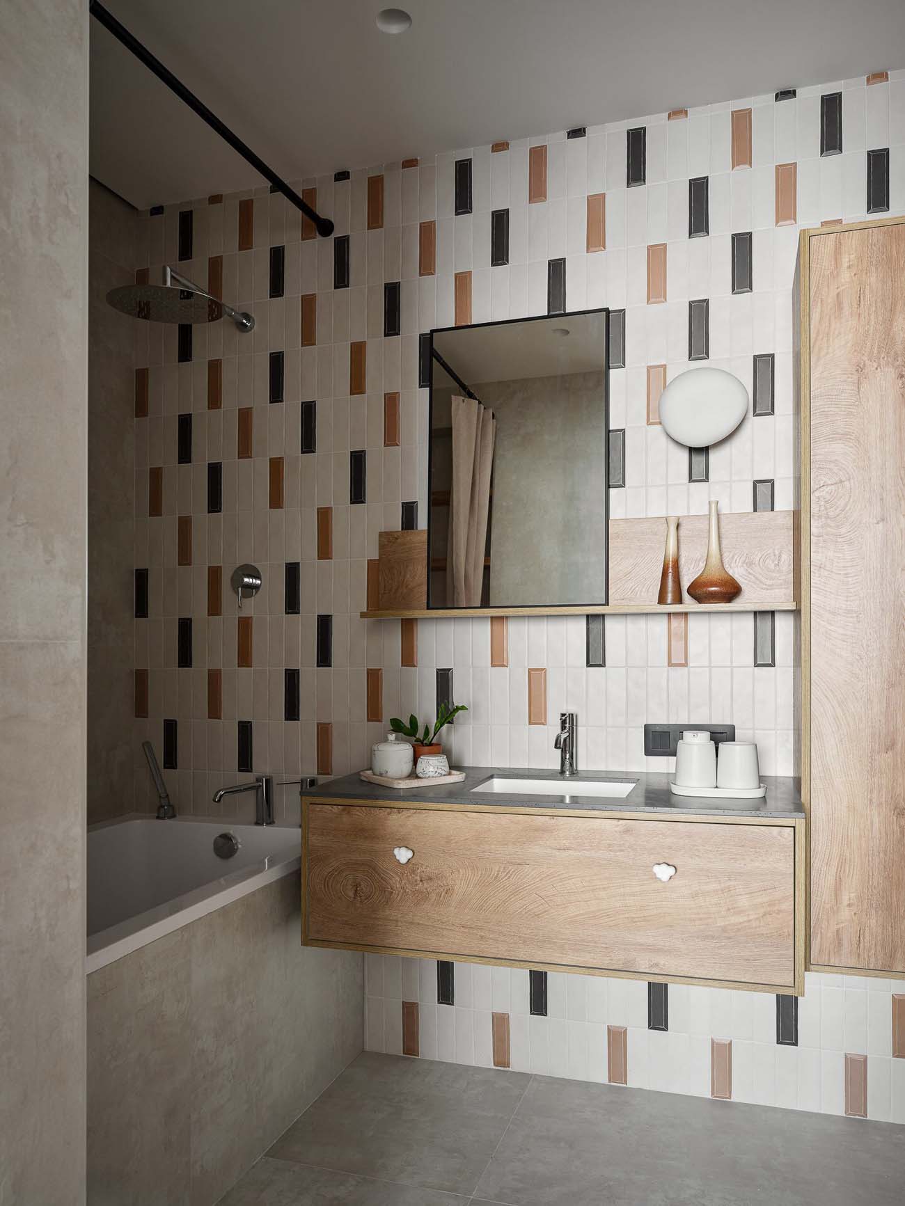 A fürdőszoba burkolásához több árnyalatú, kisméretű csempét választottak, amelynek érdekes lerakási mintája különlegessé teszi az enteriőrt. A padlón és a többi falon nagyméretű greslapokat használtak.