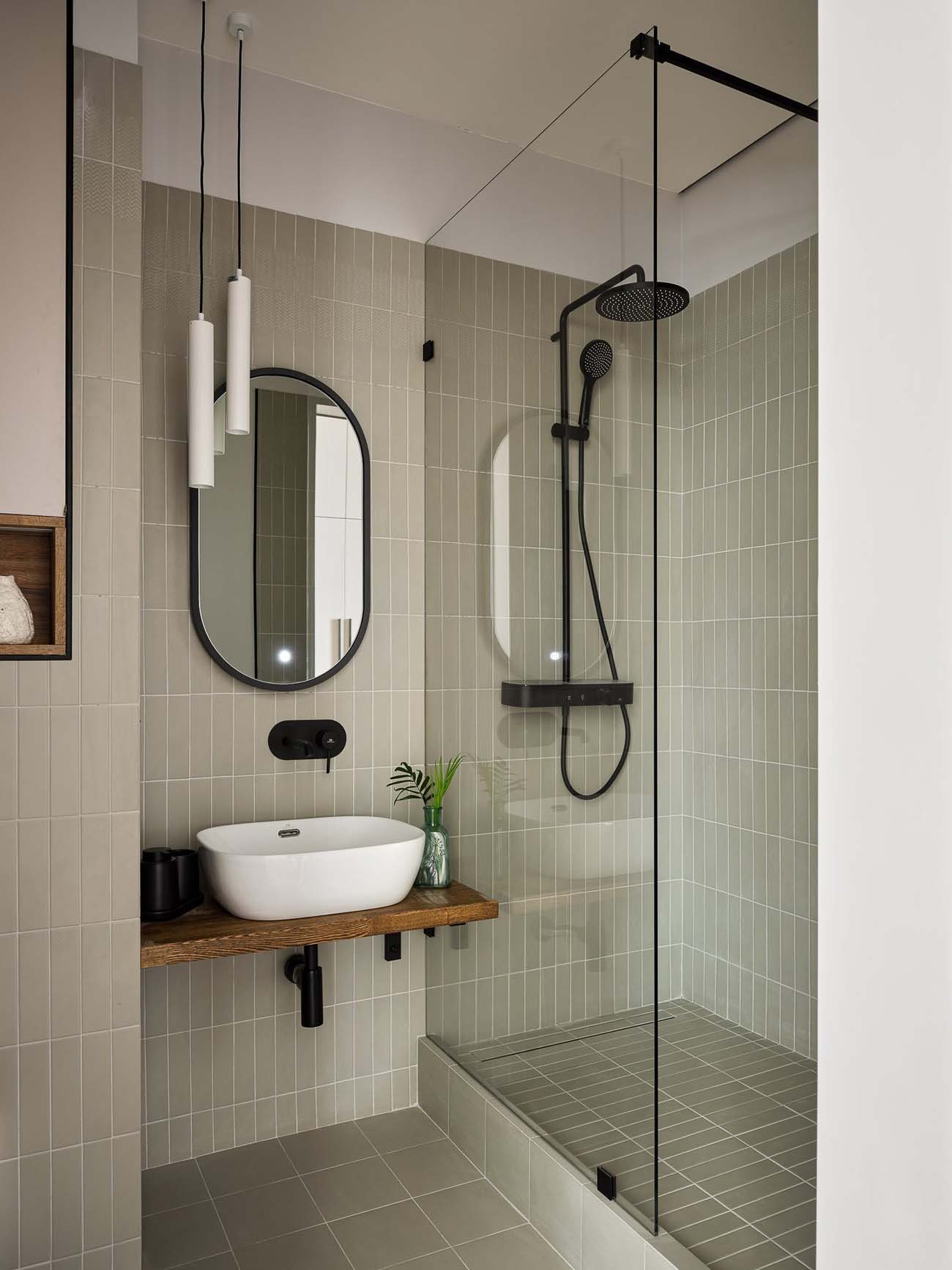 A második, zuhanyzós fürdőszoba egyszínű csempeburkolatot kapott. A fekete részletekkel kiegészítve stílusos és modern hatást kelt.