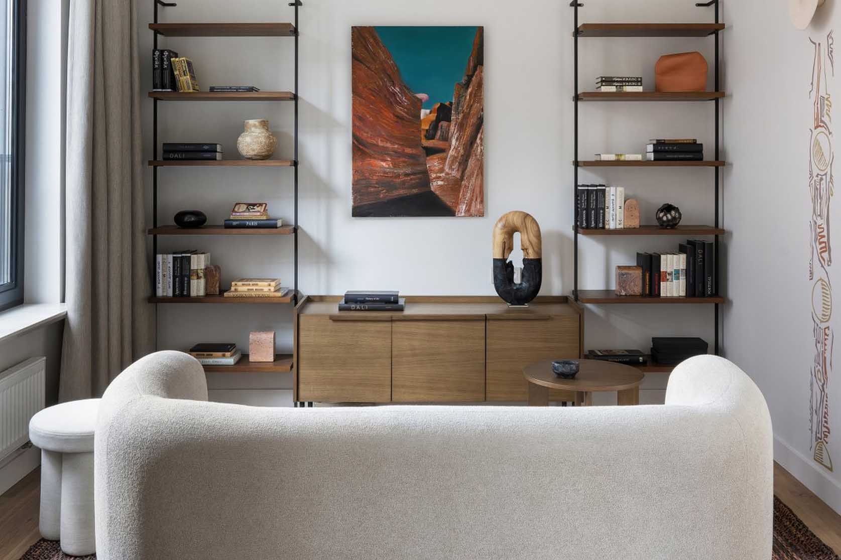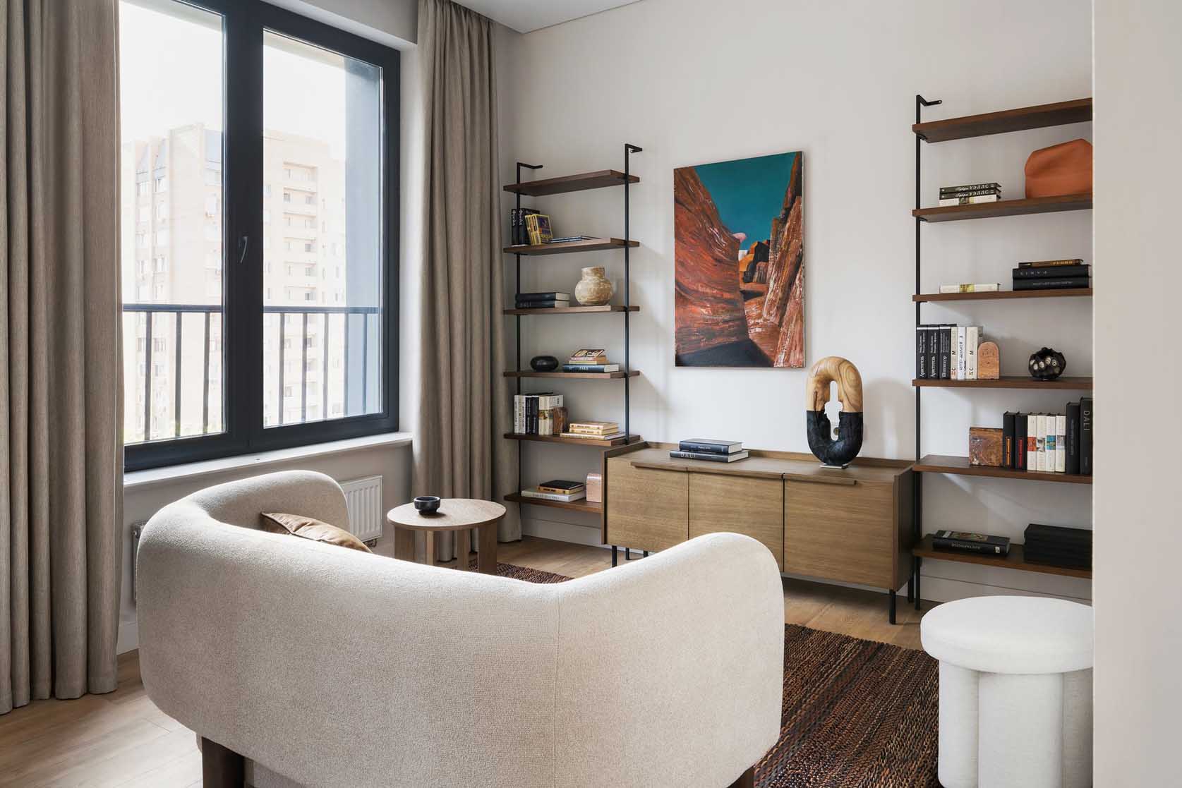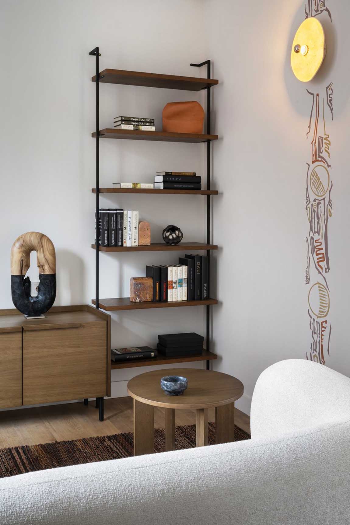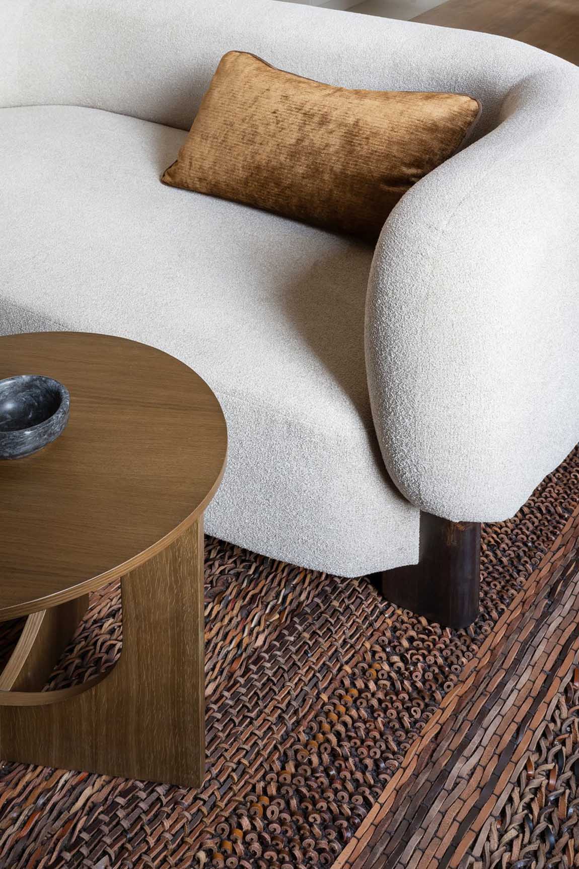 A nappali zónájában a dekoráció minden eleme – a különleges formájú vázák, a kézzel festett faldekoráció (múzeumi minták alapján újragondolt motívumok), az egyedi fali lámpa, a könyvek és a fonott bőrre emlékeztető szőnyeg – a tapintható luxust és a kézművességet hirdeti.