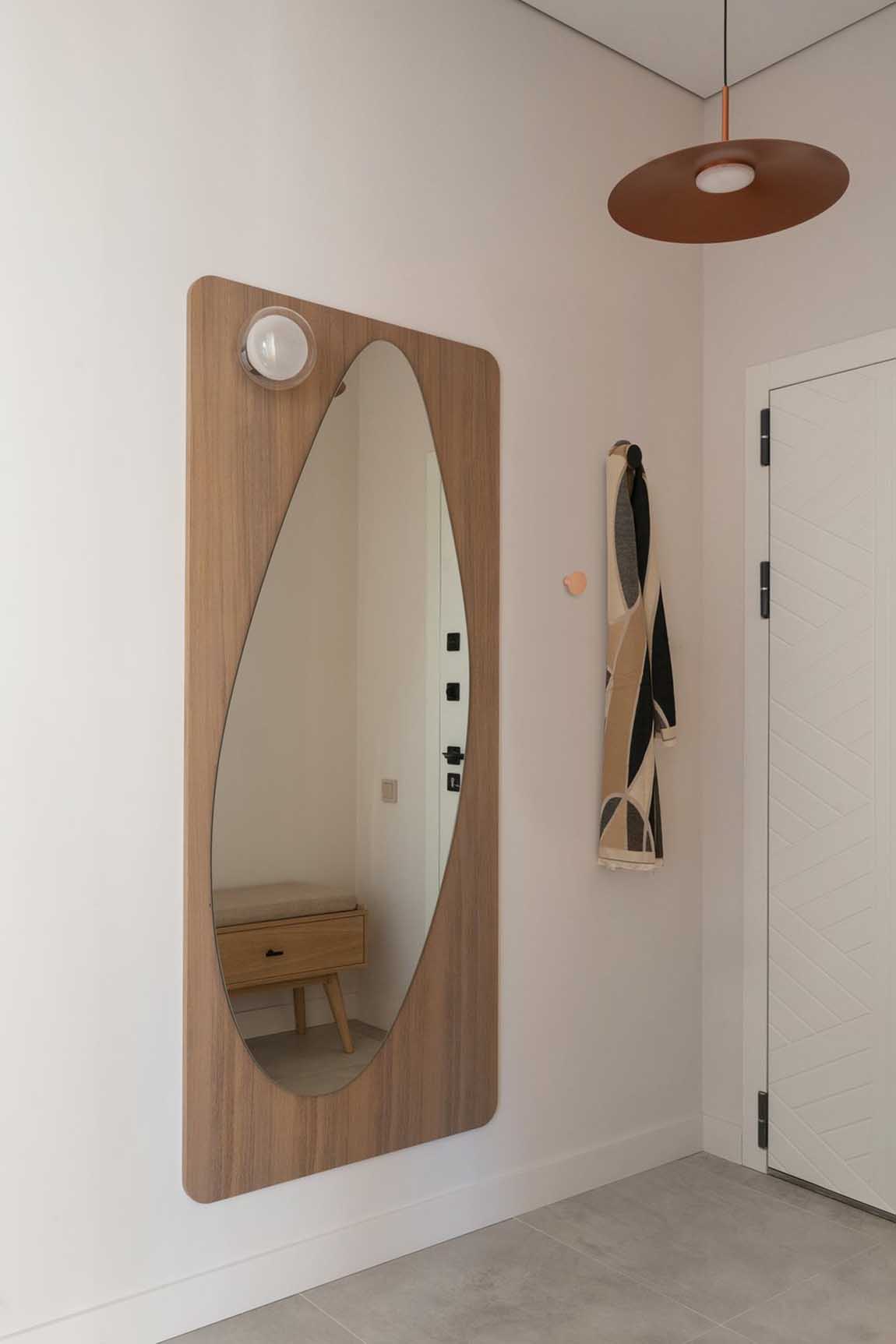 Az előszoba központi eleme egy masszív fa alapra rögzített, szokatlan formájú tükör, amely vizuálisan összeköti a tér különböző vonalait és textúráit, egységes keretbe foglalva az enteriőrt.