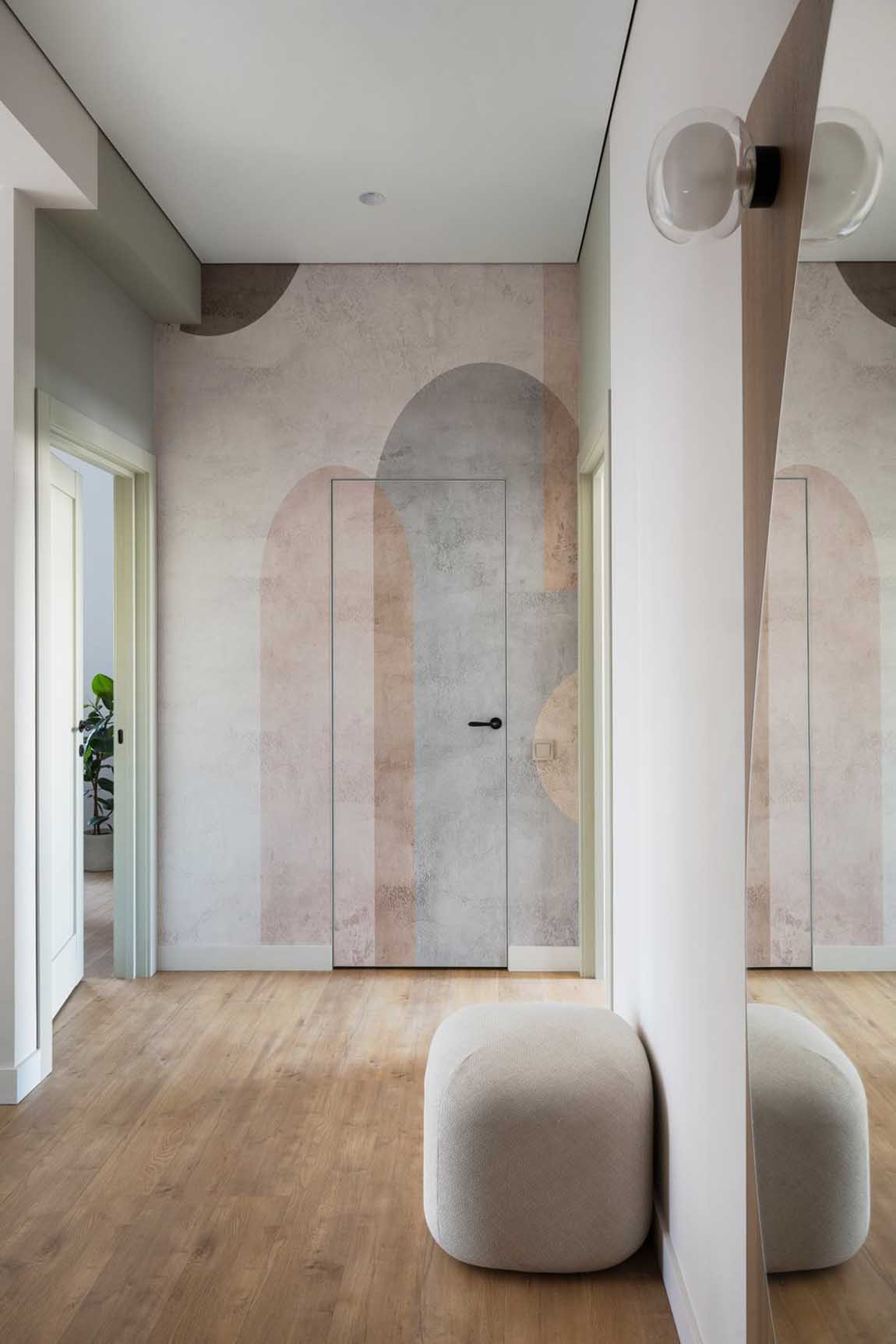 Innen nyílik az egyik önálló gardróbhelyiség is. A tervező különös figyelmet fordított arra, hogy a tároló funkció ne uralja a látványt: a gardrób ajtaját egy ötletes megoldással, boltíveket ábrázoló falfestéssel maszkolták el. Ez a vizuális trükk lágyítja a nyílászáró kontúrjait, és inkább dekoratív falfelületként, semmint ajtóként érzékelteti azt.