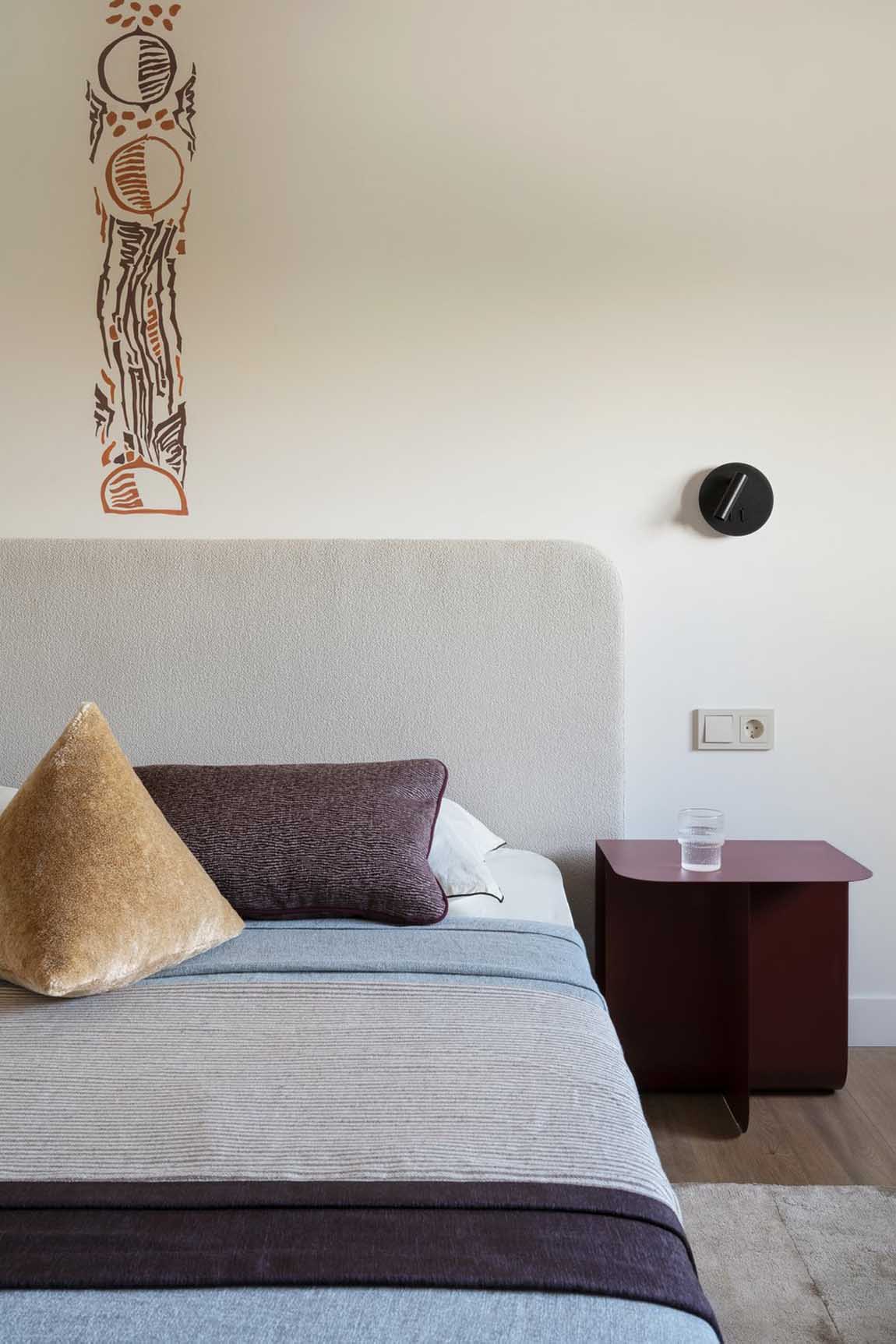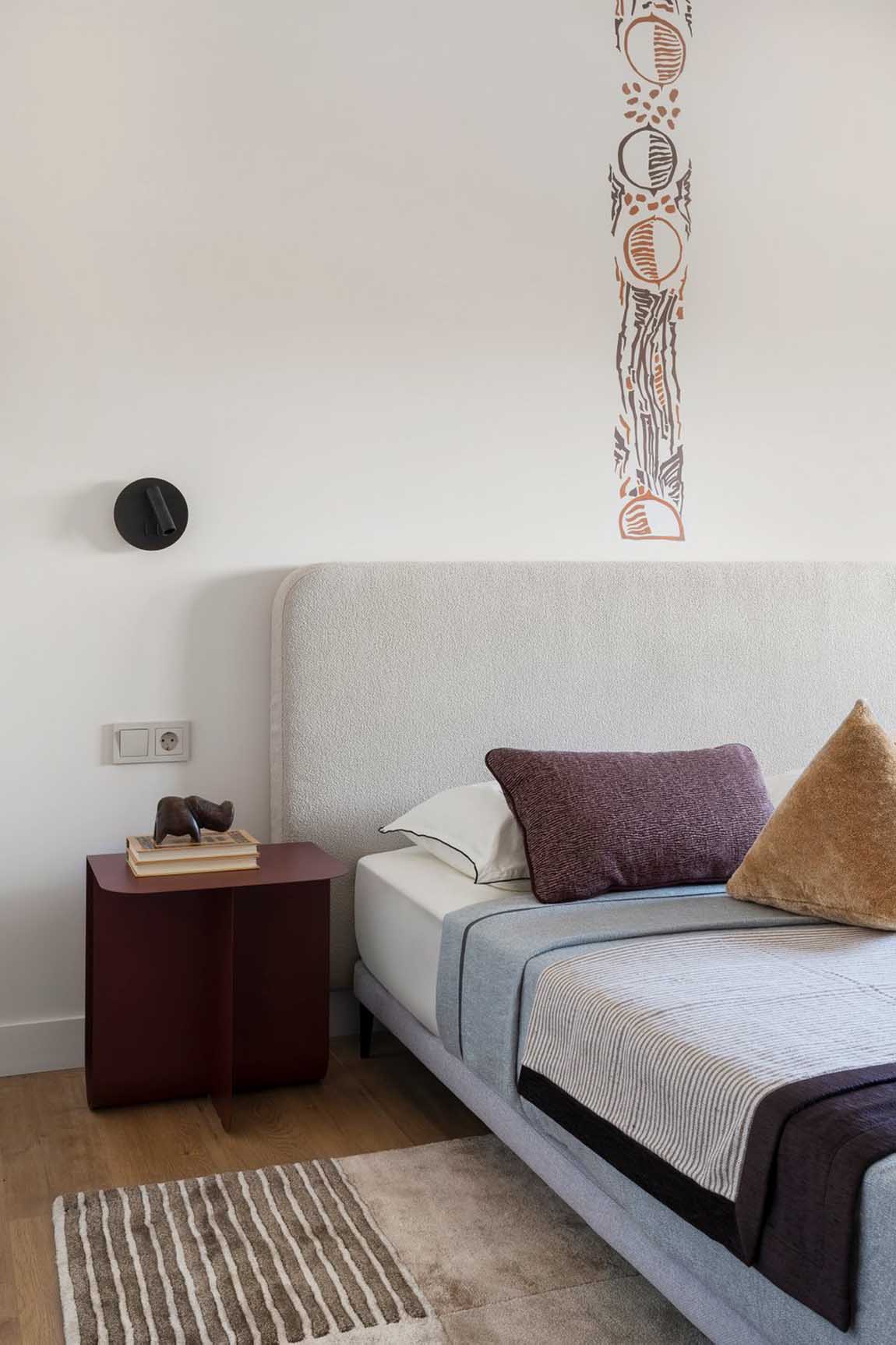 A tágasabb szülői hálóban az ablak melletti területet egy dolgozósaroknak dedikálták, amelyet a színek és a lokális világítás különít el finoman a pihenőzónától. Az afrikai hatás itt leheletfinom: a kontinens hangulata az egyedi falfestésen, valamint a díszpárnák formavilágán és textúráján keresztül szűrődik be. Mindkét szobába egyedi méretre gyártott ágyak kerültek a maximális helykihasználás érdekében.
