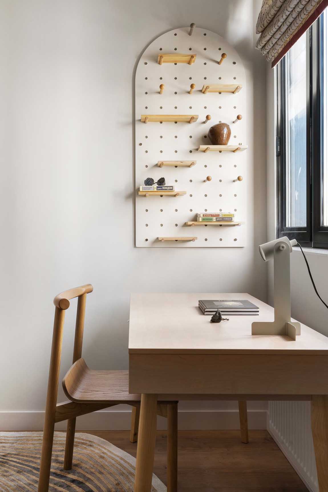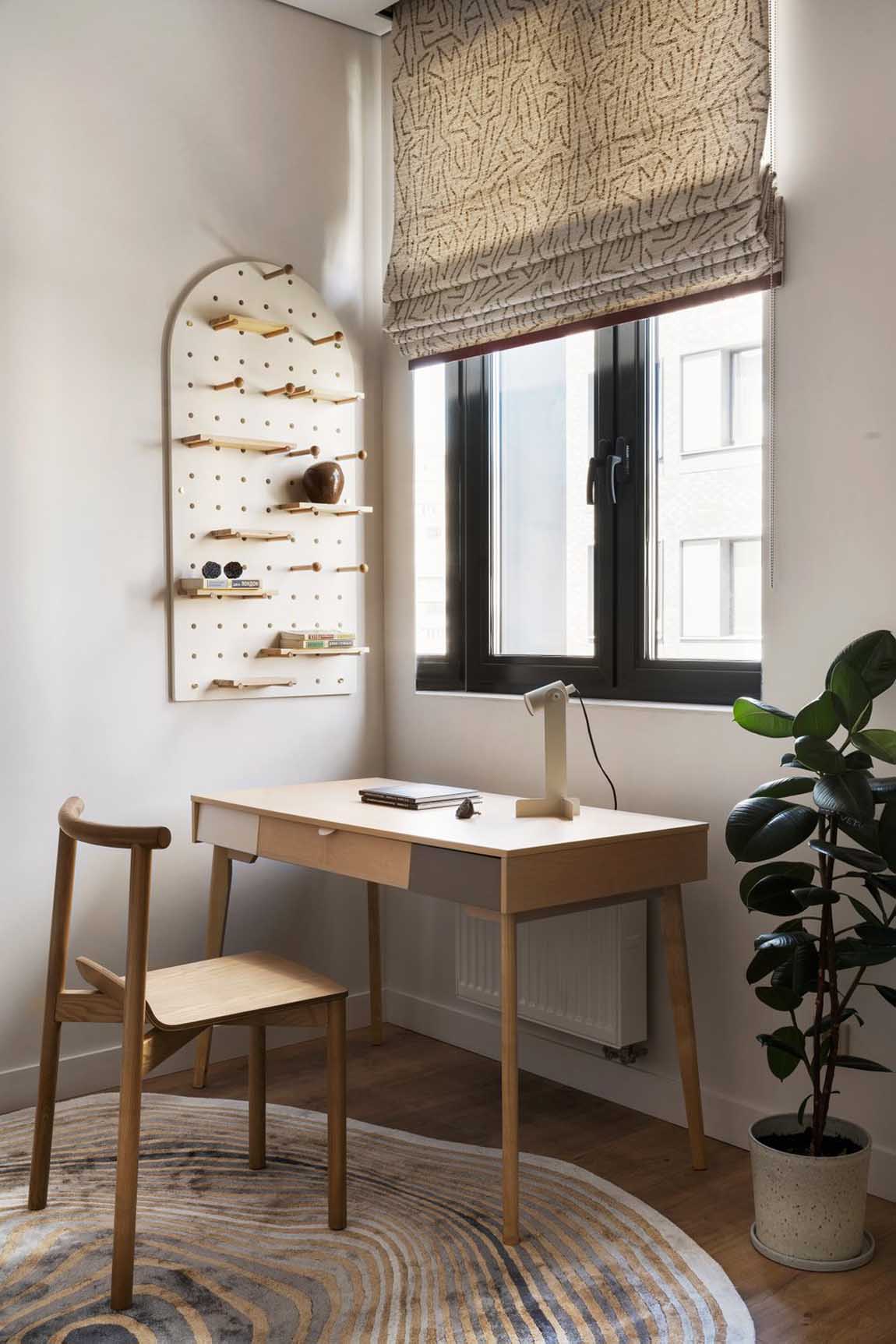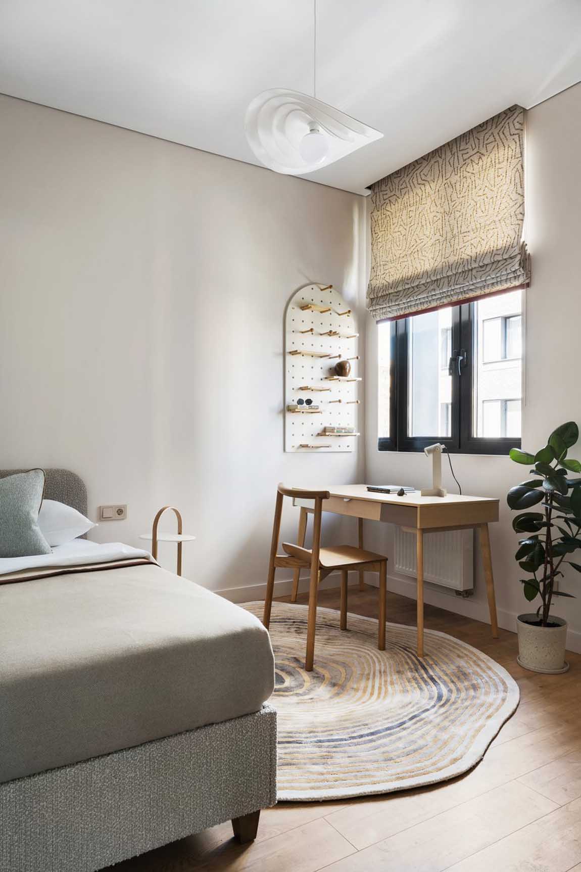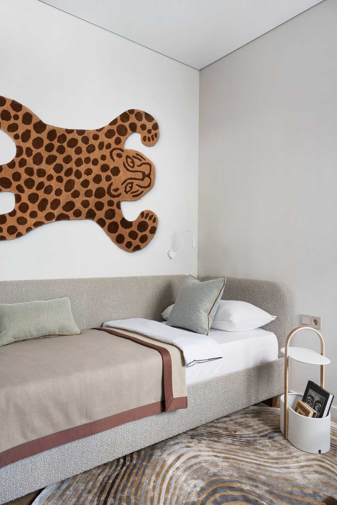 A gyerekszoba kialakításánál a rugalmasság volt a fő szempont. A beépített fülkében elhelyezett tágas szekrény bőséges tárolóhelyet kínál a játékoknak és ruháknak. A szoba hangulatát egy játékos, tigrist ábrázoló falikárpit teszi barátságossá és gyermekivé, megőrizve a lakás egységes stílusvilágát.