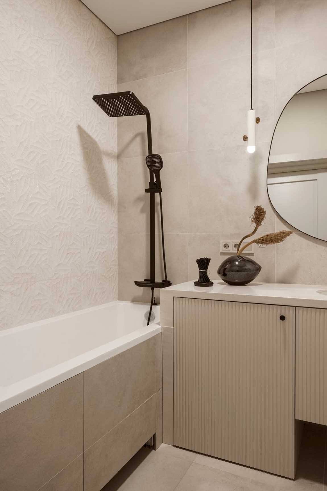 A vizesblokk tervezésekor a textúrák kaptak főszerepet. A padlót természetes kőhatású kerámia borítja, míg a vízzel közvetlenül nem érintkező falfelületekre dekoratív, vízálló vakolat került, amely tapintásra a bársonyos agyagot idézi. A tárolást itt is diszkréten oldották meg: a kád alatti előlap mögött és a lebegő szekrényekben minden fürdőszobai kellék kényelmesen elfér, fenntartva a letisztult, spa-szerű összhatást.