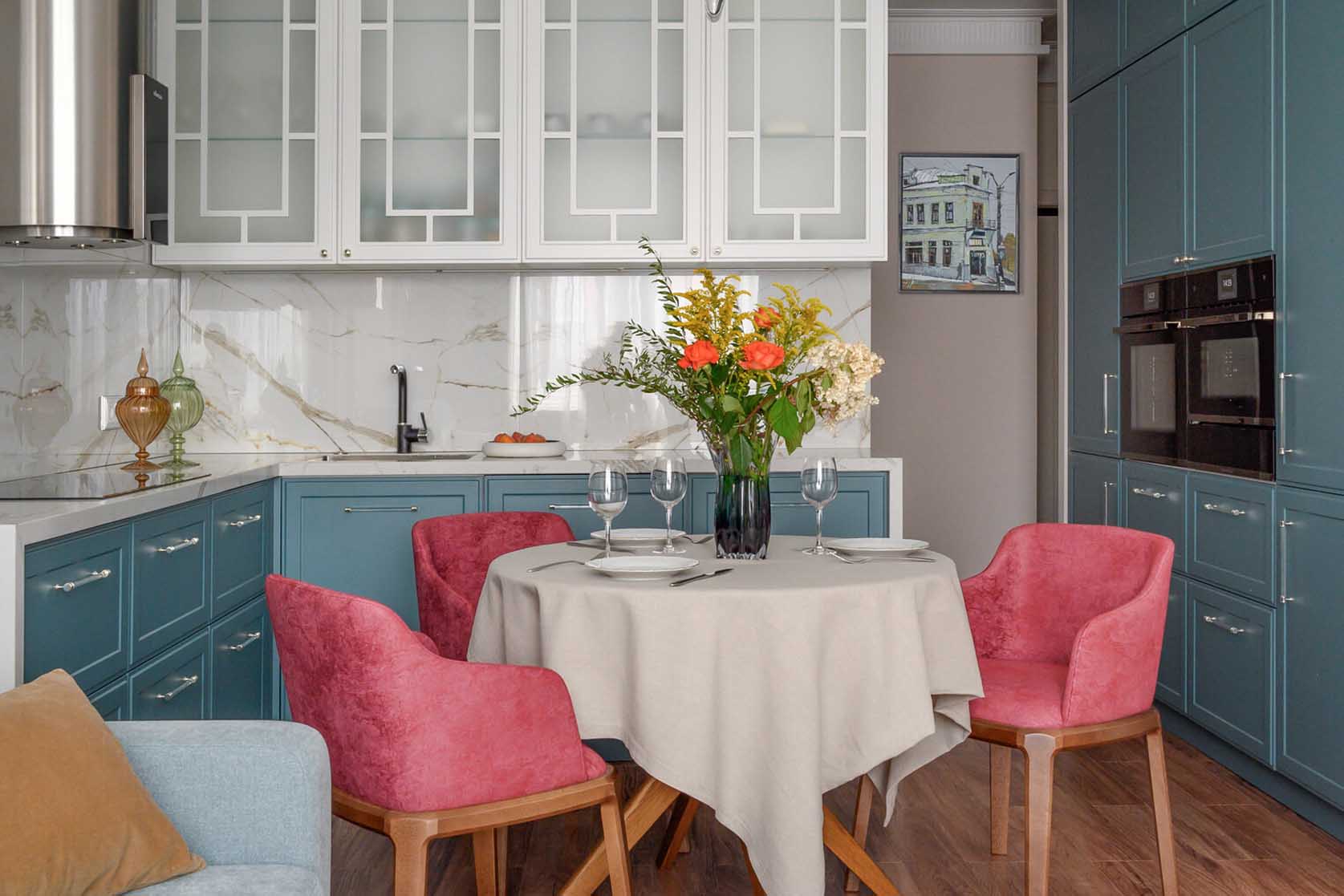A konyhabútor egyedi tervek alapján készült, bőséges tárolókapacitással és csúcsminőségű beépített gépekkel felszerelve. A frontok festett MDF-ből készültek, míg a munkapult és az oldalfalak Calacatta márványt utánzó műkövet kaptak. A neoklasszikus stílus egyik szigorú szabályát követve minden szekrényajtó azonos szélességű. A konyhai hátfalat tükörhatású, „pillangó” mintázatba forgatott nagyformátumú greslap borítja, ami tovább tágítja a teret.