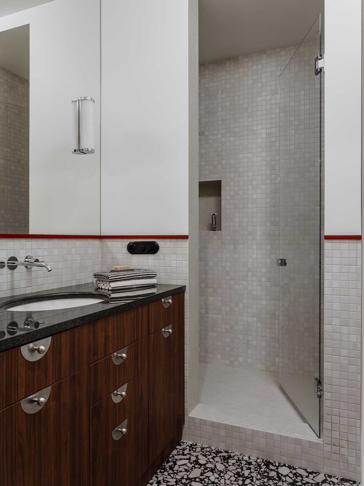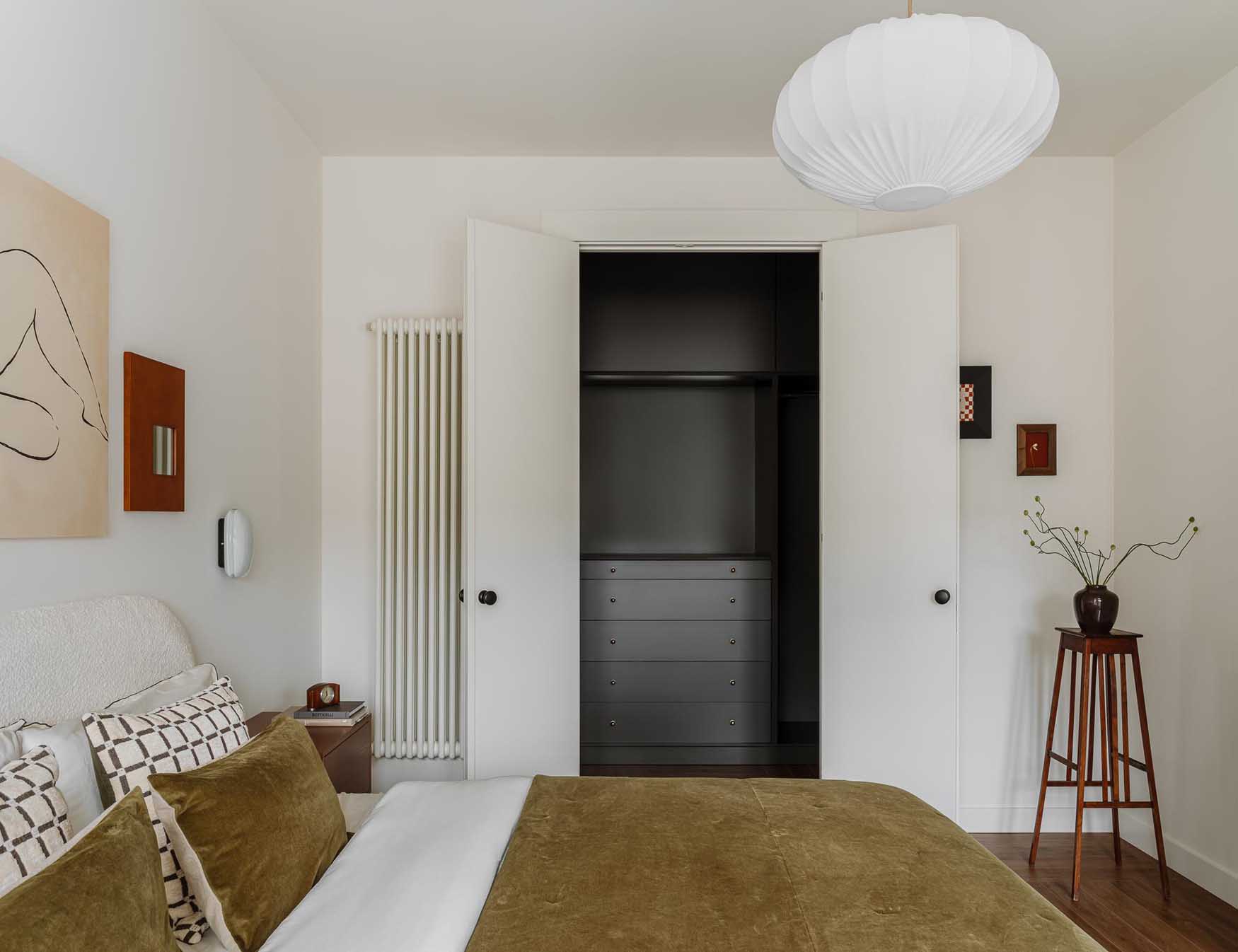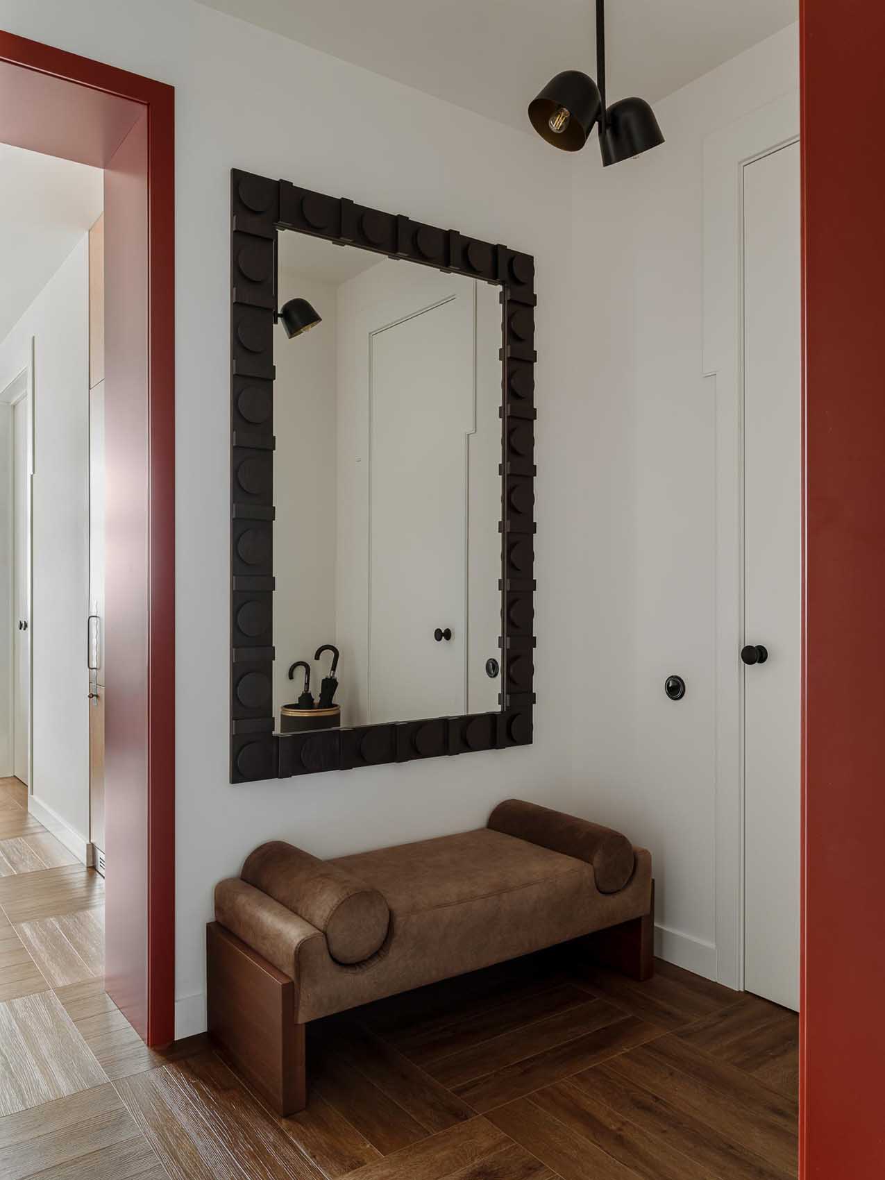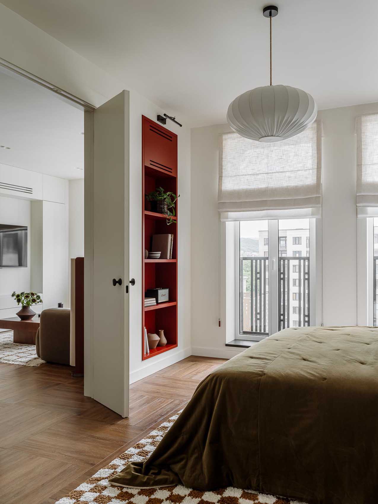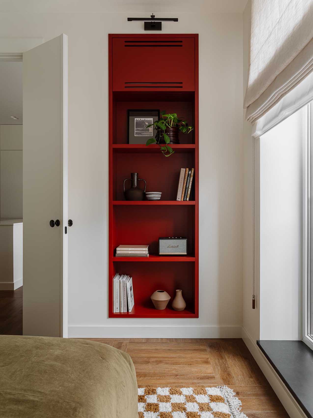 Az ergonomikus térelválasztás és zónázás érdekében a tervező megnövelte a falat a hálószoba és a nappali között, és a létrejött fülkébe egy hangsúlyos vörös polcot, valamint a légkondicionáló beltéri egységét építették be.