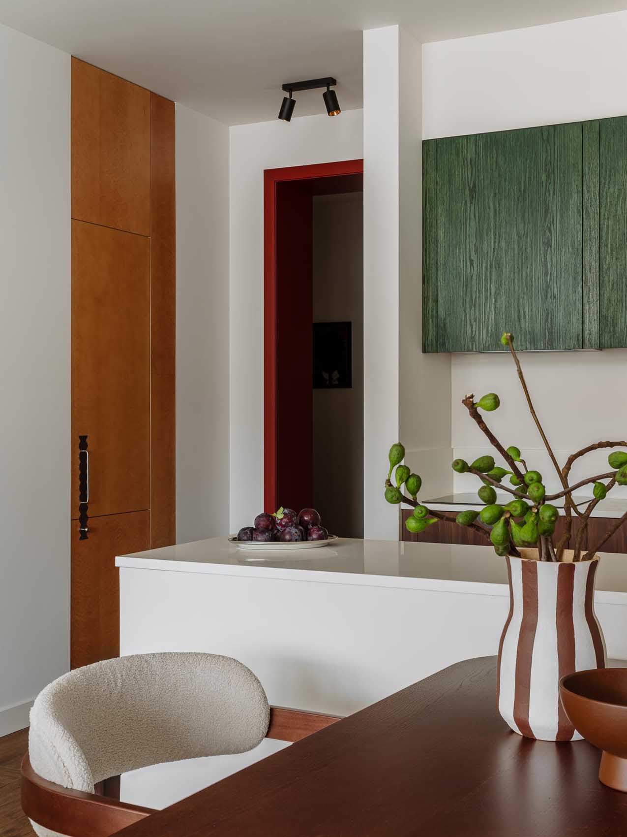 A meleg, természetes palettát egy különleges elem folytatja – az átjáró melletti hűtőszekrény, amelyet gyönyörű madárszemes juhar furnér front mögé rejtettek. A fa frontot szándékosan továbbfuttatták a mennyezetig, hogy az harmonizáljon az előszobába vezető megnövelt átjáróval.