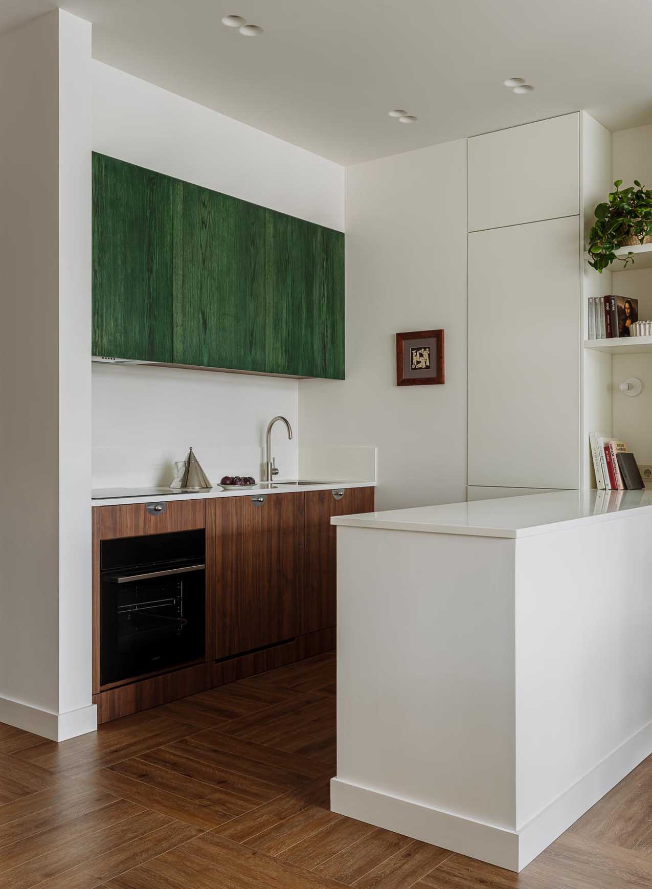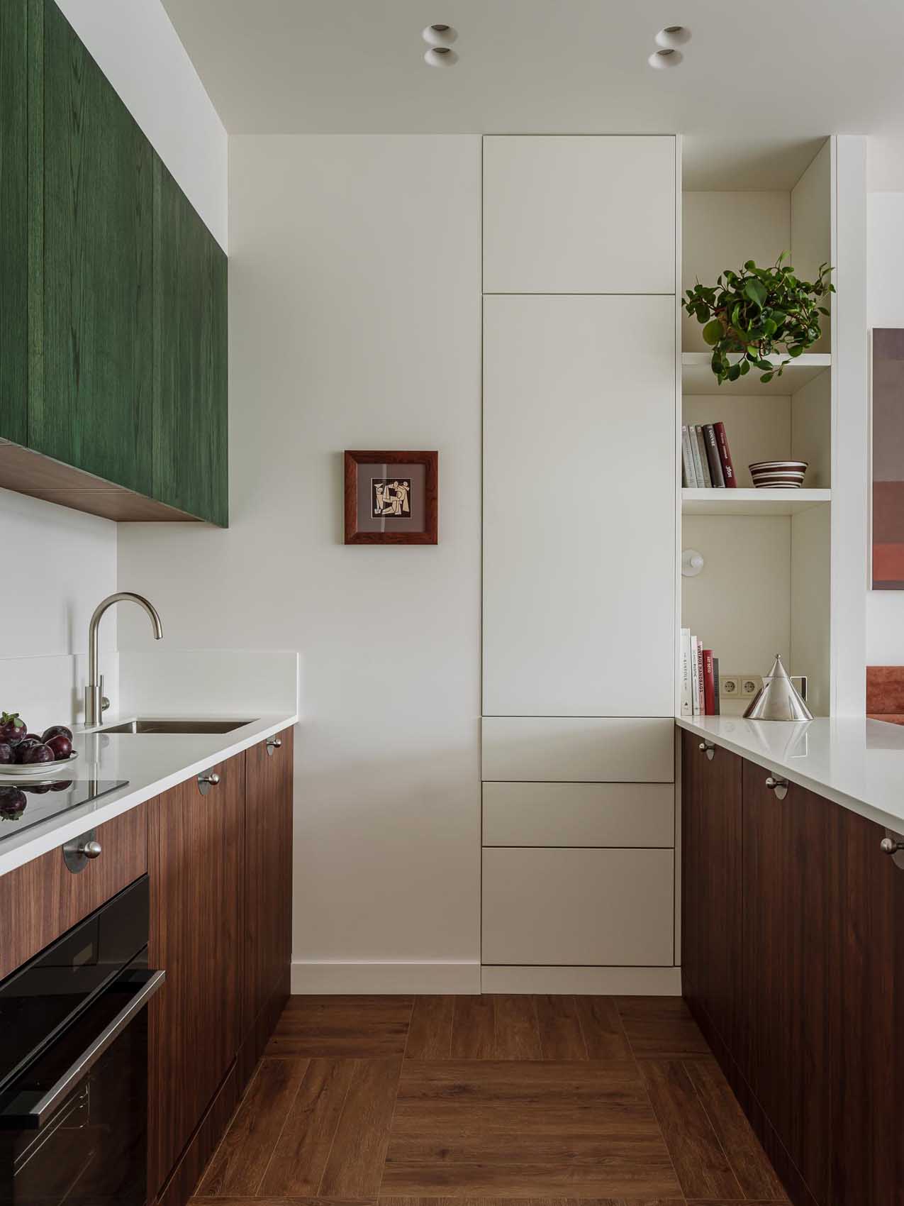 A konyha kifejezetten karakteres lett. A tejfehér falszínnel kontrasztban kiemelkednek a zöld olajjal kezelt, egyedi tölgy furnérból készült felső szekrények. Még a fogantyúk is tervezői vázlat alapján készültek egy műhelyben. A korlátozott költségvetés miatt az alsó modulokat költséghatékonyabb laminált lapból készítették, de a felső elemek színének köszönhetően a konyha mégis látványos és egységes benyomást kelt.