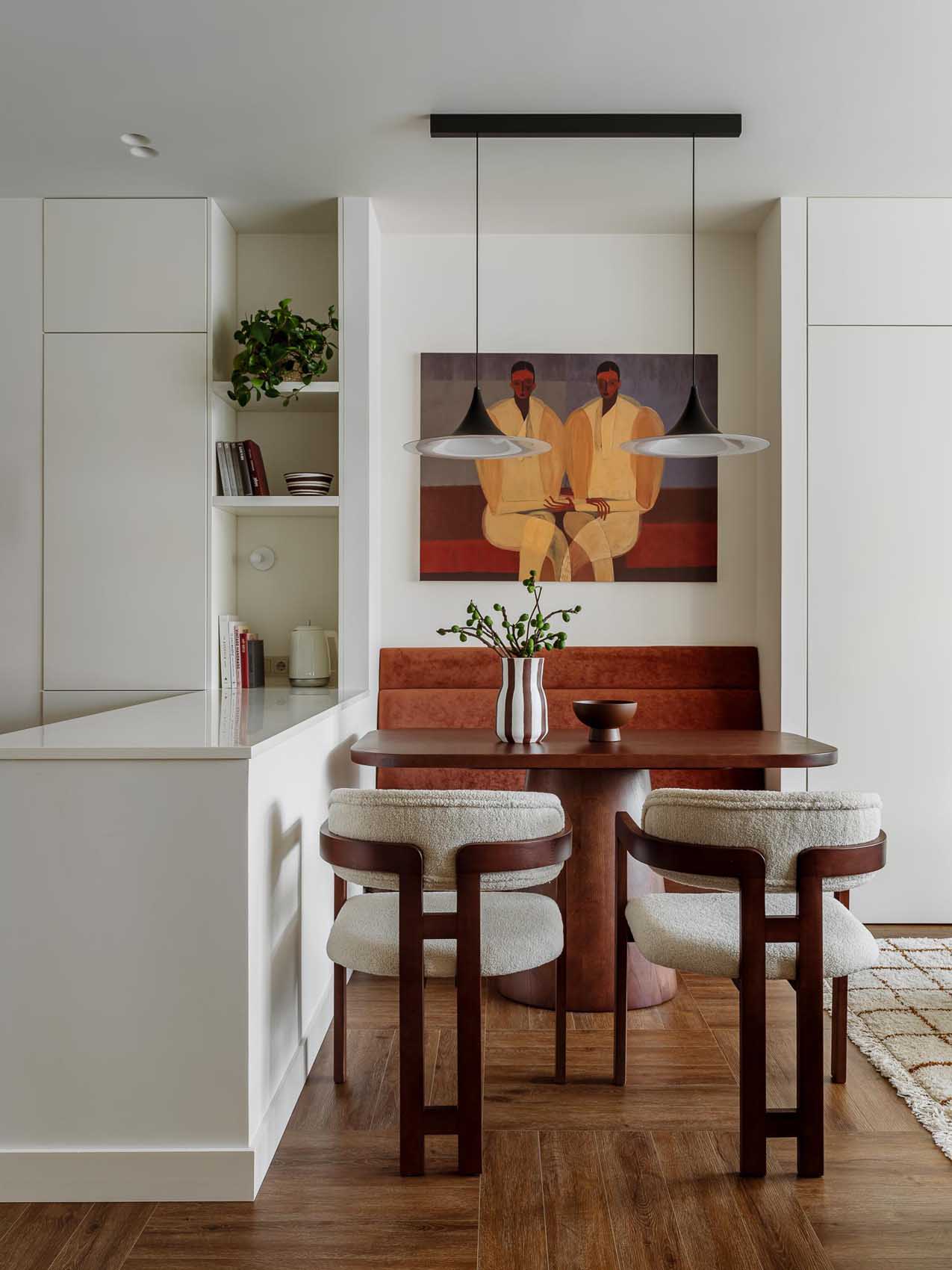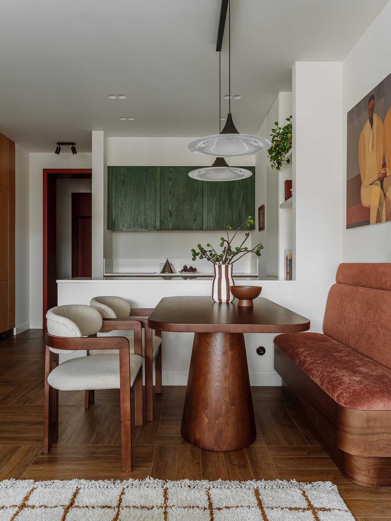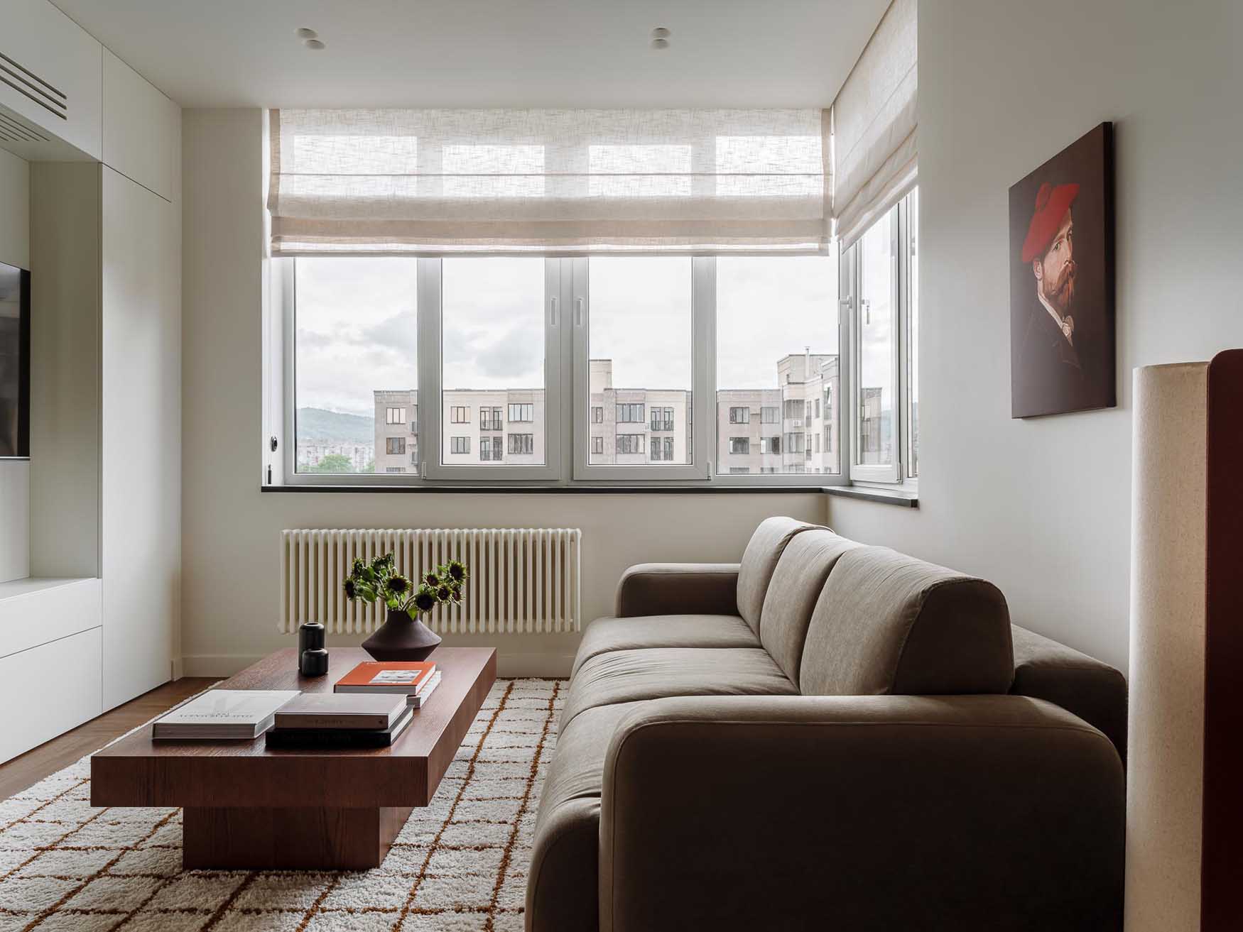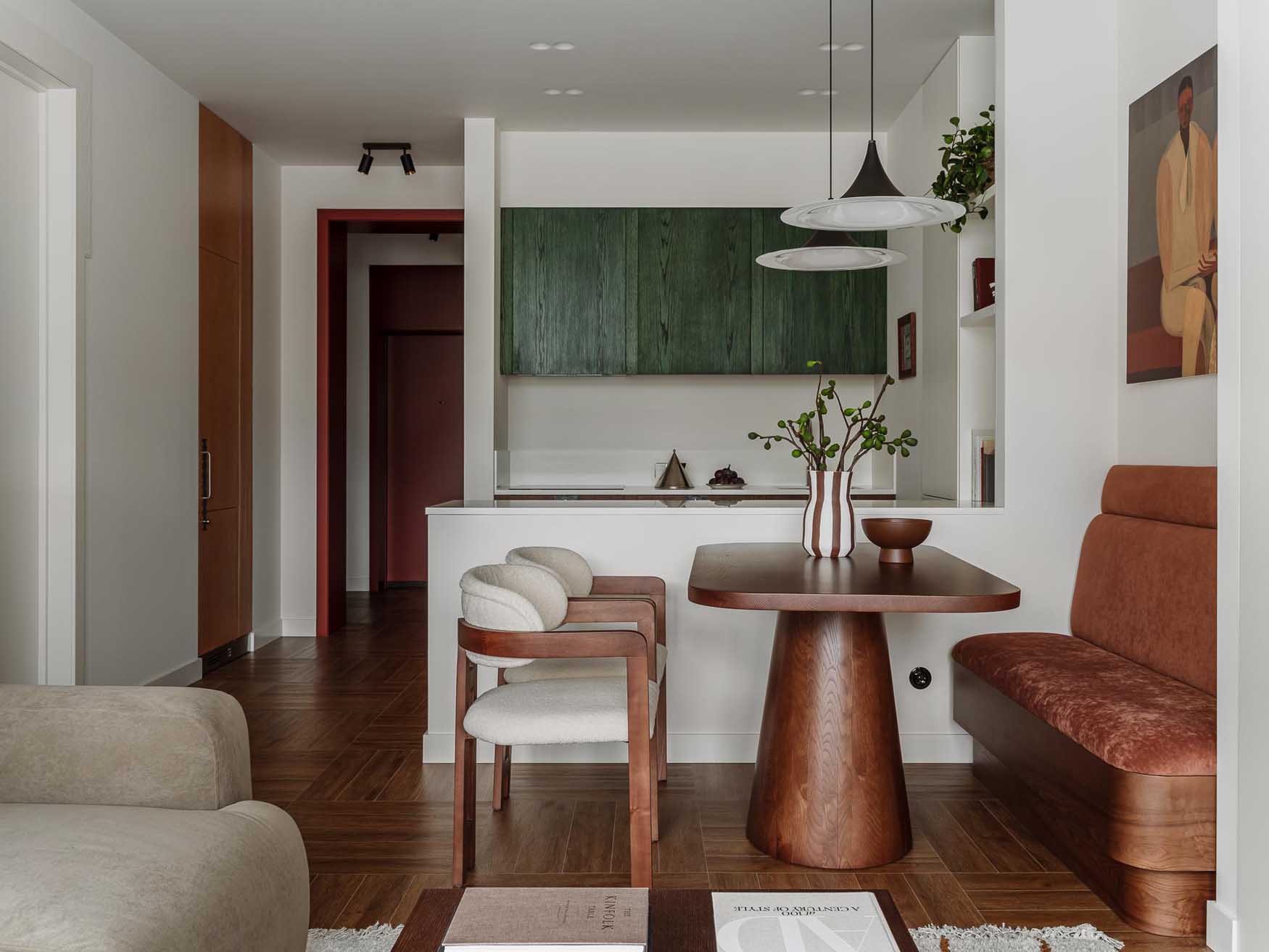 A 63 m²-es lakás férfi tulajdonosa egy másik városban él, de sokat dolgozik a fővárosban, így ezt a lakást második otthonként használja. A tervező arra törekedett, hogy az új építésű lakásban belakott érzetet keltsen – ebben a vintage elemek segítettek: pl. egy régi stílusú mennyezeti lámpa a fürdőszobában, vagy az olasz falikarok az ágy két oldalán. Ebben az enteriőrben sok az egyedi gyártású bútor – csak a kanapé, az étkezőszékek és a textíliák származnak nagyáruházból.