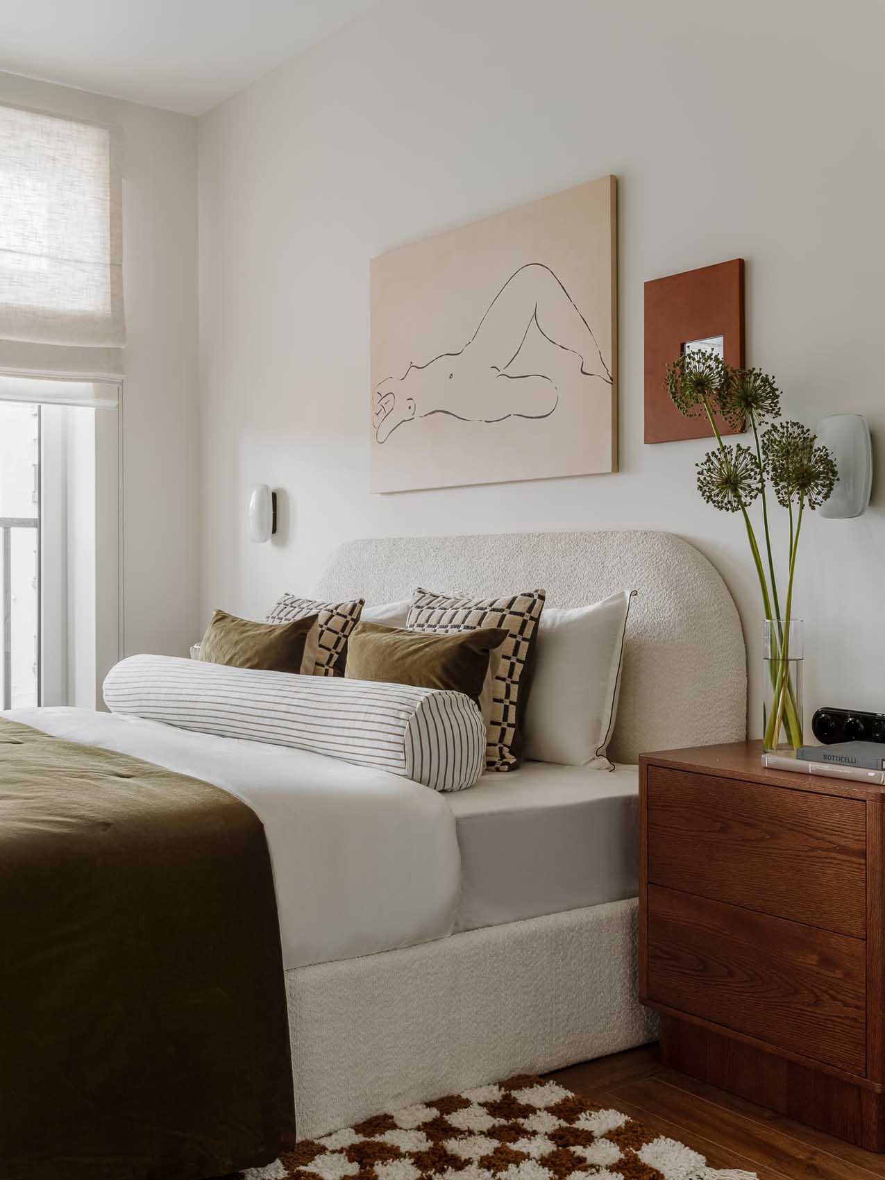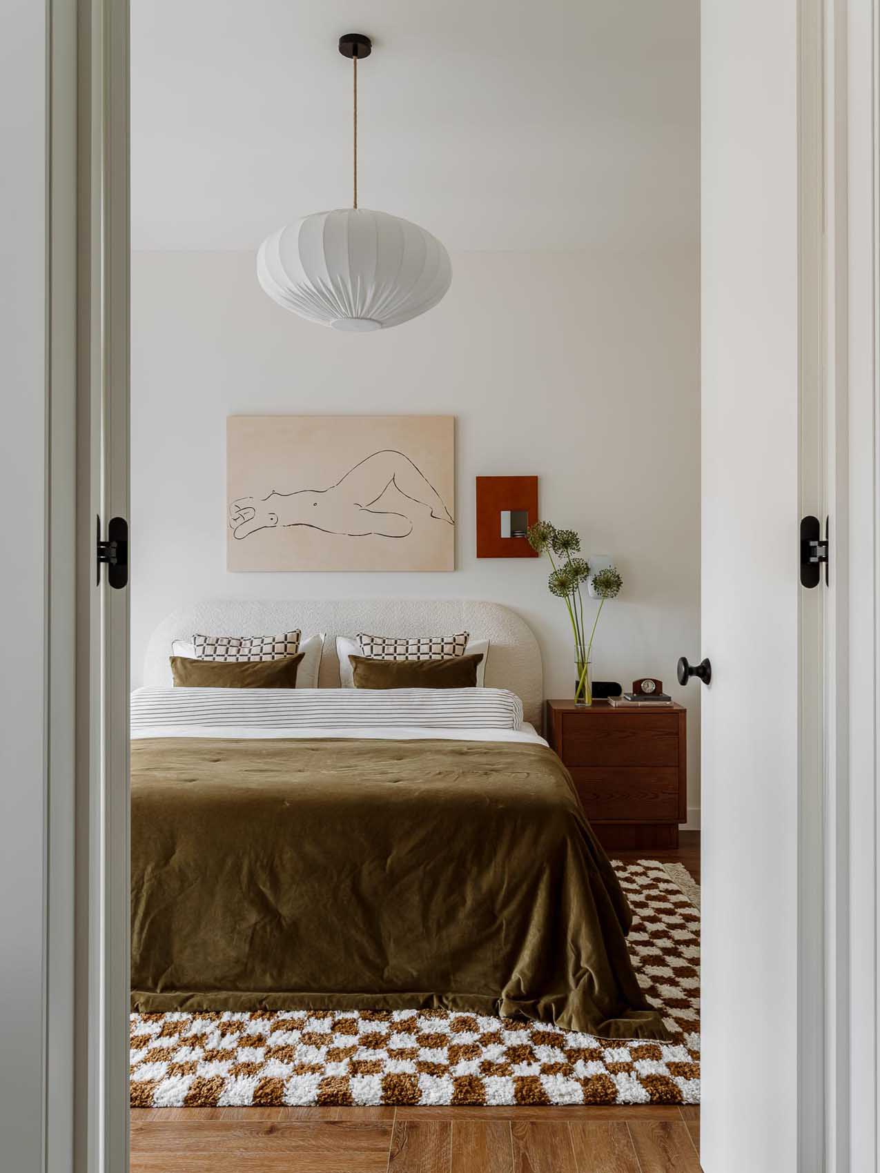 A hálószobában is visszaköszön a furnér meleg textúrája: az ágy felett egy ugyanabból az anyagból készült, egyedileg gyártott tükörkeret lóg.
