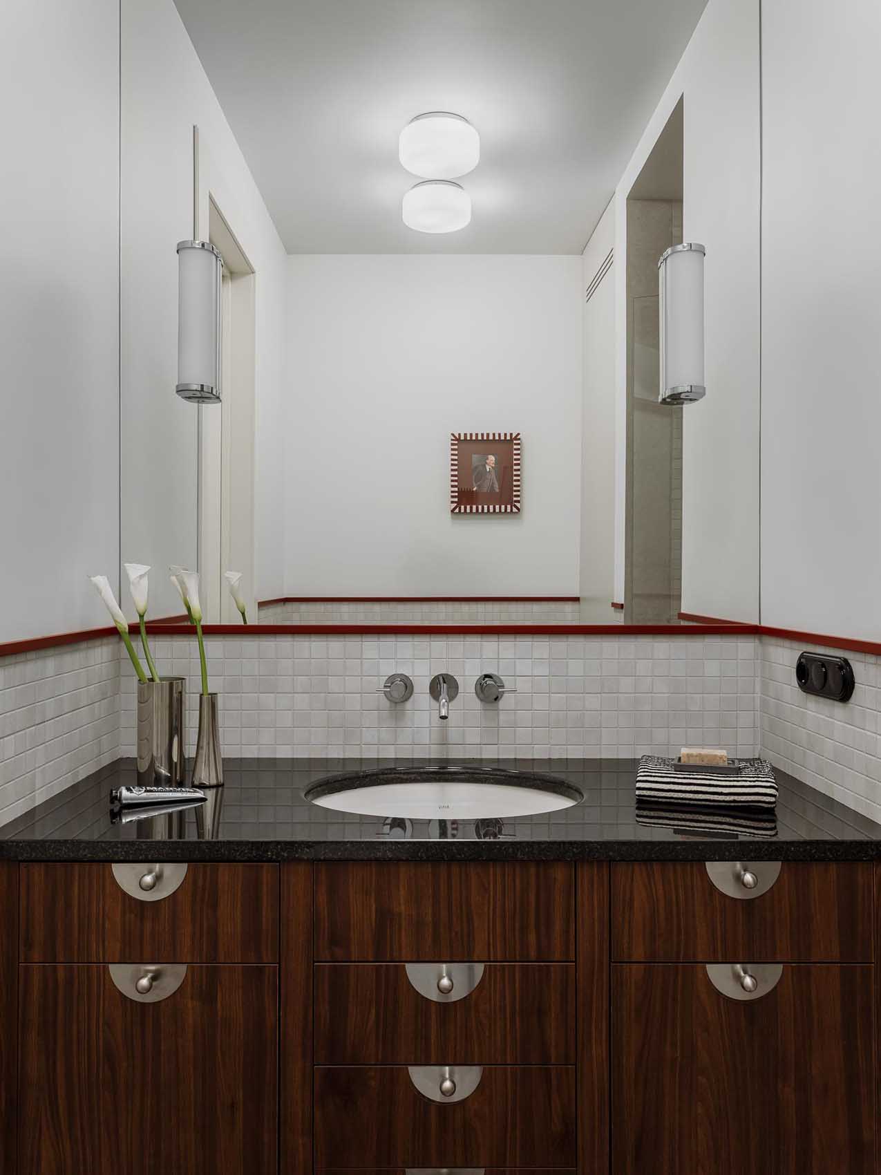 A fürdőszoba váratlan színfoltja egy kisméretű festmény lett – árnyalatai meglepően jól illeszkedtek a projekt színpalettájába. Itt kapott helyet egy mély, szellőztetett beépített szekrény is, amely a mosó- és szárítógépet rejti.