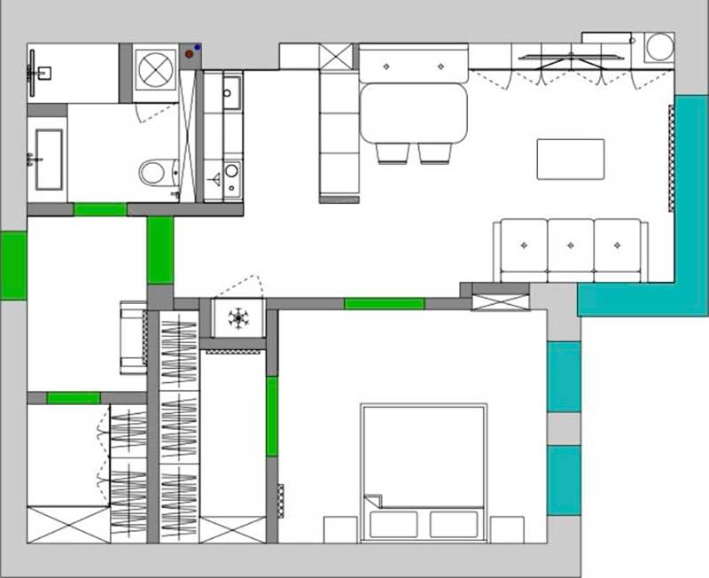 .A kompakt, 63 négyzetméteres területen berendeztek konyha-nappalit, egy hálószobát, két gardróbot és fürdőszobát. A bejáratnál egy háztartási blokk biztosít tárolóhelyet a cipőknek, ruháknak, és magába foglal egy, a háztartási eszközöket rejtő szekrényt is.