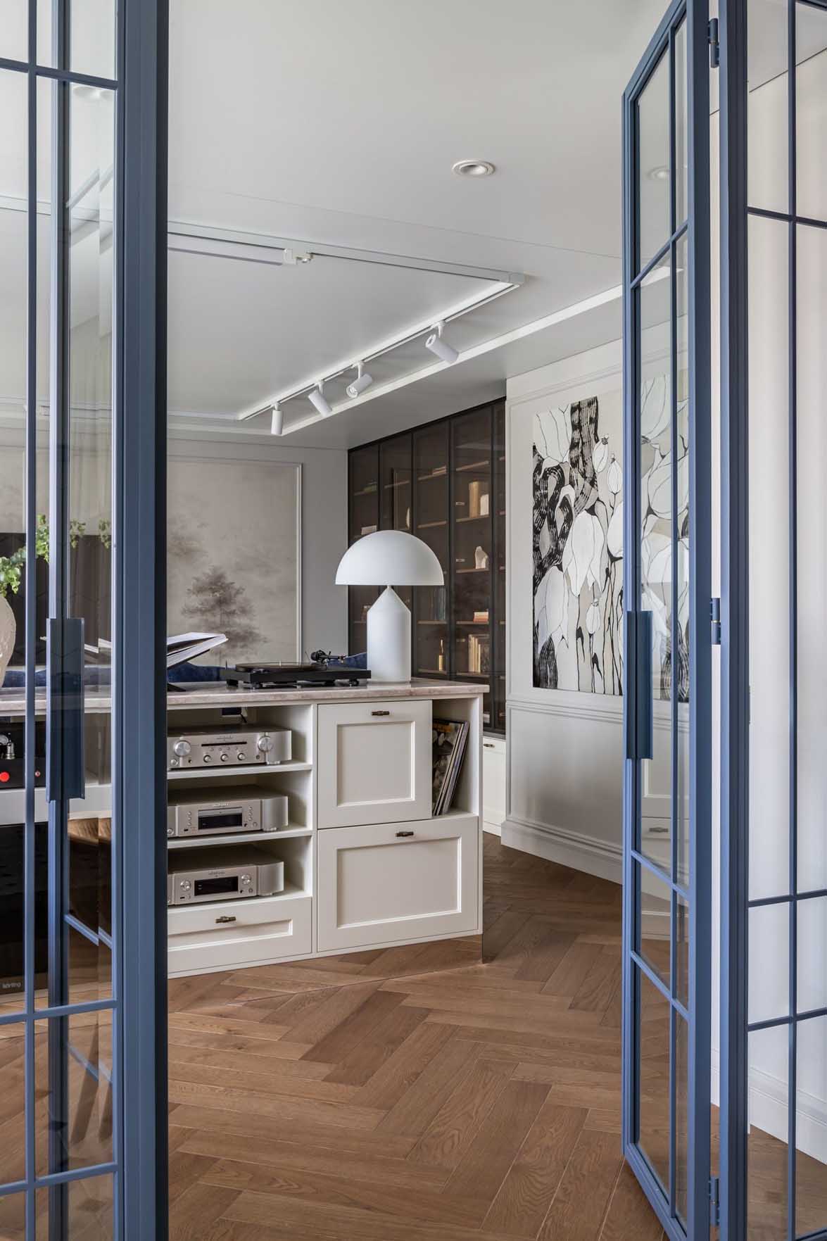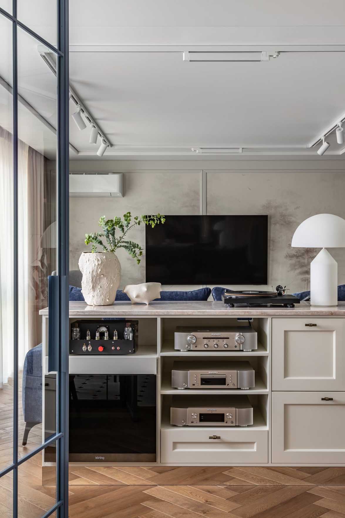 A lakás tervezési koncepciójának egyik legfontosabb eleme a kifejezetten a megrendelő igényeire szabott Hi-Fi médiakonzol volt. Ez a bútordarab nem csupán tároló, hanem technikai központ is: helyet kapott benne a csöves erősítő, a lemezjátszó, a bakelitgyűjtemény, sőt egy borhűtő is. A tervező különös figyelmet fordított a kábelmenedzsmentre; a hangfalakhoz futó vezetékeket már a szerkezetkész állapotnál a falba és a padlóba rejtették, így a látvány makulátlan maradt.